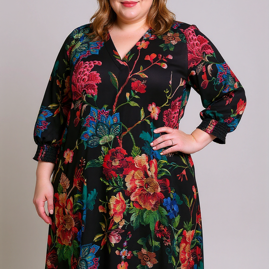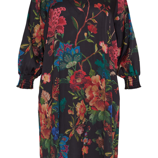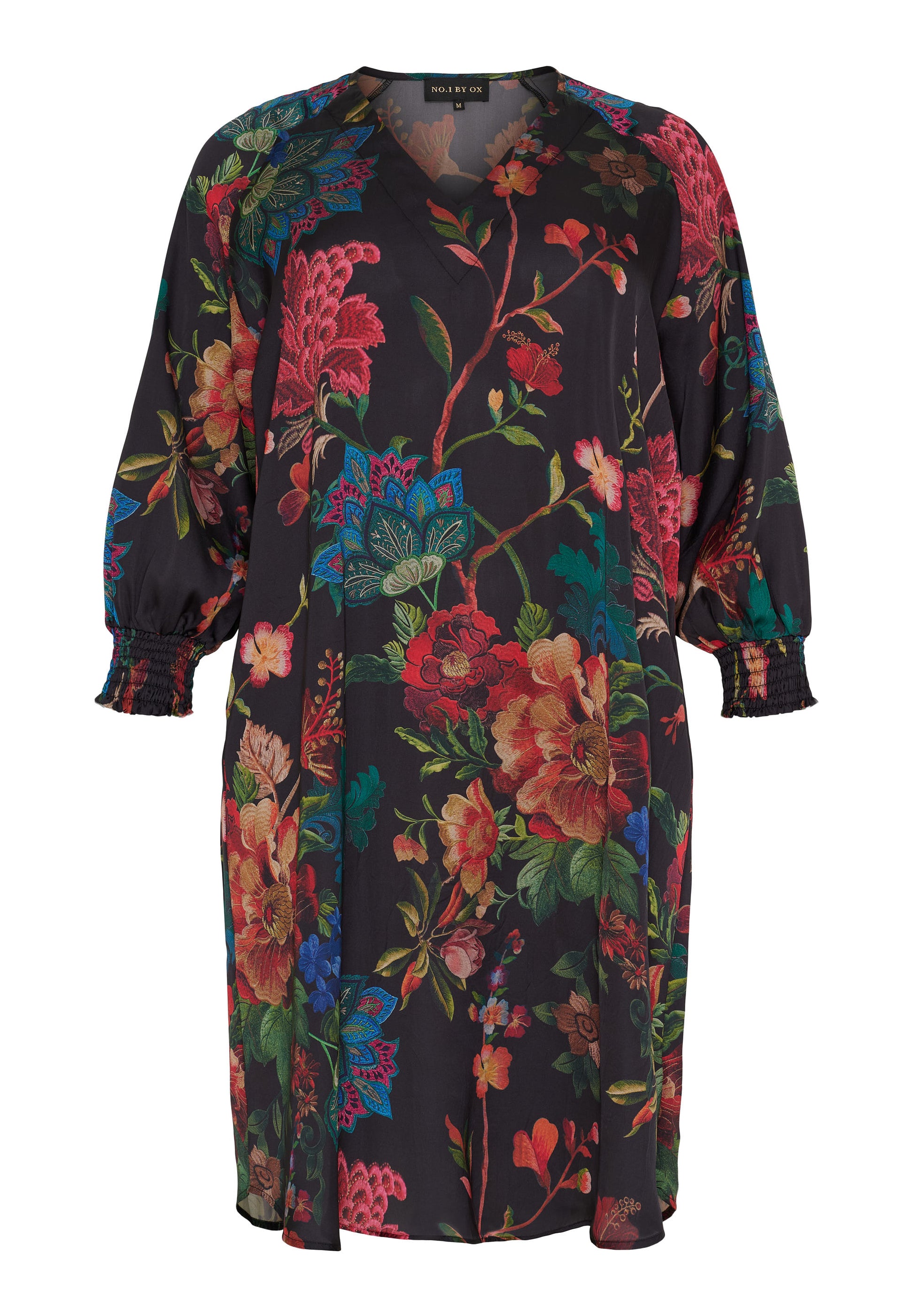 Tilføj et strejf af klassisk elegance til din garderobe med denne smukke kjole fra NO. 1 BY OX. Kjolen er fremstillet i 100% polyester satin, som giver et let og glansfuldt udtryk. Det farverige blomsterprint på sort bund kombineret med regulær pasform gør kjolen til et oplagt valg til både hverdag og fest.