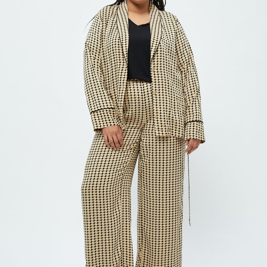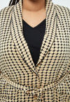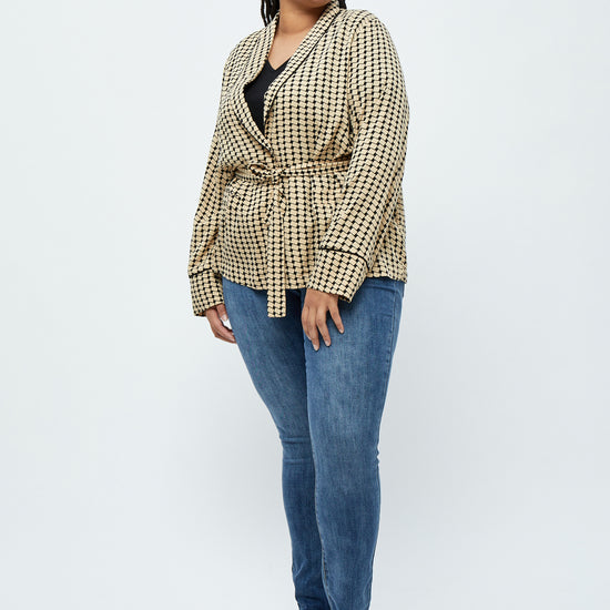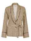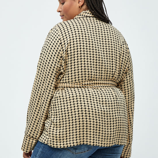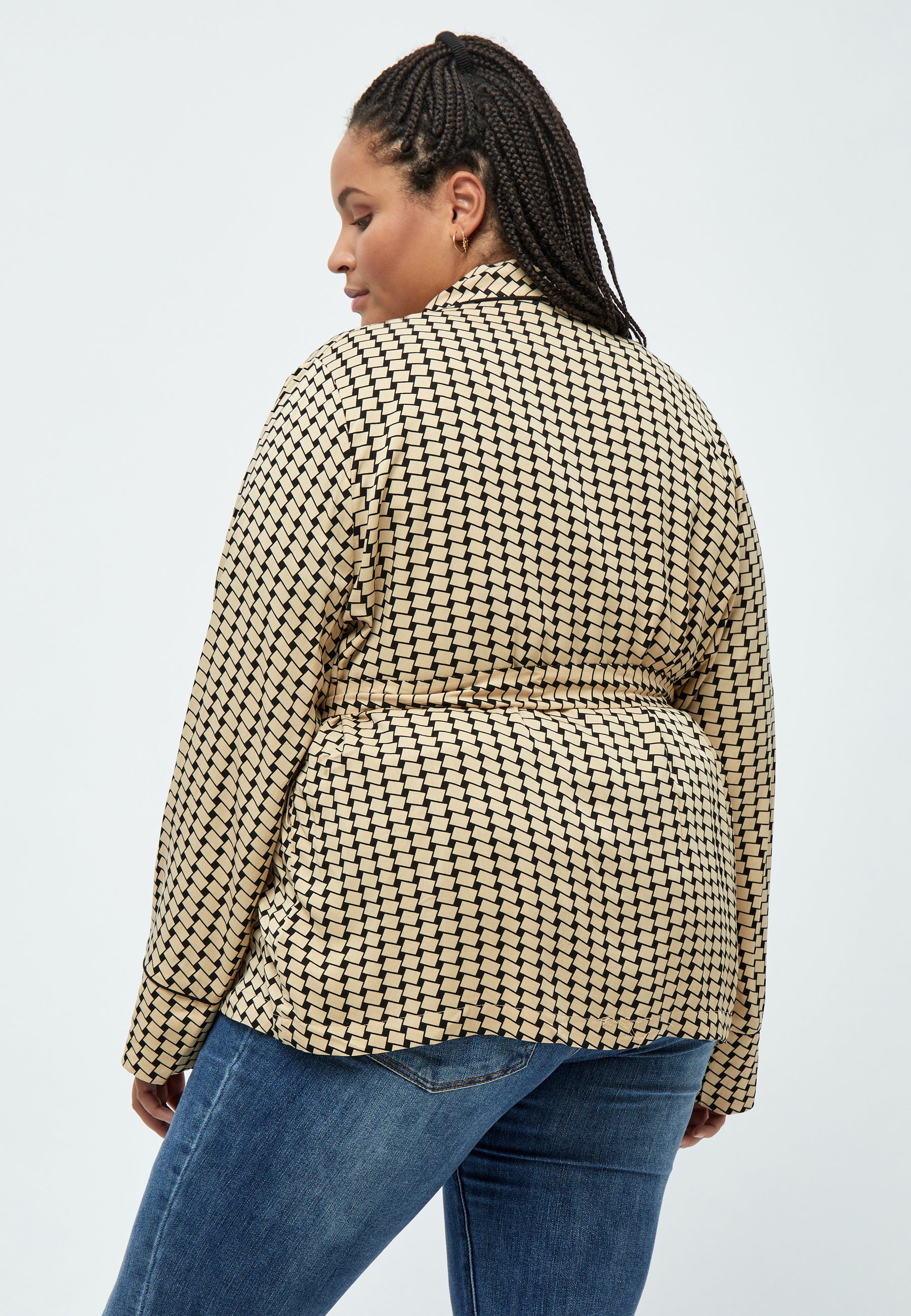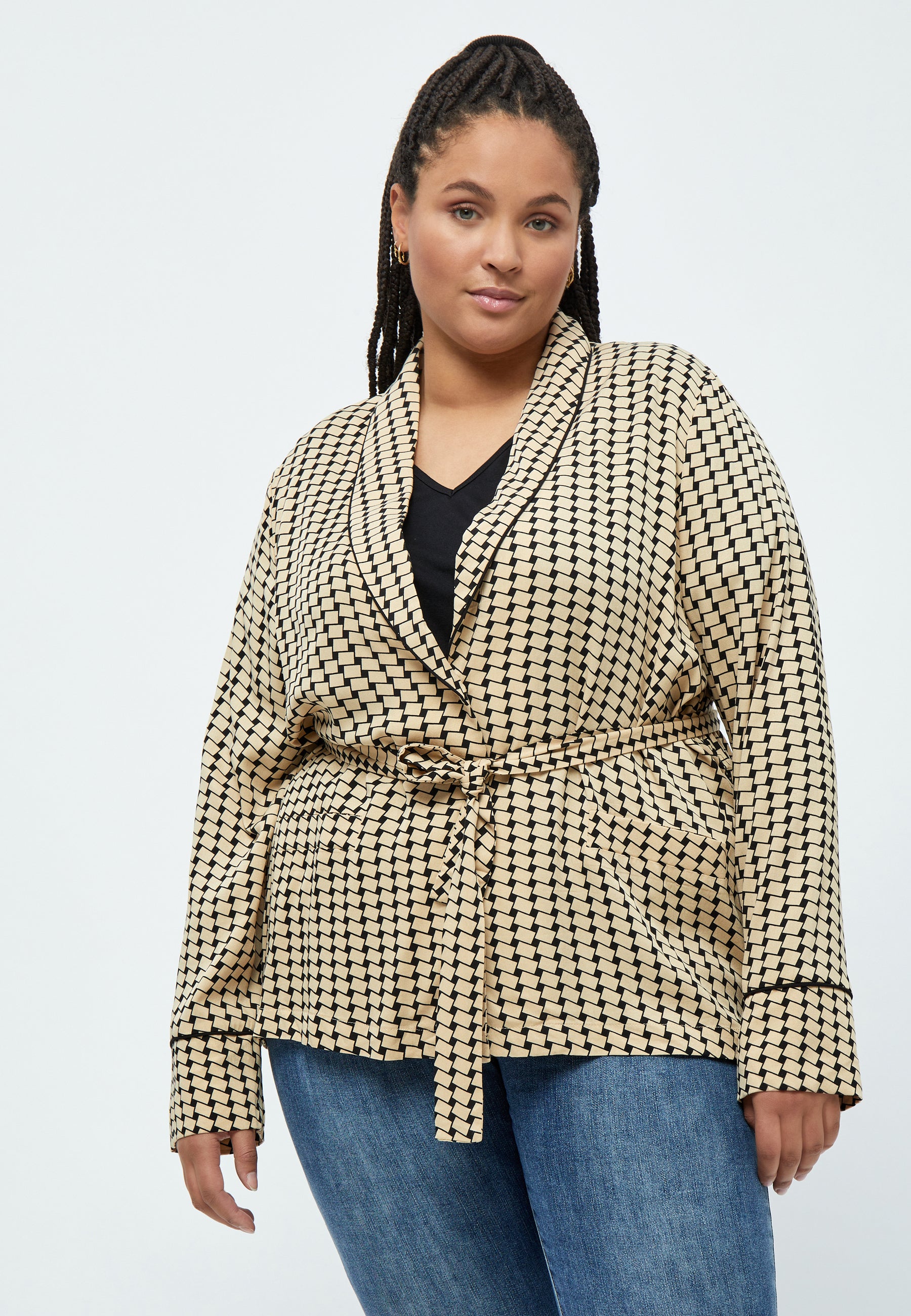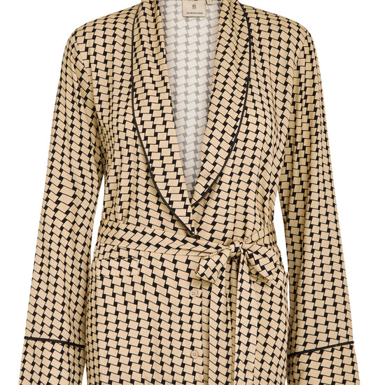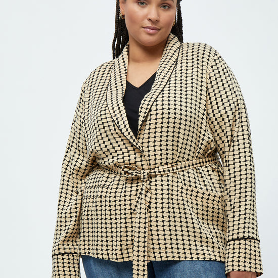 Gør denne jakke til dit næste modekøb og oplev, hvordan den nemt kan styles med både jeans og kjoler for et fuldendt look. Med sin unikke geometriske mønster og varme sandfarver er denne jakke ikke kun en praktisk tilføjelse til din garderobe, men også et statement piece.