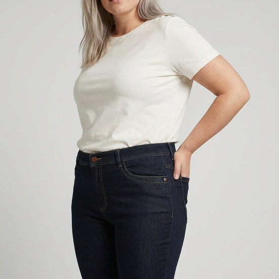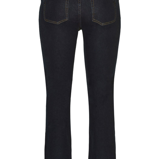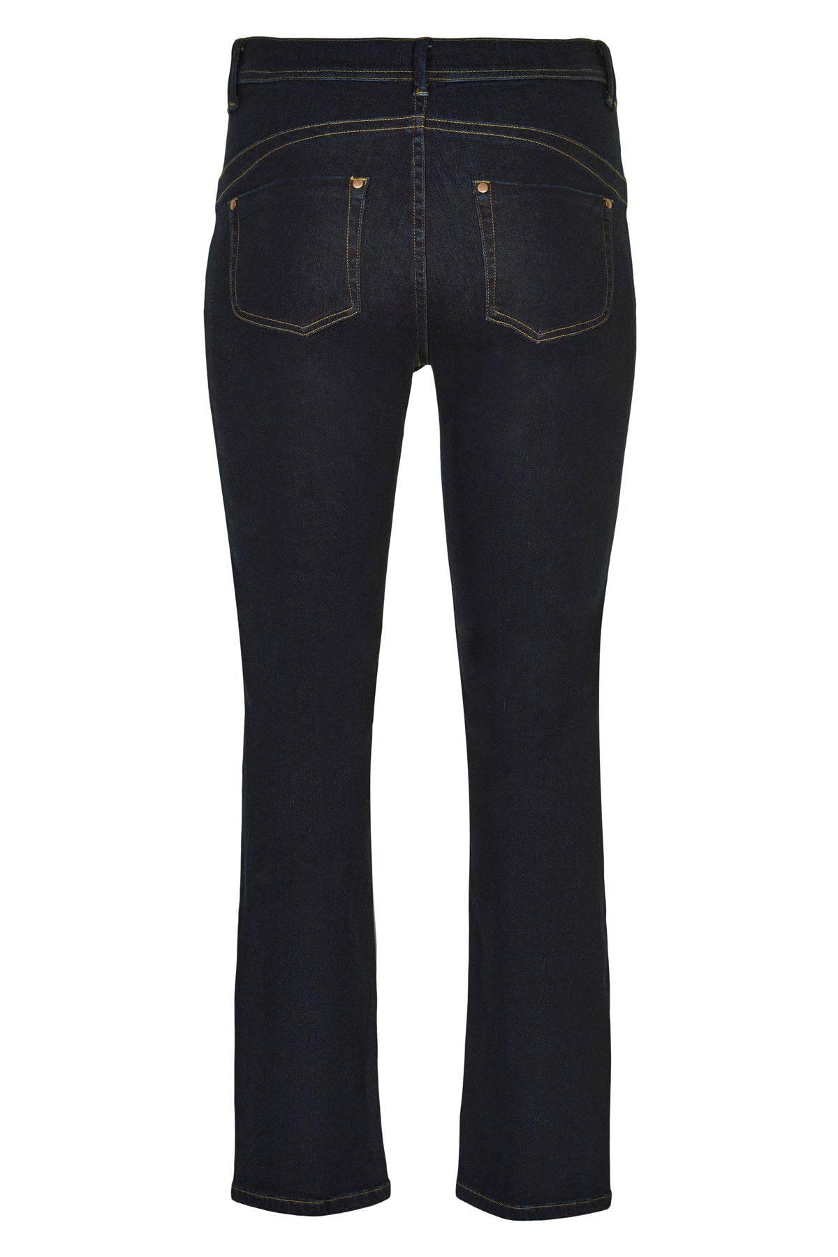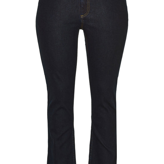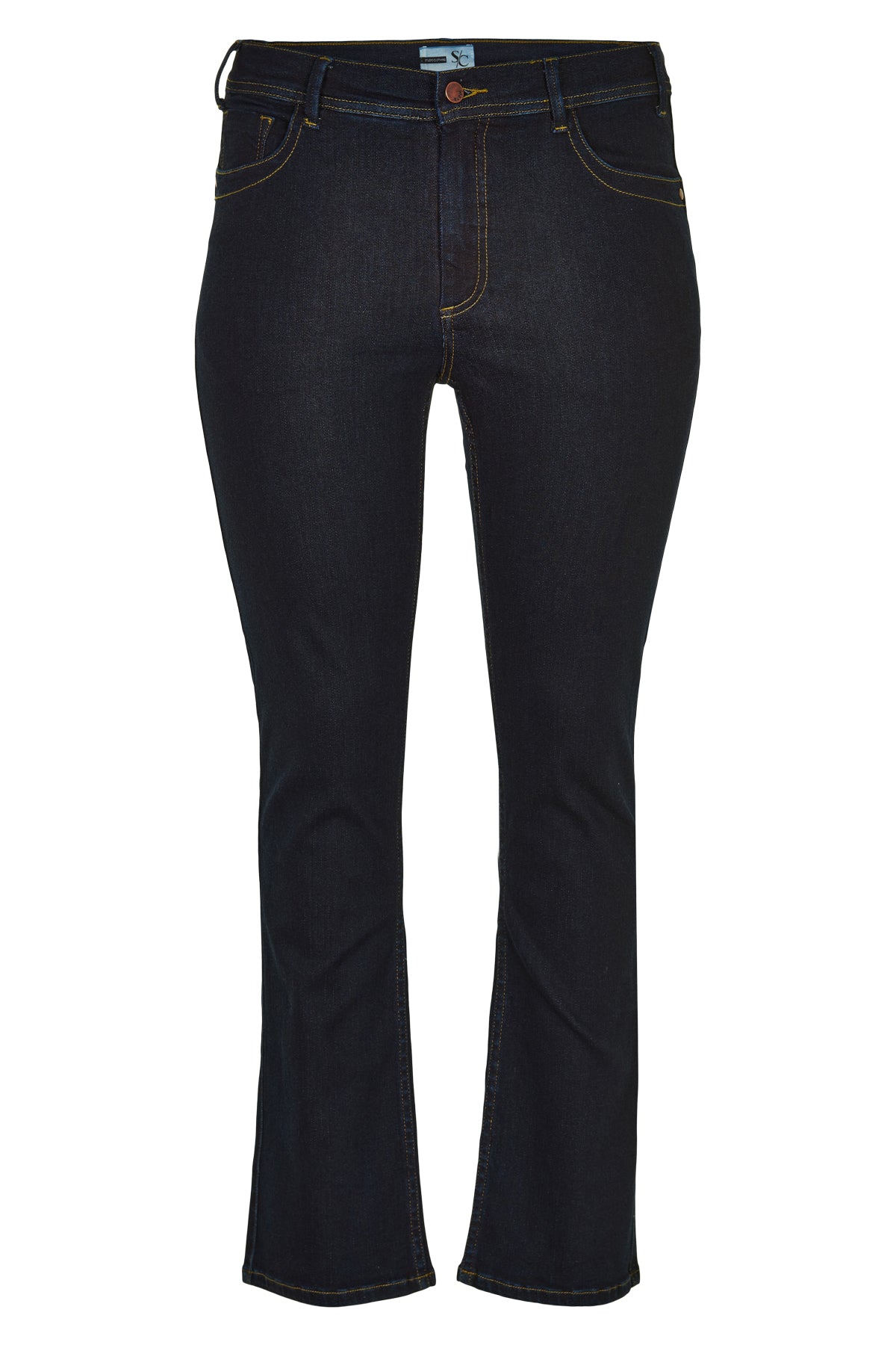Disse flotte bukser er designet i en dyb mørkeblå farve, der giver et tidløst og alsidigt udtryk til din garderobe. De gyldne kontrastsyninger fremhæver de klassiske detaljer omkring lommerne og linningen, hvilket skaber et autentisk denimlook. Modellen har bæltestropper samt knap- og lynlåslukning, så du får både funktionalitet og stil i ét par velsiddende jeans i plus size.