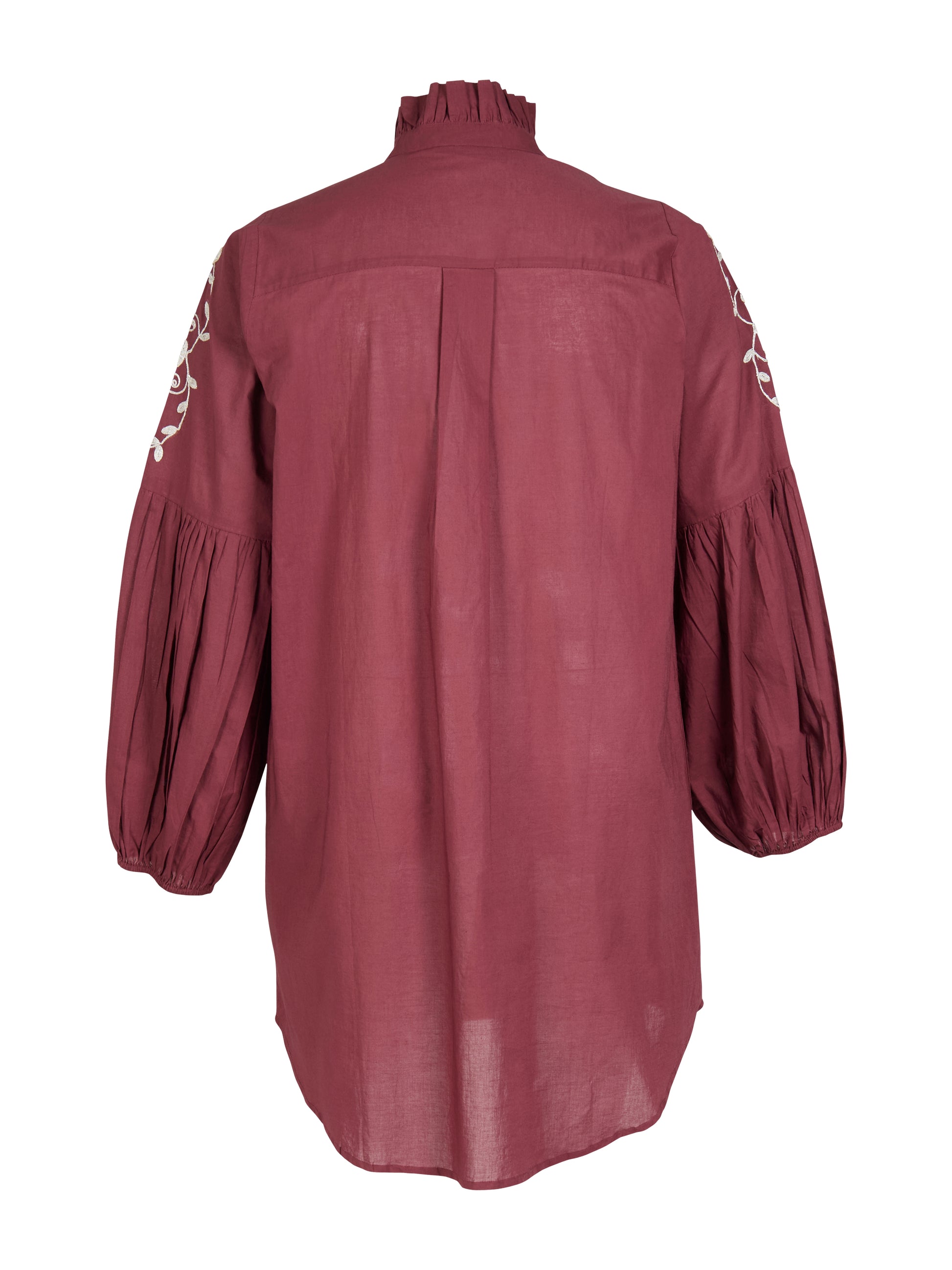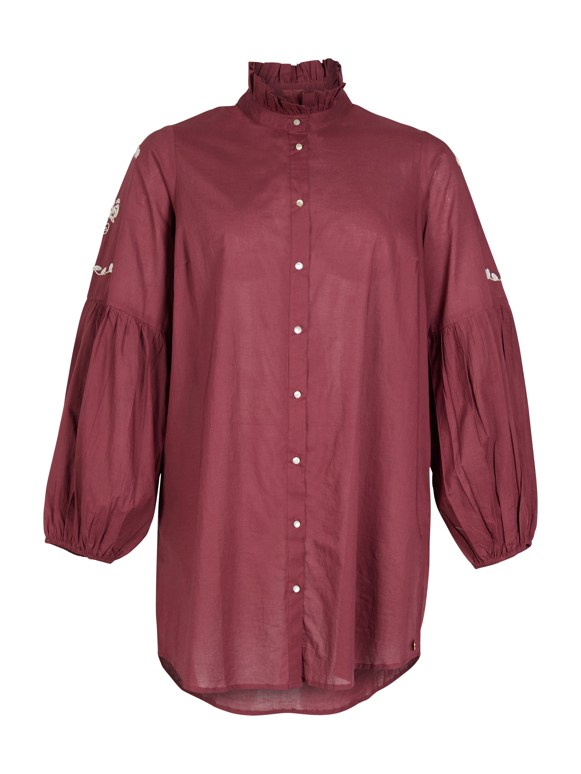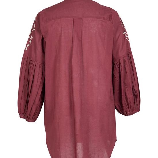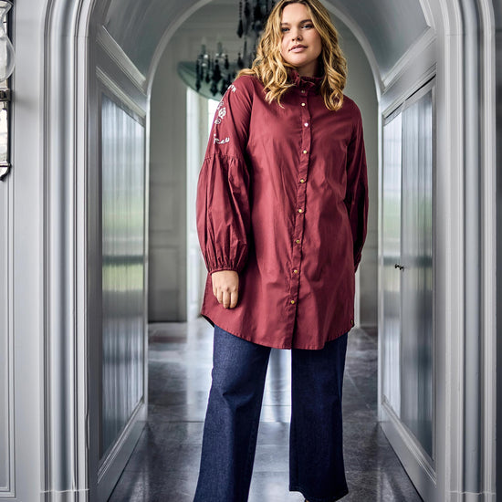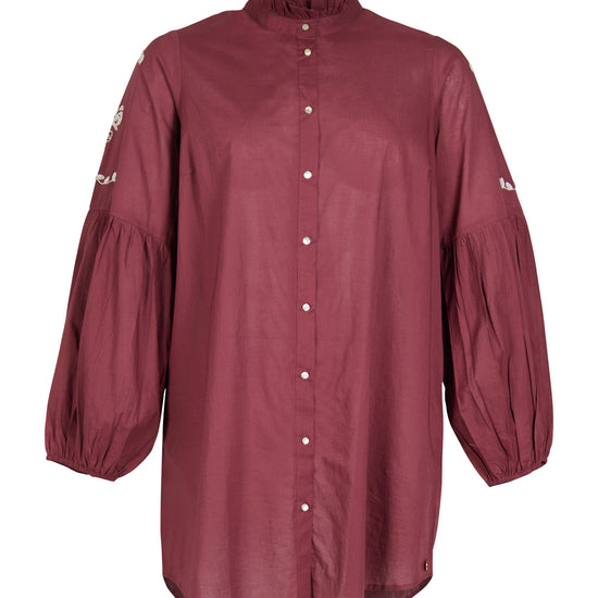 Denne smukke overdel fanger straks øjet med sin dybe røde farve og de fine broderede blomsterdetaljer, der pryder ærmerne. Modellen er designet med en lille flæsekant i halsen og gennemgående guldknapper, der tilføjer et eksklusivt touch til det klassiske look fra ZOEY. De lange ærmer har en let ballon-effekt ved manchetterne, hvilket skaber en moderne silhuet med masser af personlighed.