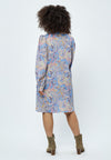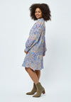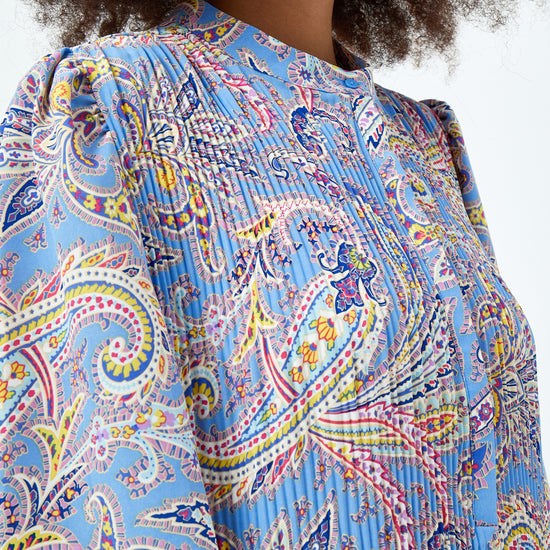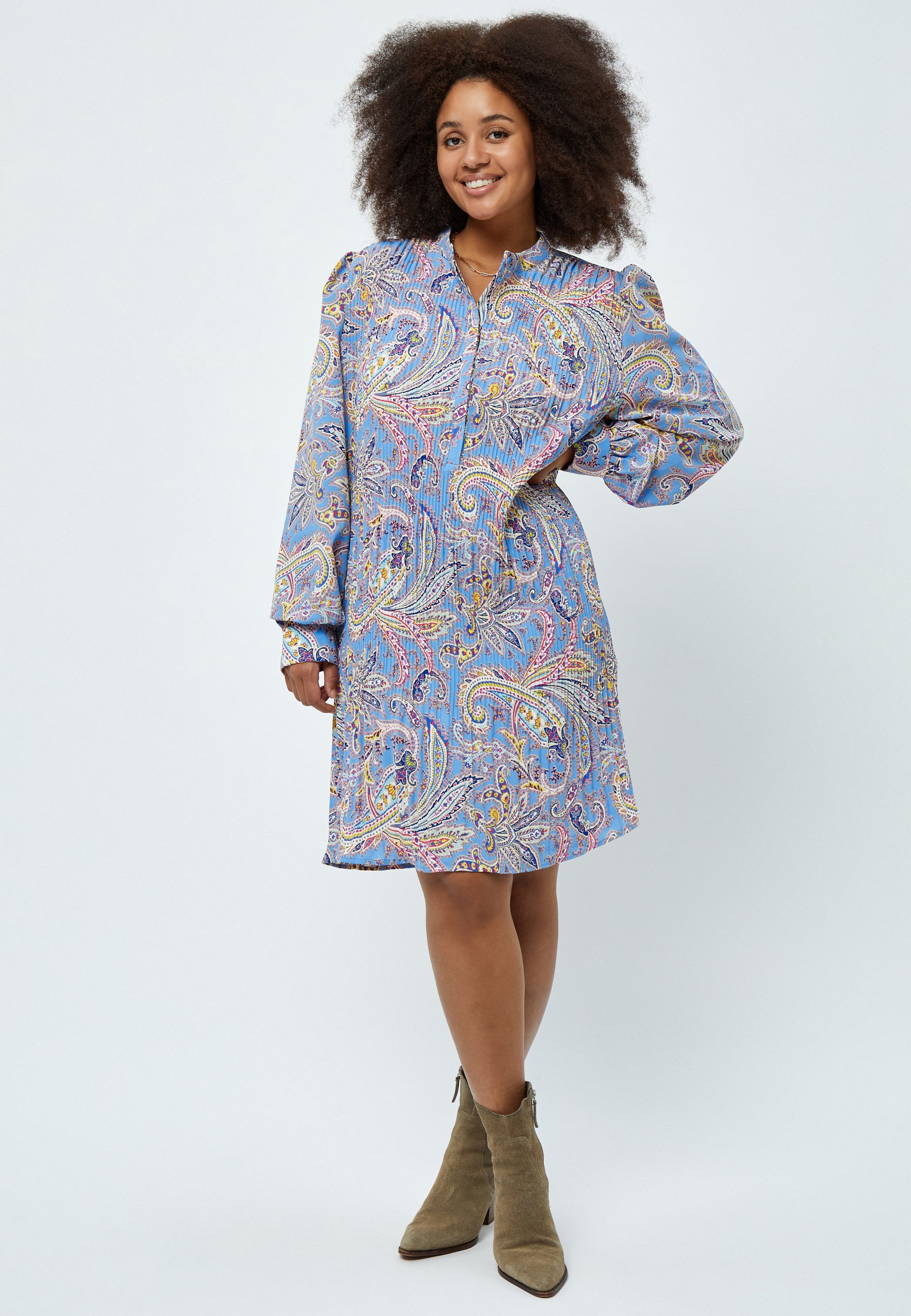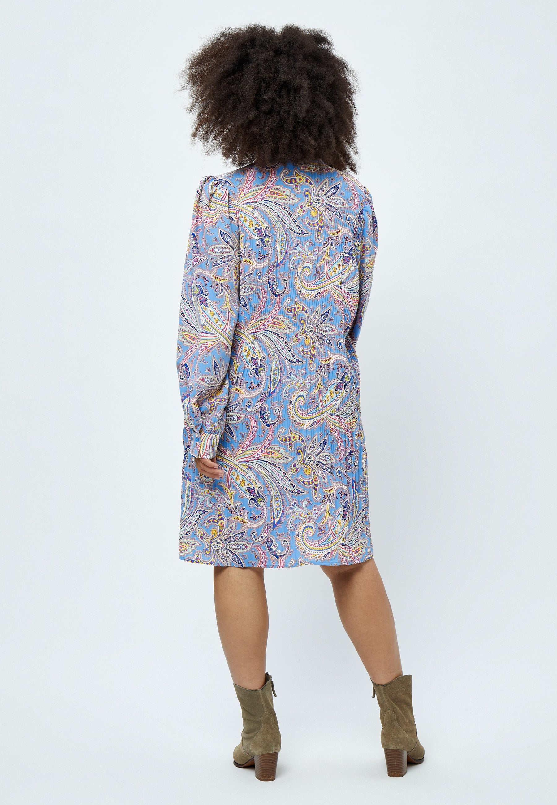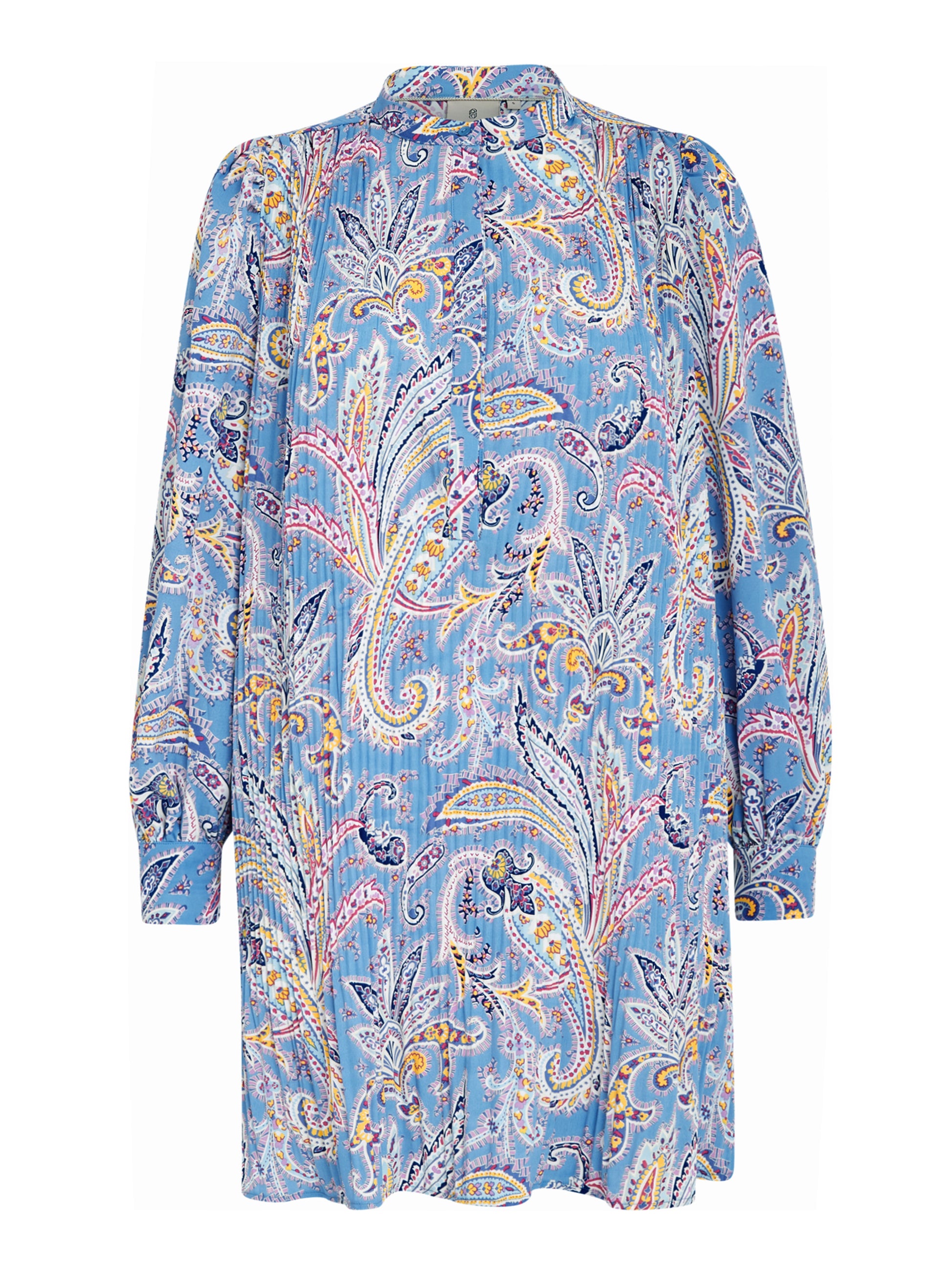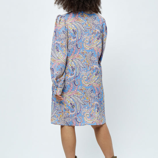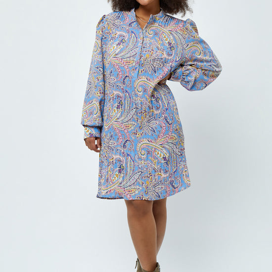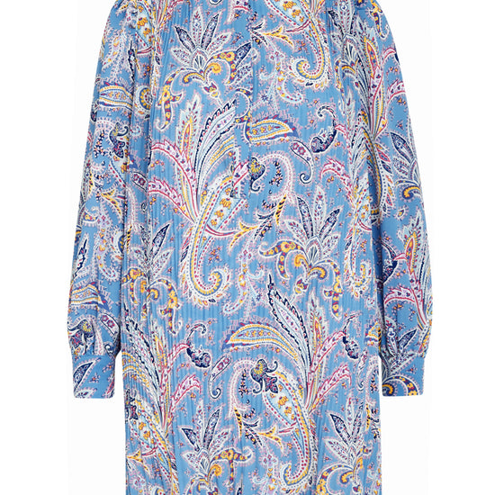 Den iøjnefaldende paisley-mønster i nuancer af blå, pink, gul og beige giver kjolen et livligt og kunstnerisk præg. Detaljer som lange ærmer med puffede skuldre og en klassisk skjortekrave tilføjer et element af formel elegance til det afslappede design.