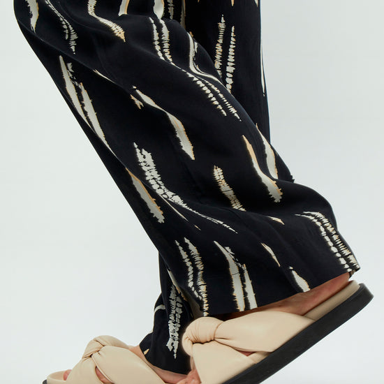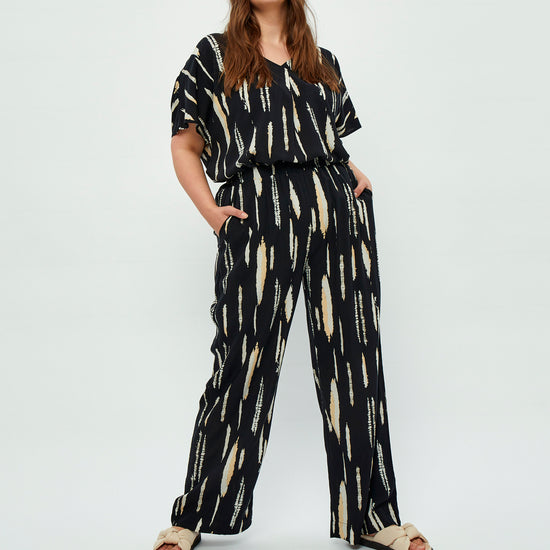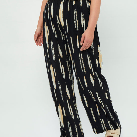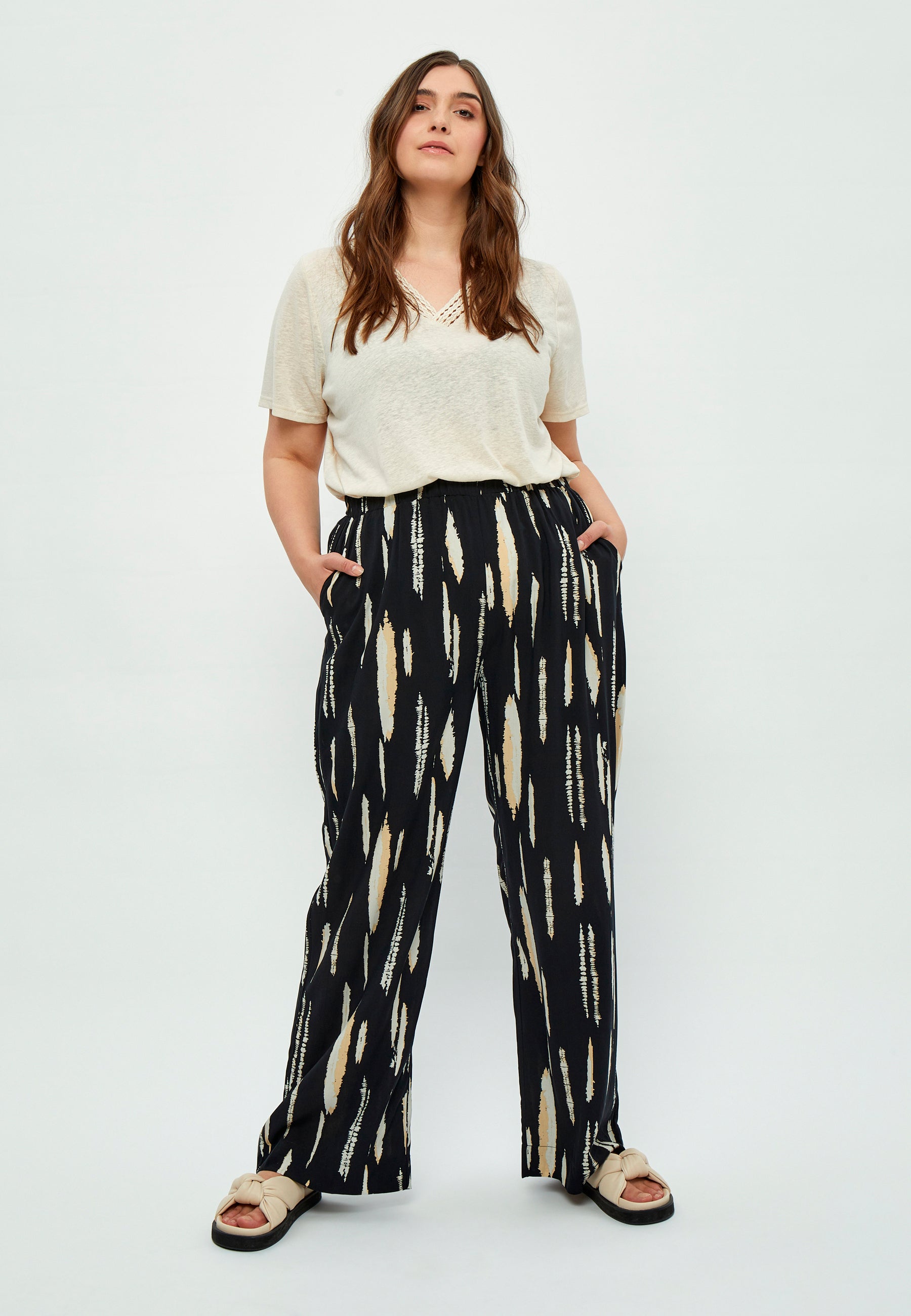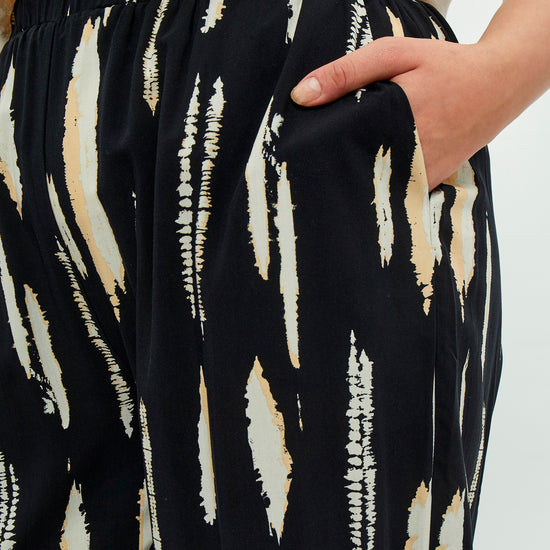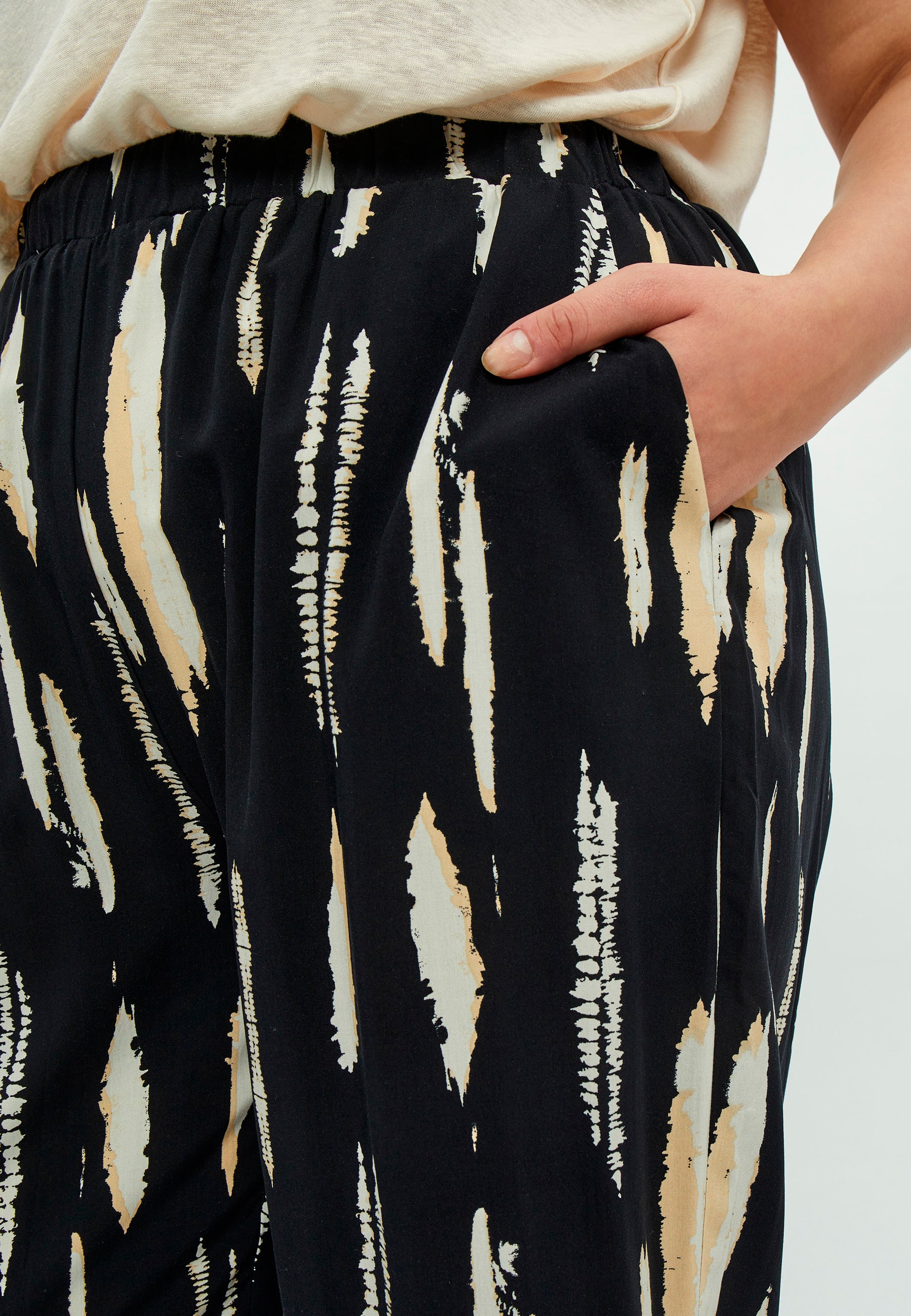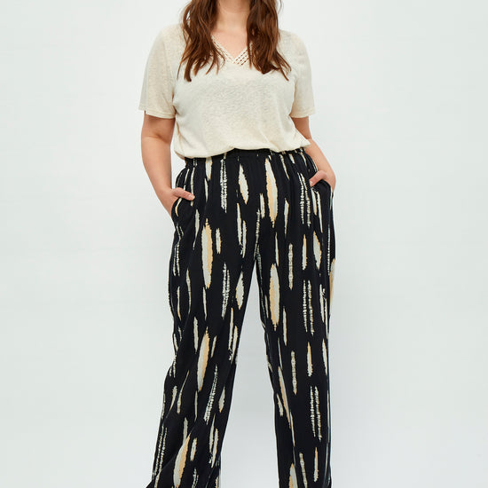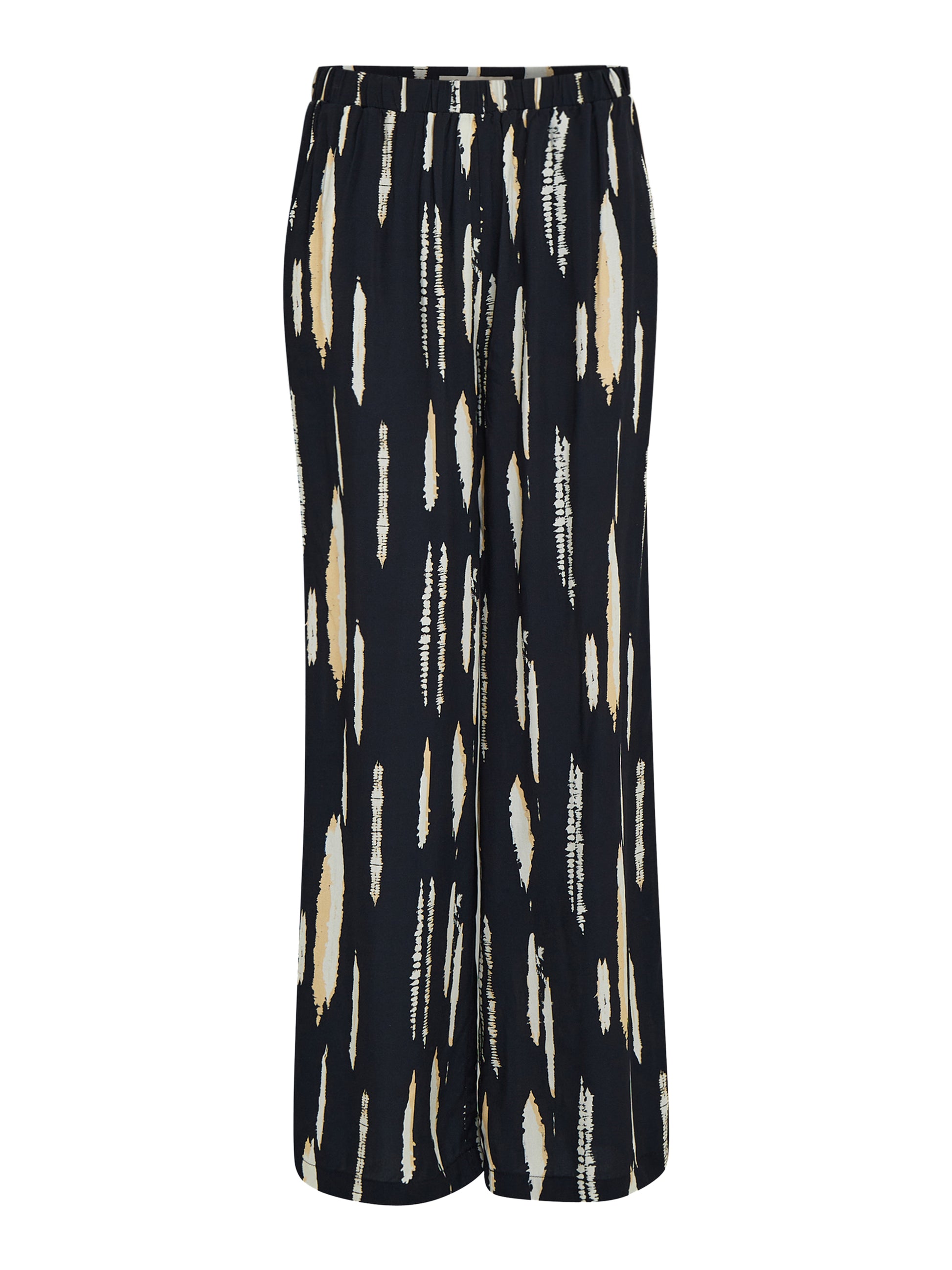 Disse bukser fra Peppercorn kombinerer moderne stil med komfort. Designet i et elegant "Warm Sand Print" tilbyder de en unik og kunstnerisk æstetik, der gør dem perfekte til både hverdag og festlige lejligheder. De er fremstillet af 100% LENZING™ ECOVERO™ viskose, hvilket sikrer en blød og let fornemmelse mod huden.