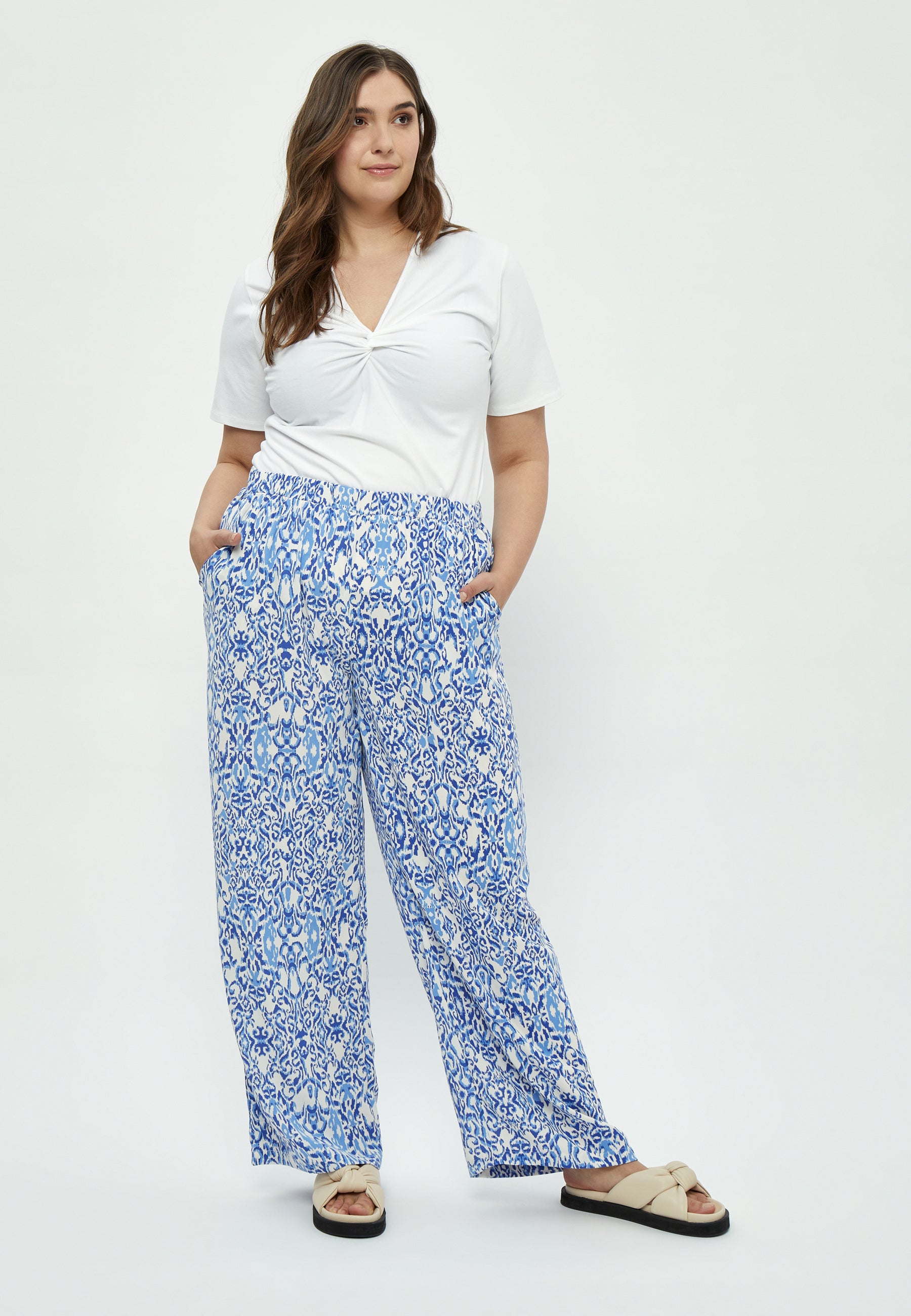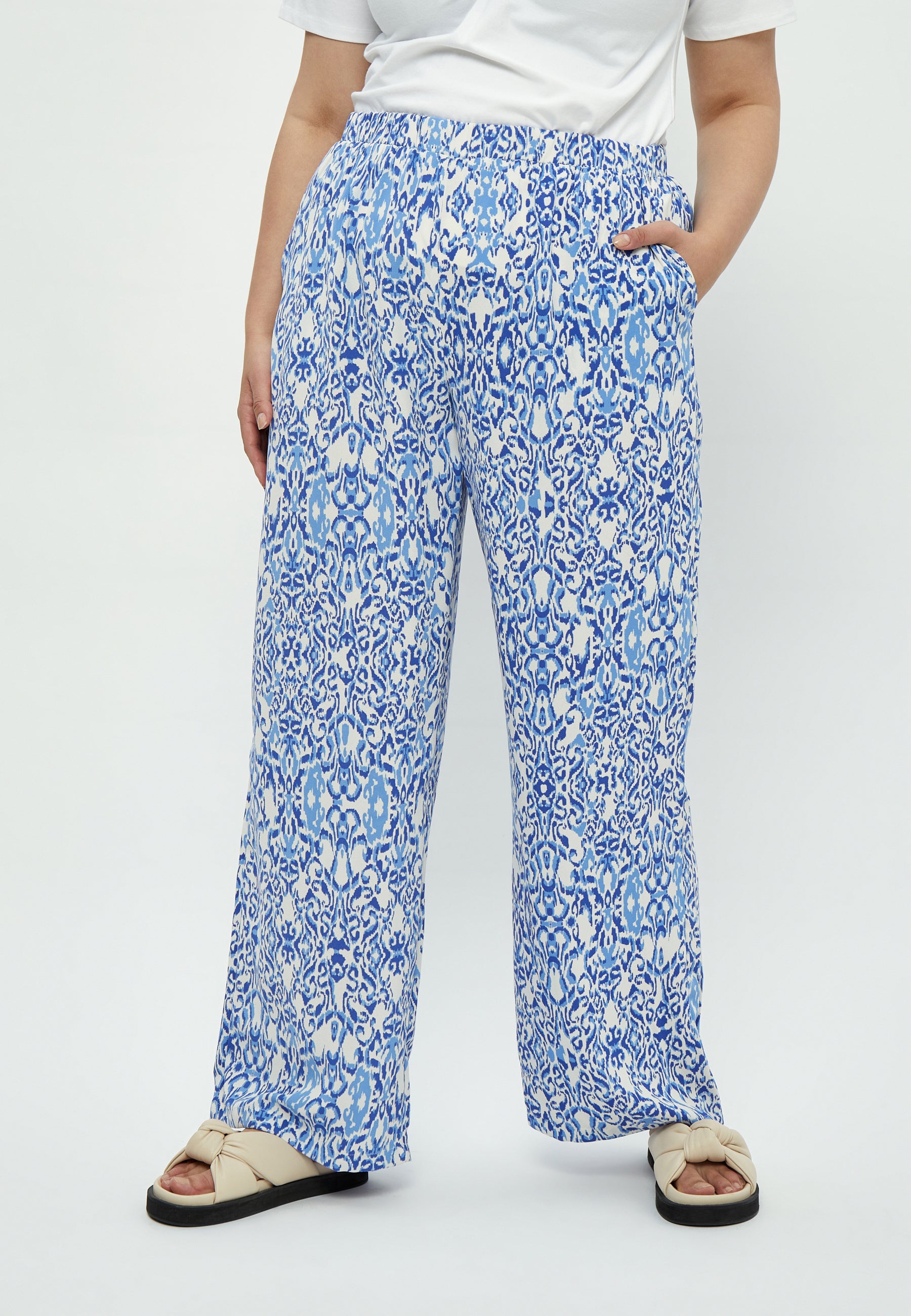 Oplev en perfekt kombination af stil og komfort med Peppercorns Marina Blue Print bukser. Disse bukser er lavet af 100% genanvendt polyester, hvilket sikrer en let og behagelig pasform. Det smukke blå og hvide mønster i marina-stil skaber et elegant udtryk, der passer til enhver lejlighed.