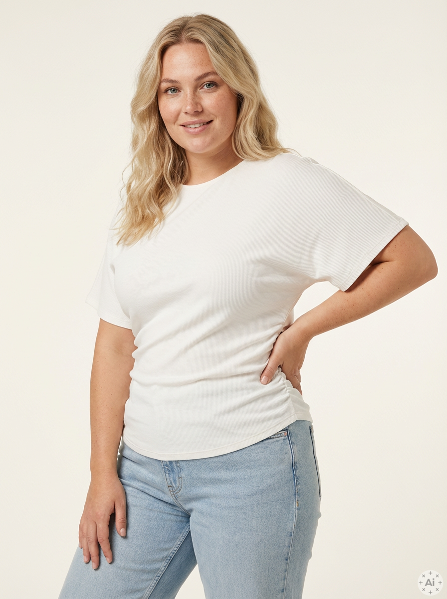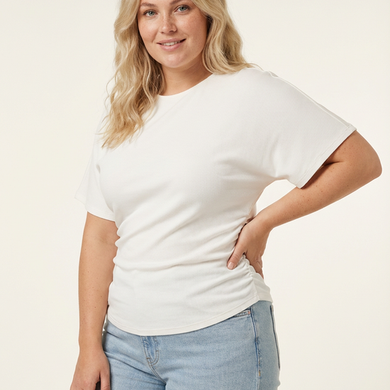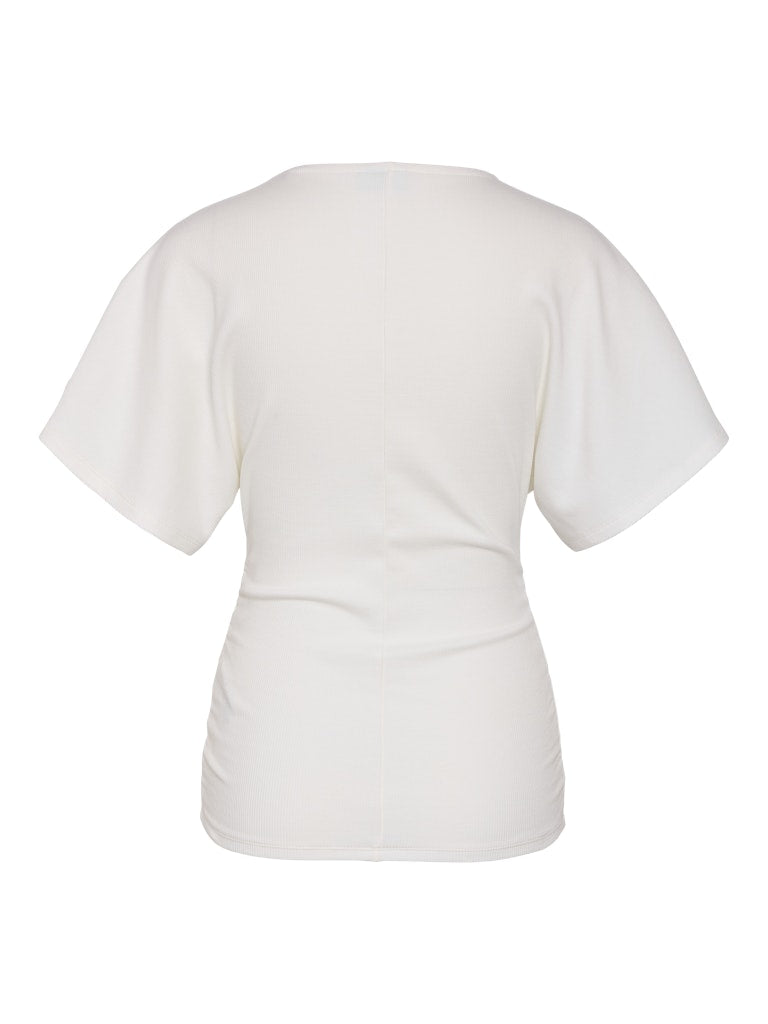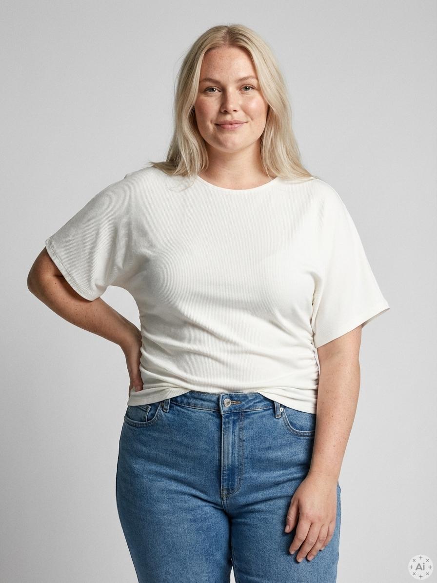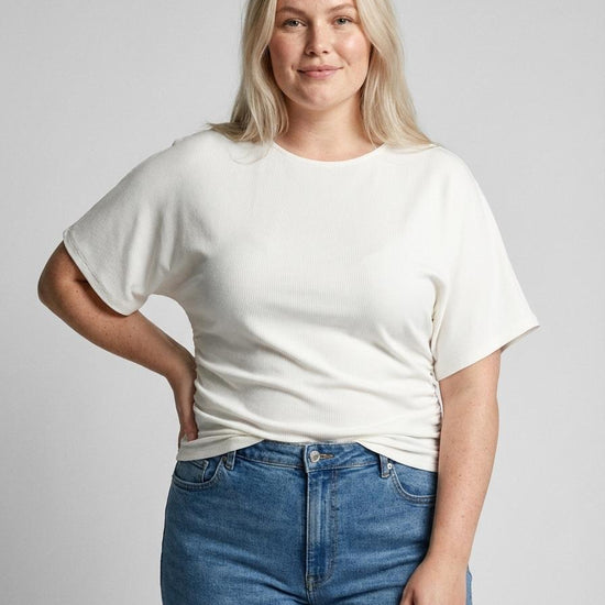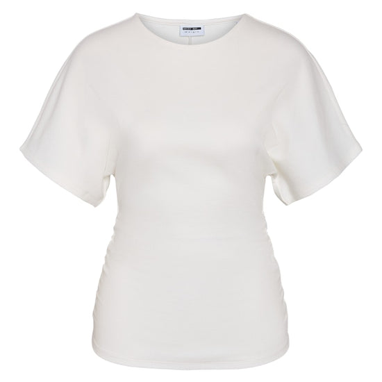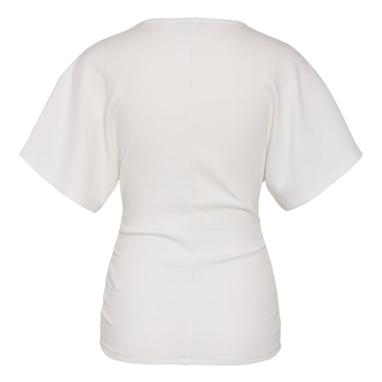 De smarte rynkeeffekter langs siderne skaber en tætsiddende pasform omkring livet, der fremhæver dine kurver på en smagfuld måde. Denne top er ideel til at kombinere med et par rå jeans for et moderne hverdagslook. Materialet føles behageligt mod huden og sikrer god bevægelsesfrihed hele dagen.
