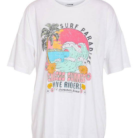 Den lyse hvide farve med et iøjnefaldende grafisk print gør denne T-shirt til en alsidig tilføjelse til din garderobe. Perfekt til dem, der ønsker at udtrykke en afslappet og moderne stil.