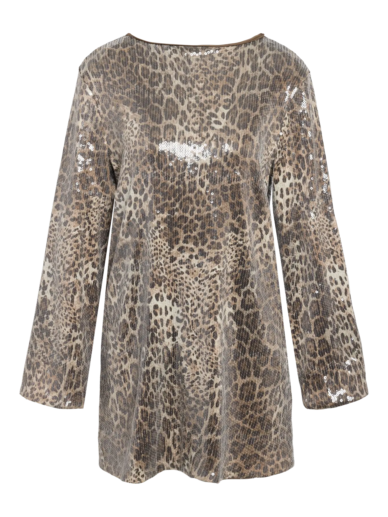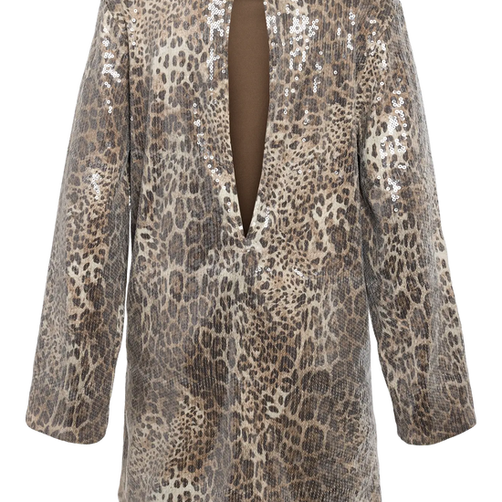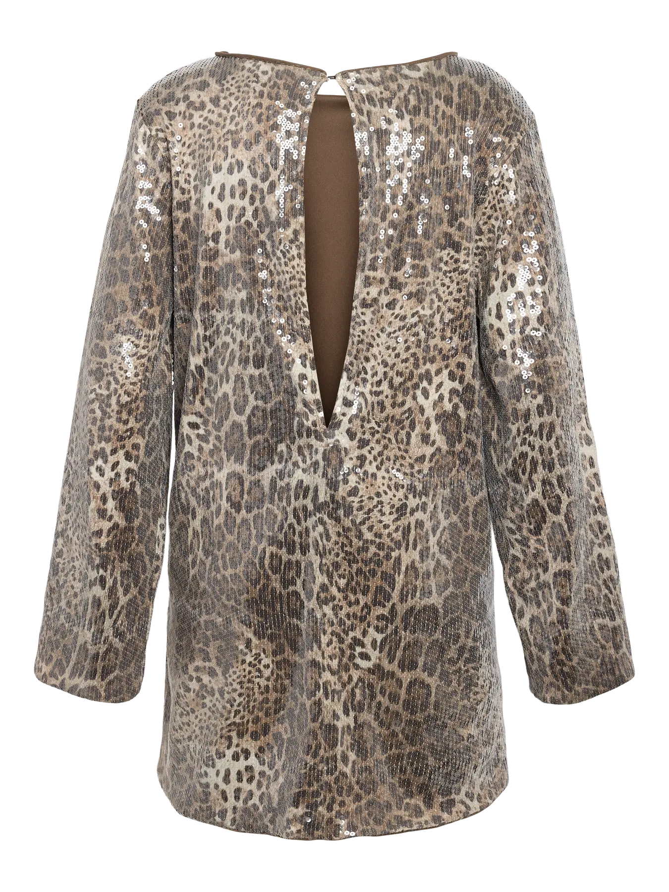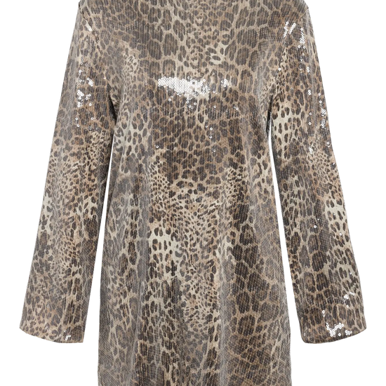 Denne iøjnefaldende kjole i plus size fra Noisy May Curve er skabt til at sætte gang i enhver fest med sit vilde og glamourøse udtryk. Designet byder på et moderne dyreprint i varme brune og beige nuancer, der er dækket af små pailletter for en fantastisk lyseffekt, når du bevæger dig. Kjolen har lange ærmer og en klædelig rund hals, der sikrer et elegant udtryk sammen med den lette figursyning, der giver en flot silhuet.