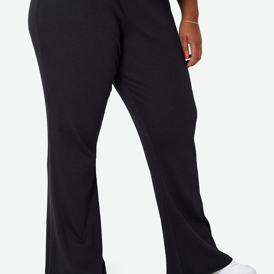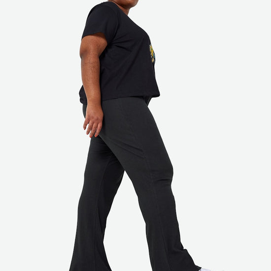 - Pasform: Højtaljet med lige ben og let flare, rummelige i størrelsen