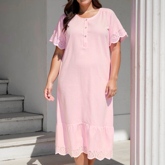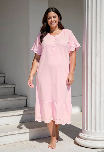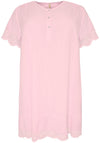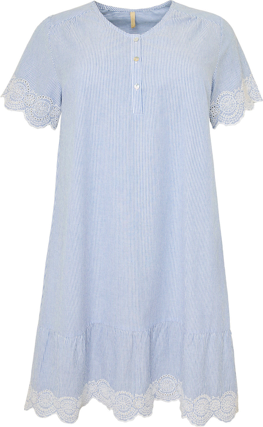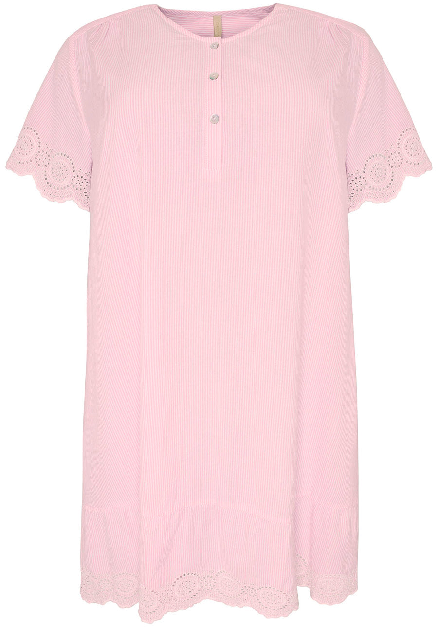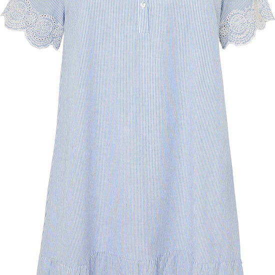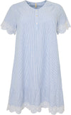 Med sit lette og luftige stof er denne kjole perfekt til både hverdag og festlige sammenkomster. De korte ærmer med blondekanter og den brede flæsekant nederst giver kjolen et romantisk touch. Vælg mellem den delikate rosa nuance eller den friske blå stribede variant for at matche din personlige stil.