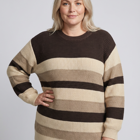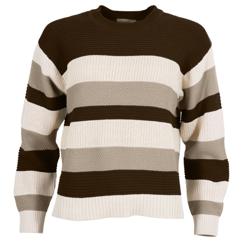 Denne lækre strikbluse fra Cassiopeia er et perfekt valg til en afslappet og stilfuld hverdagsgarderobe. Modellen er designet med brede, vandrette striber i flotte jordnære farver, der giver et roligt og moderne udtryk. Den har en klassisk rund halsudskæring med en fin ribkant, som også gentages ved ærmerne og i bunden for at sikre en god pasform.