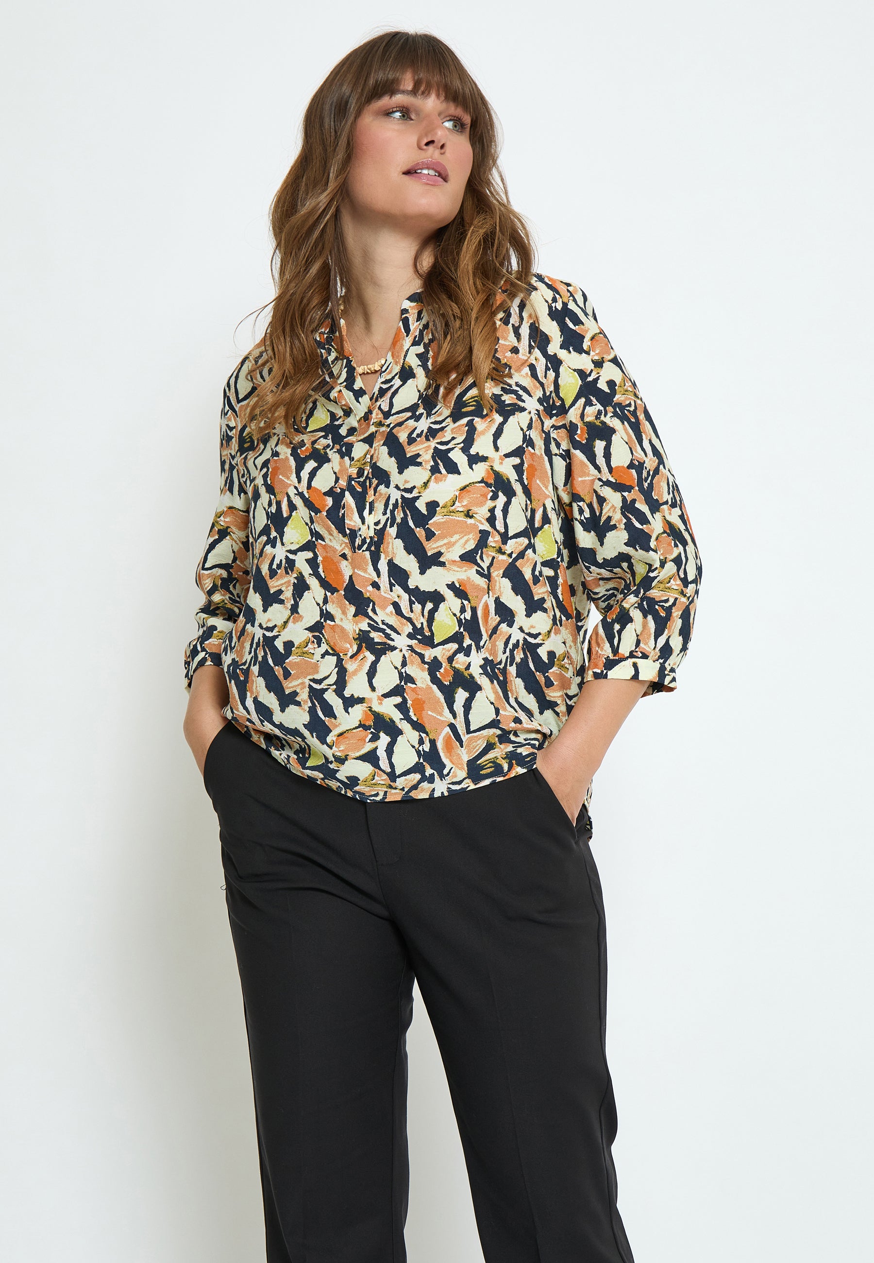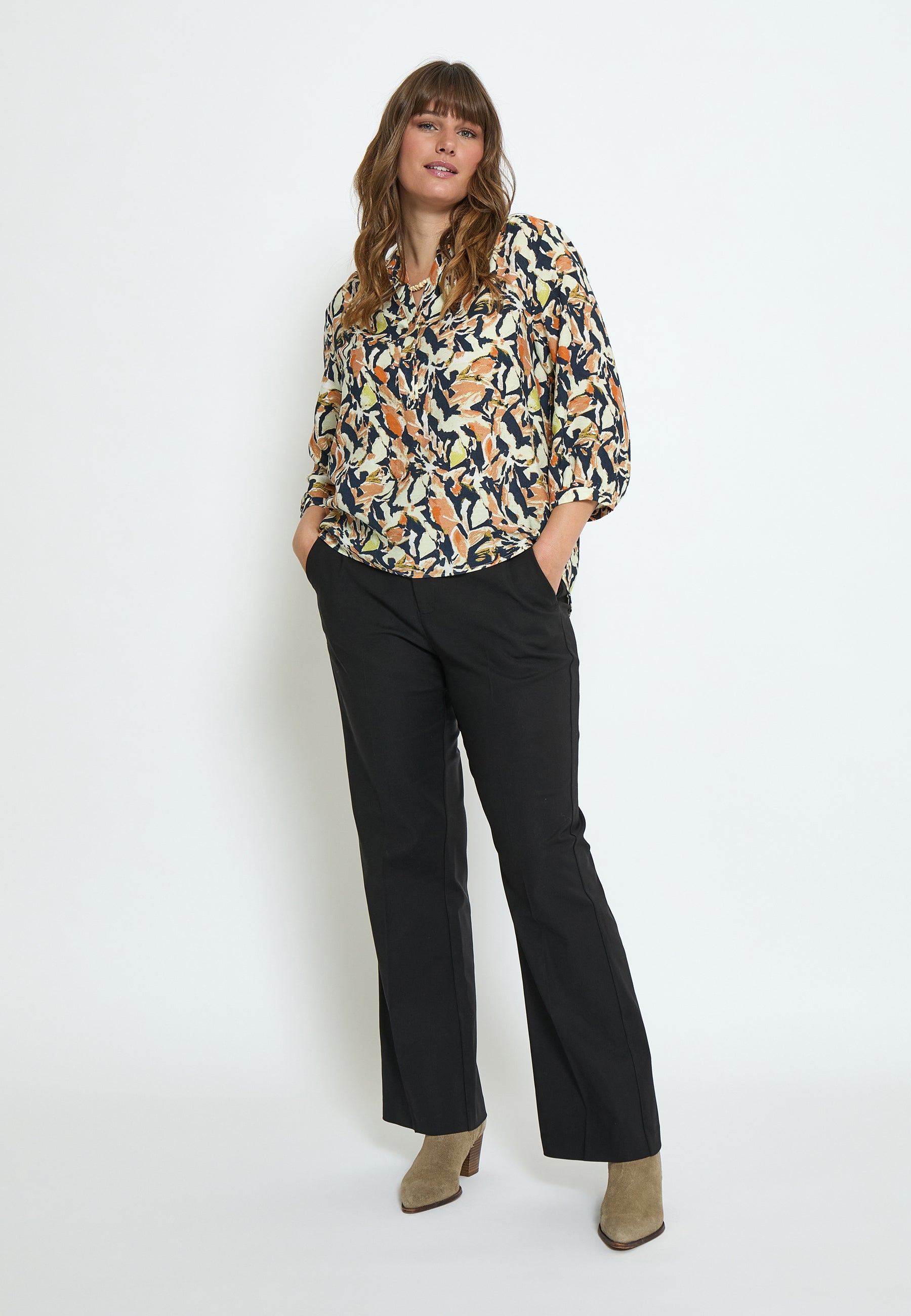 Tilgængelig i størrelserne 44, 46, 48, 50, 52, 54 og 56, passer denne bluse til en bred vifte af kropsformer. Uanset om du kombinerer den med en nederdel eller et par bukser, vil du altid føle dig godt tilpas og stilfuld. Gør denne bluse til en del af din garderobe og oplev, hvordan den kan løfte ethvert outfit.