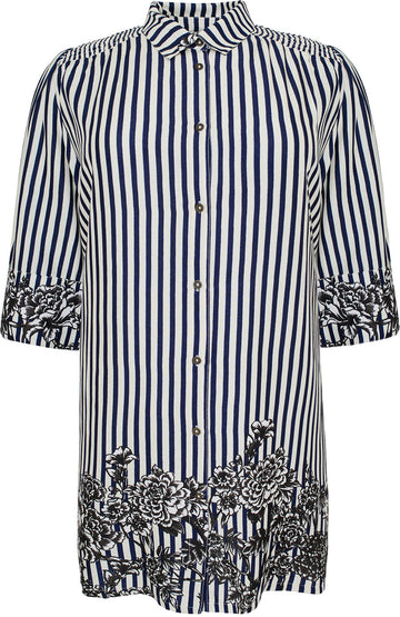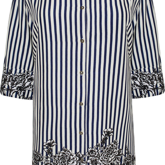 Oplev en perfekt kombination af klassisk og moderne stil med denne smukke tunika fra CASSIOPEIA. Tunikaen er designet med et flot stribet mønster i navy og hvid, der giver et stilfuldt og tidløst look. De lodrette striber skaber en slankende effekt, mens broderierne i bunden tilføjer et feminint touch.