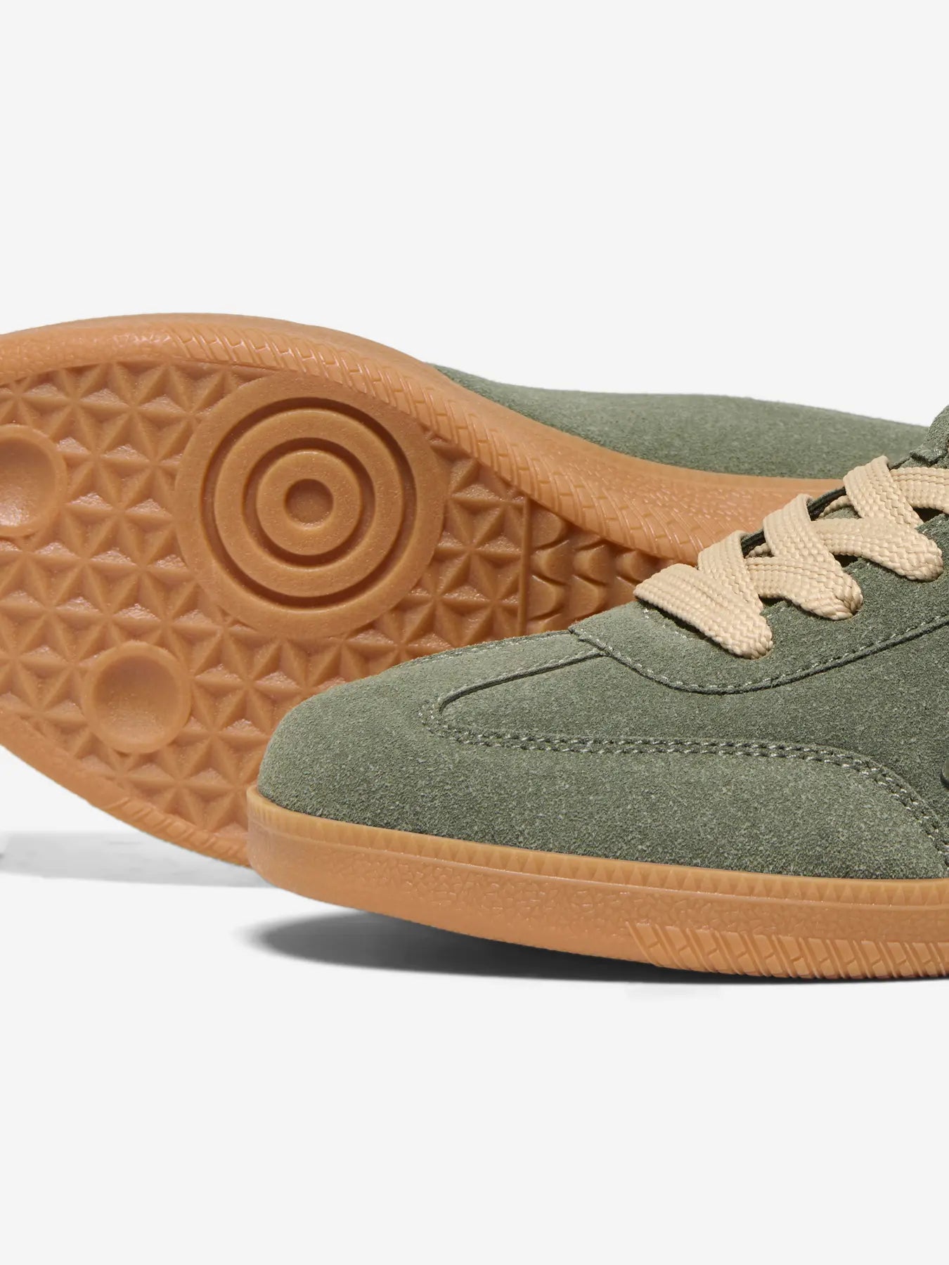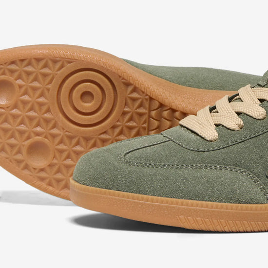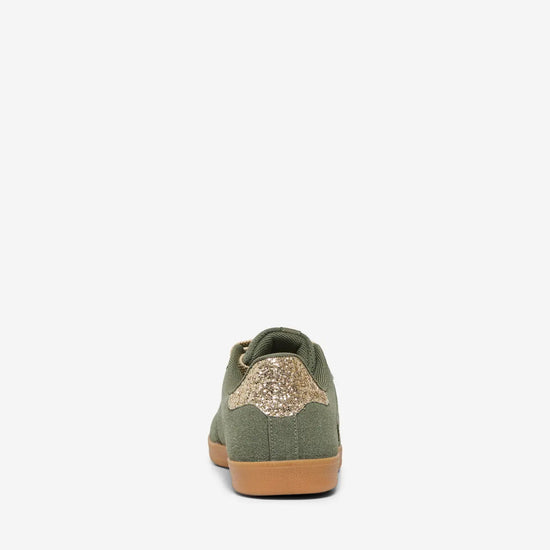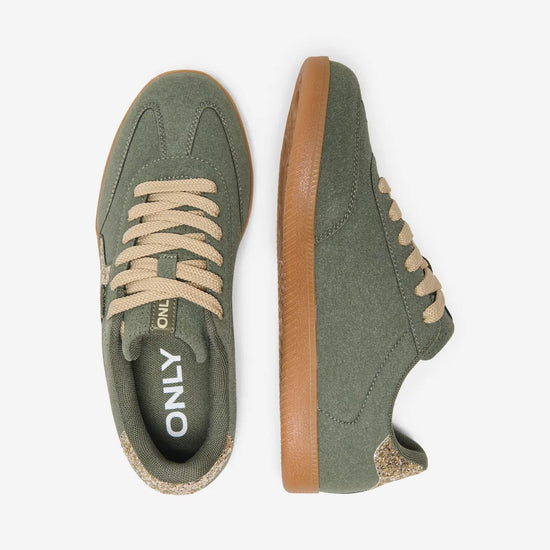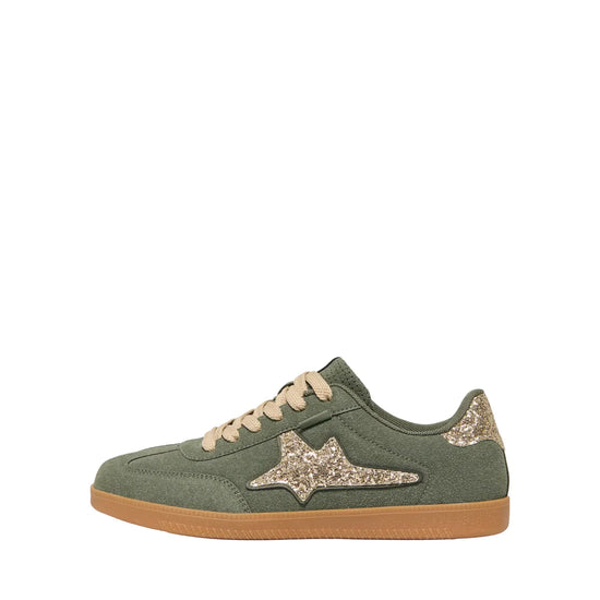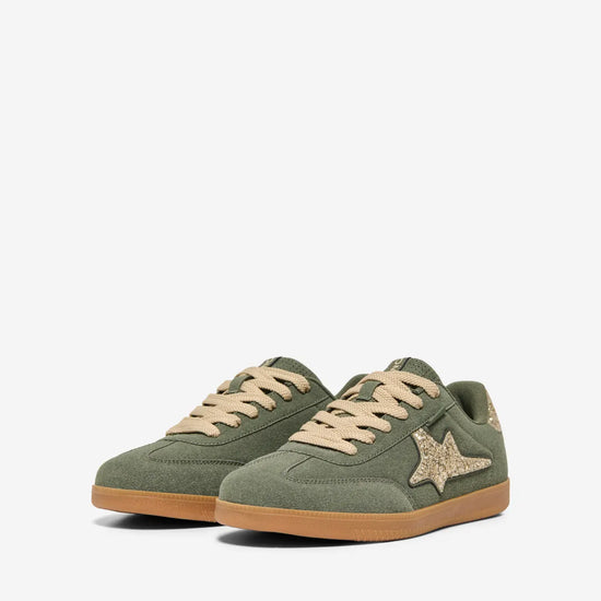 Disse sneakers fra Only Shoes kombinerer en trendy stil med høj komfort og funktionalitet til hverdagsbrug. Overdelen er fremstillet i en flot oliven nuance med et mat ruskindslignende look, som får et elegant modspil af den glitrende stjerne på siden og detaljen på hælen. De brede, cremefarvede snørebånd og den klassiske brune sål giver skoen et let retro-udtryk, som passer perfekt til sæsonens jeans.