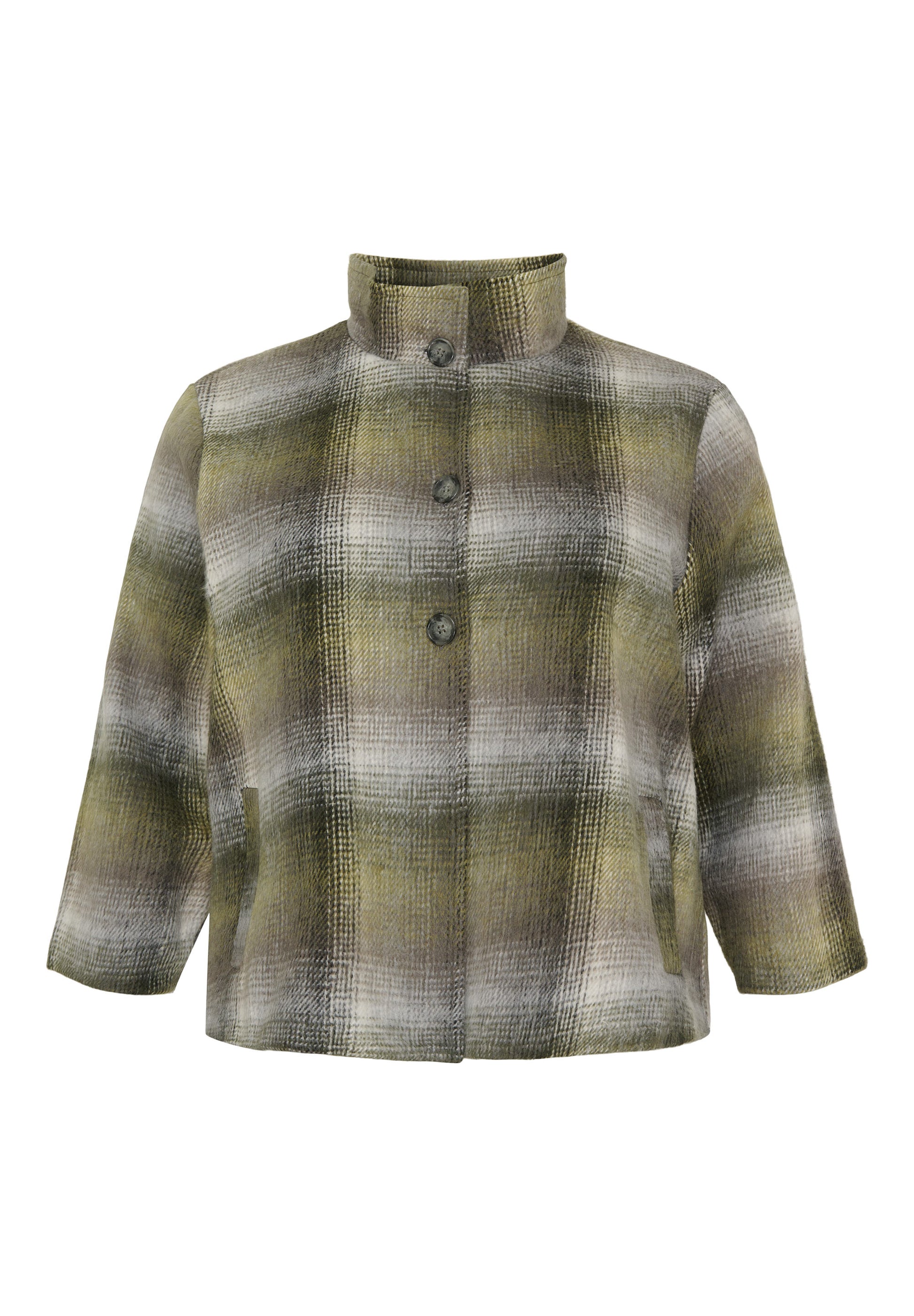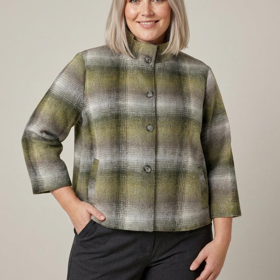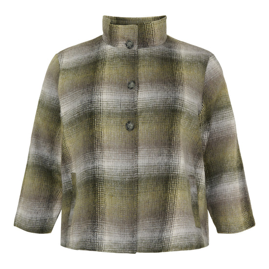 Denne elegante jakke i et sofistikeret ternet design forener klassiske farvetoner som olivengrøn, grå og sort i et harmonisk udtryk. Modellen er fra mærket NO. 1 BY OX og byder på en rummelig pasform, der falder flot og ubesværet omkring overkroppen. Det unikke snit fremhæves af en høj, opretstående krave og store knapper, der tilføjer karakter til det bløde look.