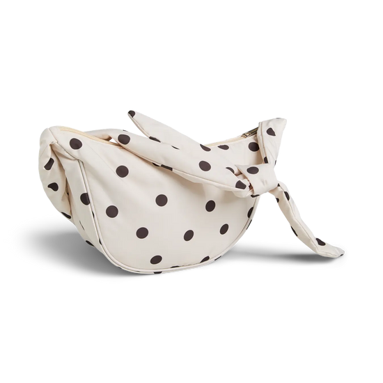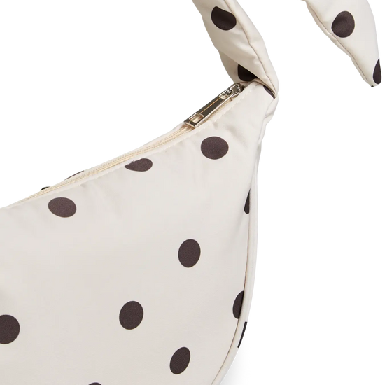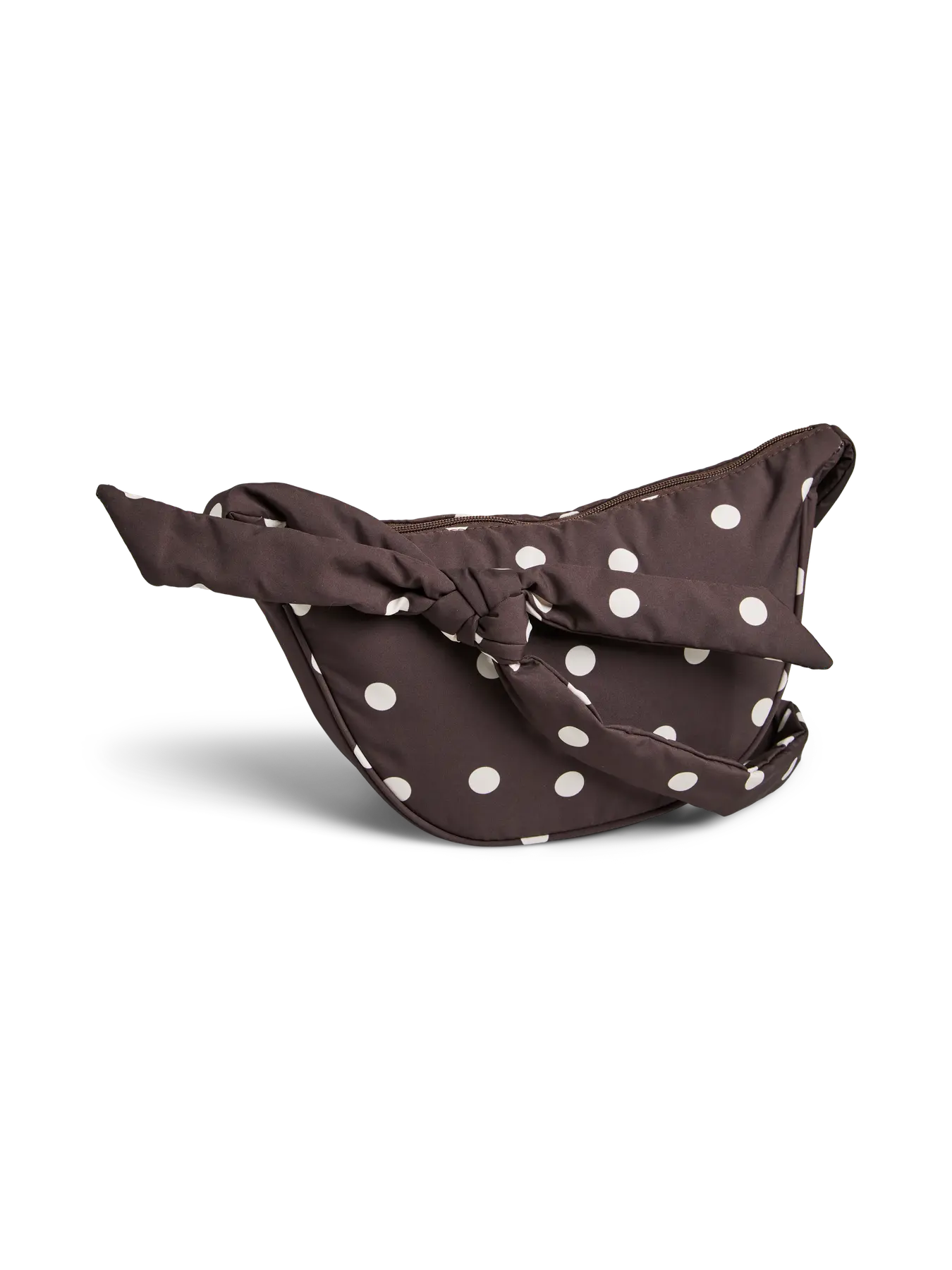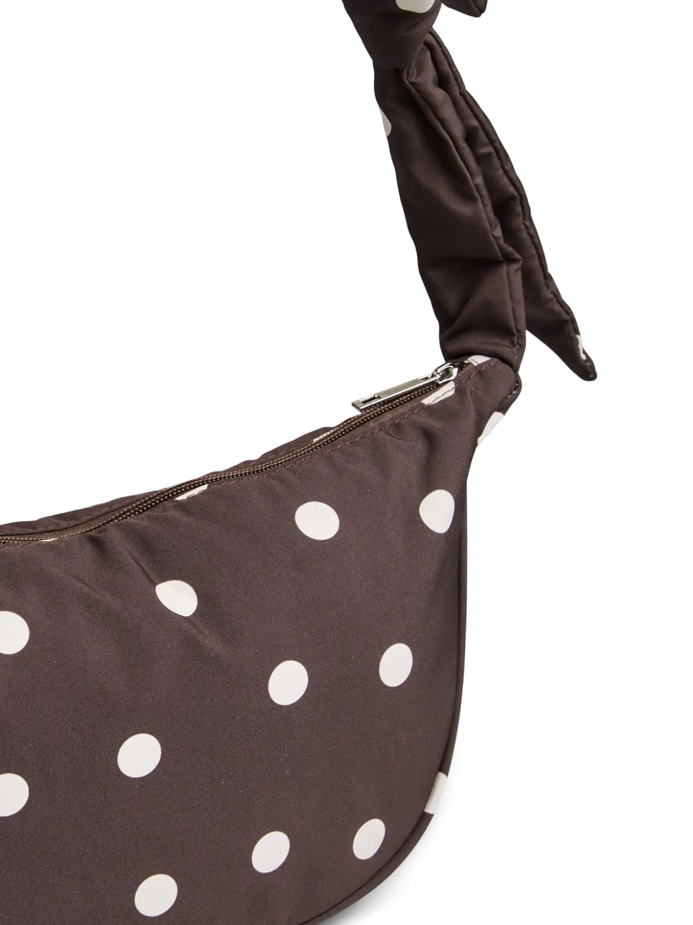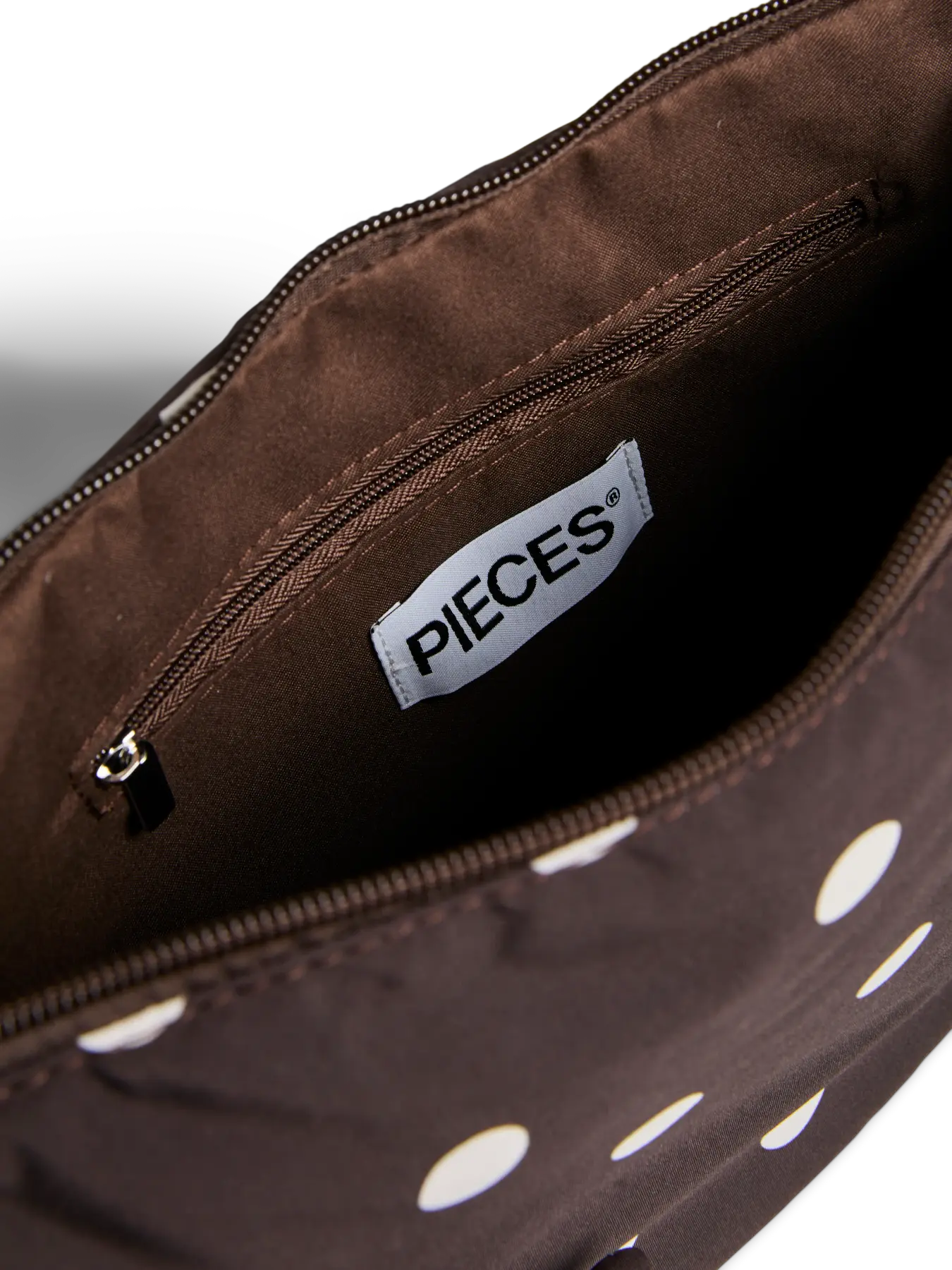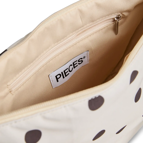 Modellen er ideel til både hverdag og festlige anledninger, hvor du gerne vil have hænderne fri men stadig se smart ud. Det tidløse prikkede print gør den nem at matche med både ensfarvede jakker eller andre favoritter fra Pieces for et gennemført look.