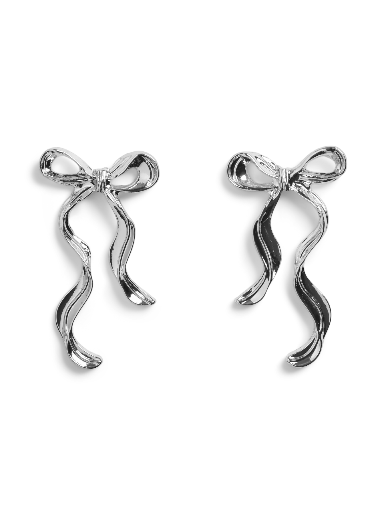Disse smukke øreringe fra Pieces er designet med en elegant sløjfeform, hvor de lange bånd skaber et let og levende udtryk. Den blanke sølvfarvede overflade fanger lyset på fineste vis, hvilket giver smykket et eksklusivt og stilrent look. Med sin blanding af zink og titanium får du et sæt, der både er holdbart og let at bære.