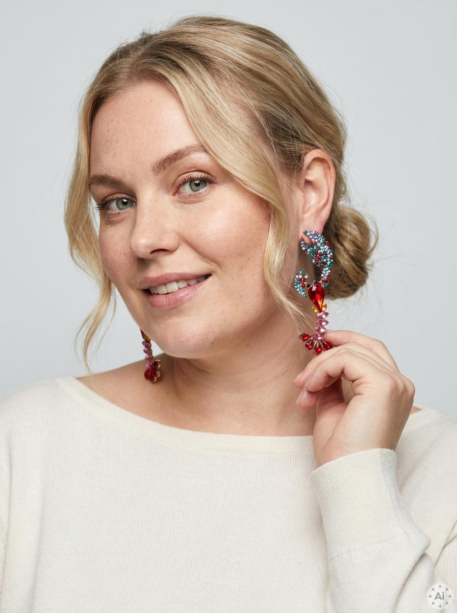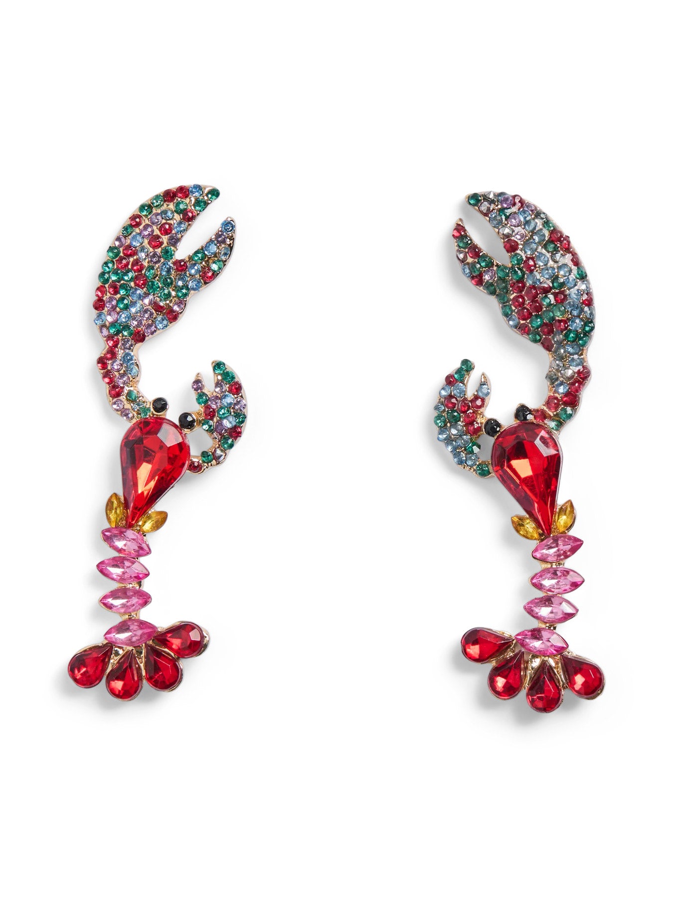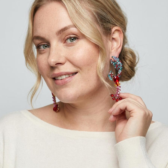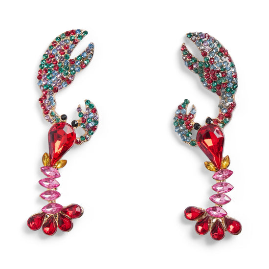 Giv dit outfit et legende og feminint strejf med disse skønne øreringe, der er formet som funklende hummere. Smykket er rigt udsmykket med facetslebne sten i en smuk kombination af rød, pink, grøn og blå, hvilket skaber et unikt blikfang, der er perfekt til sommerfester og festivaler.
