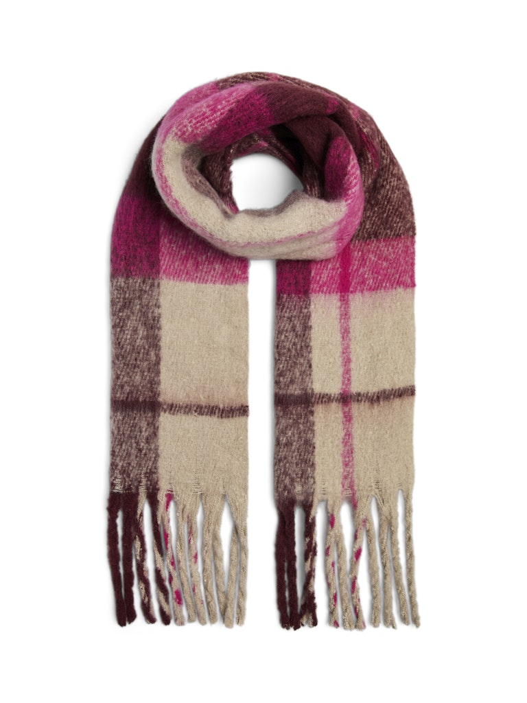 Dette halstørklæde fra Pieces er skabt i silkeblød polyester og byder på et flot, klassisk ternet design i nuancer af beige, tawny port og beetroot purple med markante pink detaljer. Detaljer som lange, bløde frynser i enderne og et print, der dækker hele tørklædet, giver et moderne og feminint udtryk.
