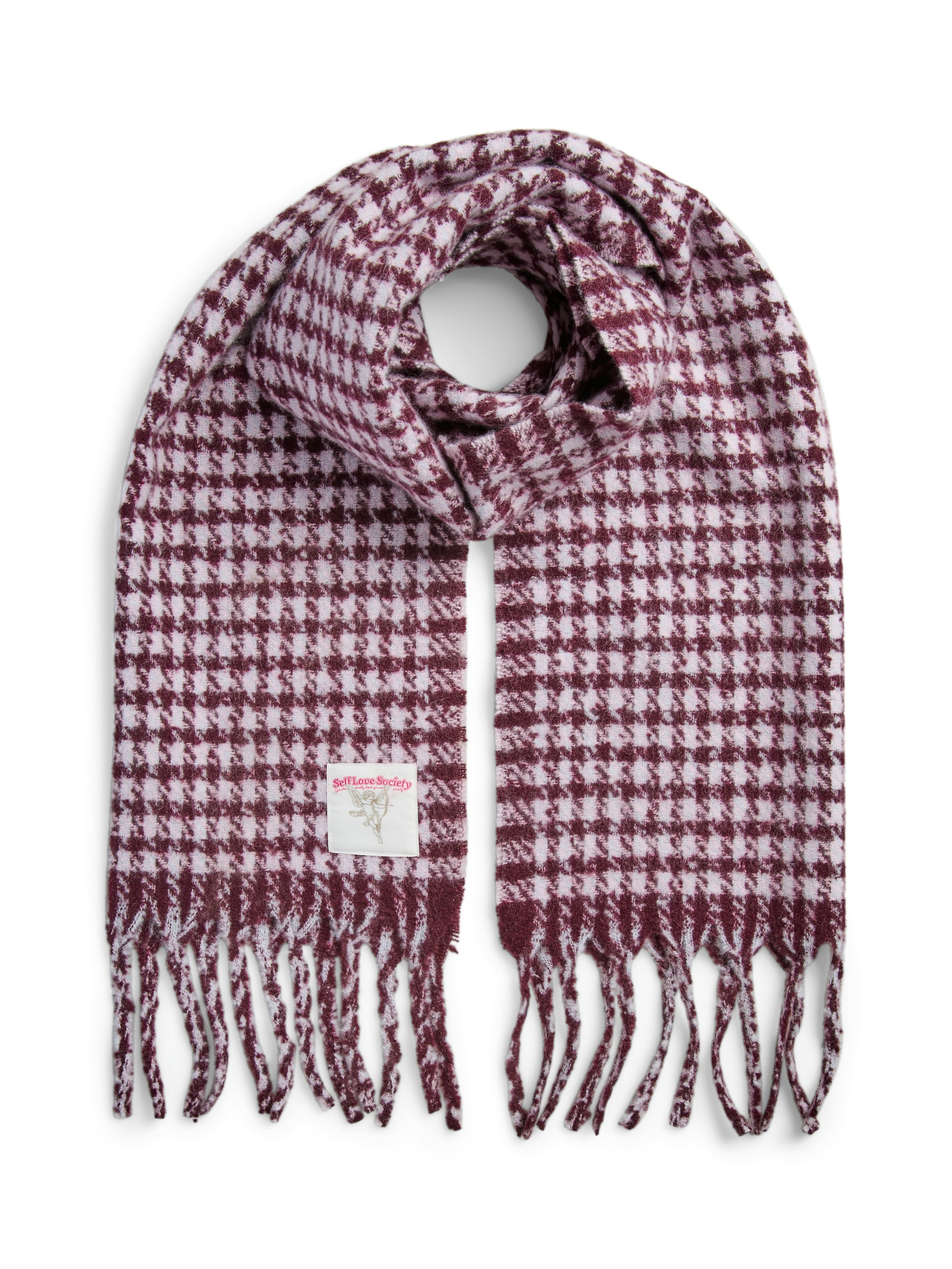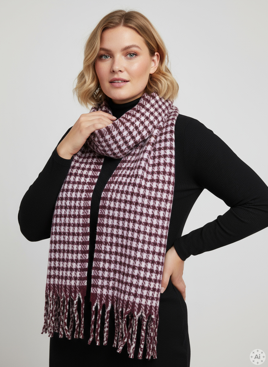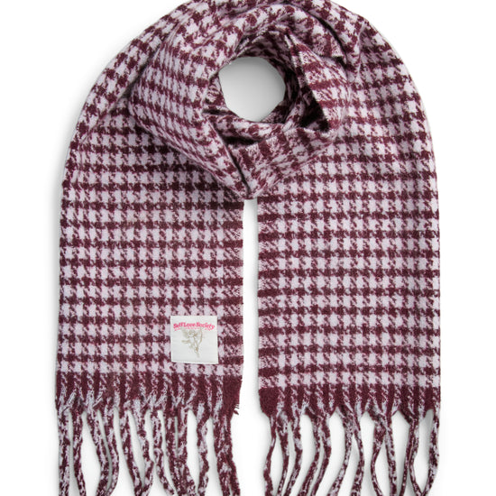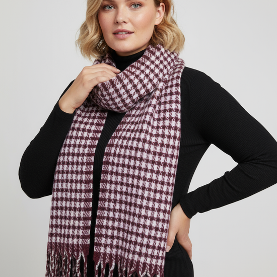 Dette lange tørklæde fra Pieces kombinerer varme og elegance med sit jacquardvævede hundetandsmønster i dyb vinrød og hvid. De dekorative frynser i enderne giver et afslappet, moderne udtryk, mens det bløde materiale gør tørklædet behageligt at have på – perfekt til de kolde måneder.