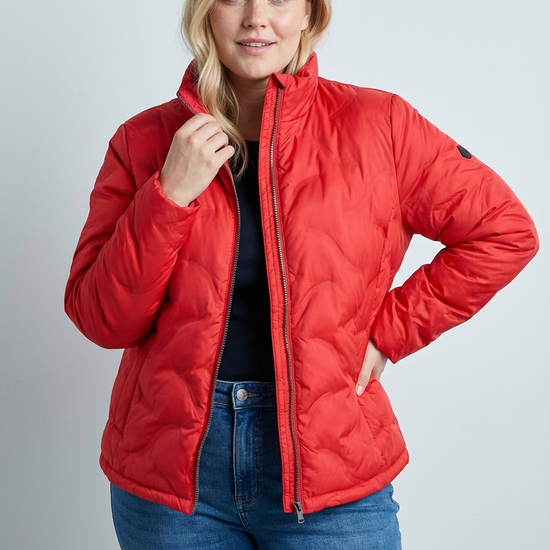 Denne smukke jakke fra Etage skiller sig ud med sin flotte røde farve og det unikke bølgede mønster i quiltningen. Modellen er designet med fokus på pasform og funktionalitet, hvilket gør den ideel til hverdagsbrug, når du ønsker et smart look.