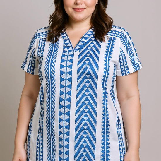 Oplev den perfekte kombination af komfort og stil med denne smukke bluse fra Cassiopeia. Lavet af 80% bomuld og 20% polyester, tilbyder denne bluse både blødhed og holdbarhed, hvilket gør den ideel til hverdagsbrug. Det geometriske mønster i blå nuancer på en hvid baggrund giver et moderne touch, der passer til enhver garderobe.
