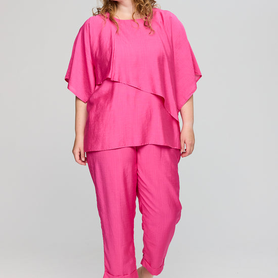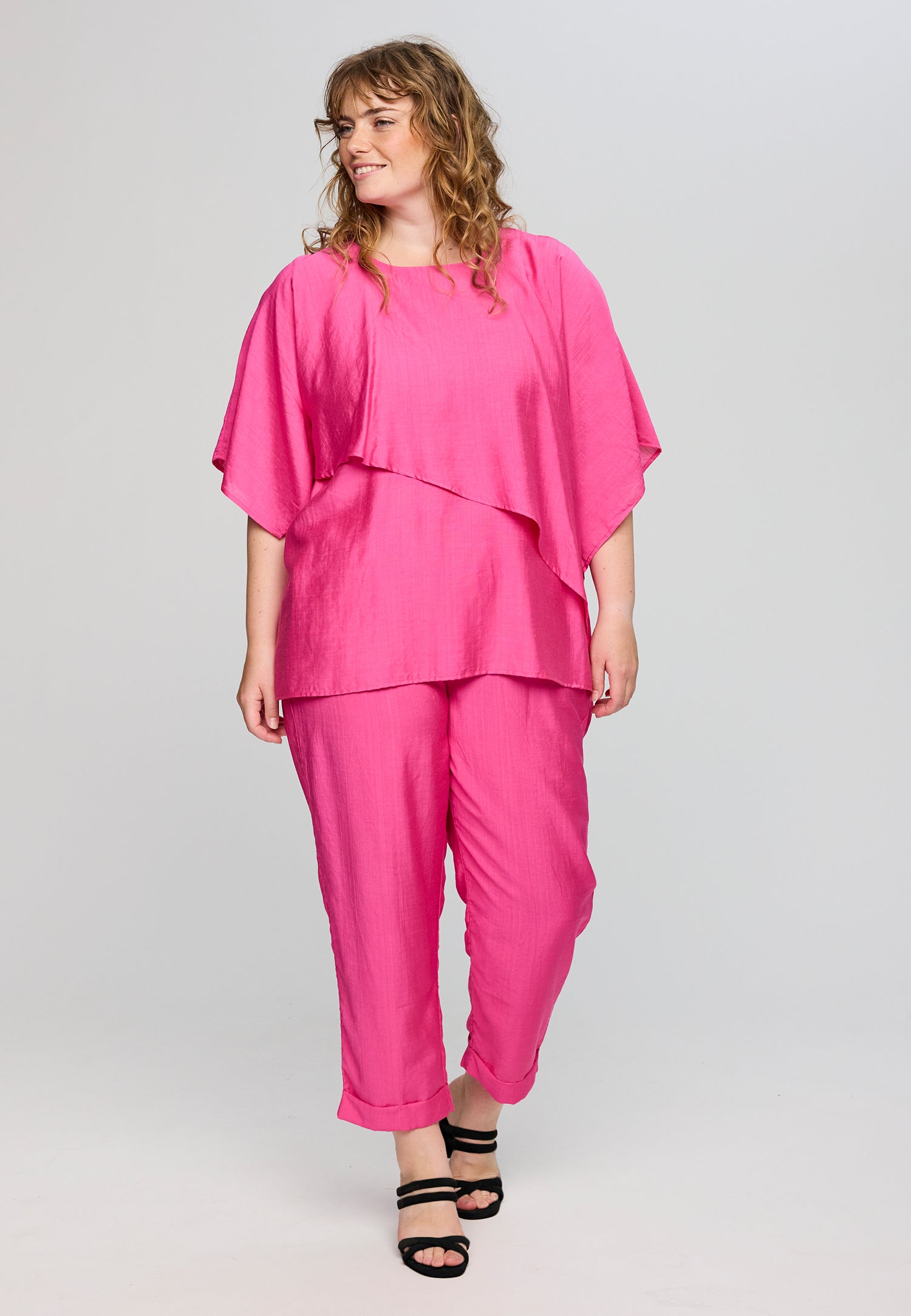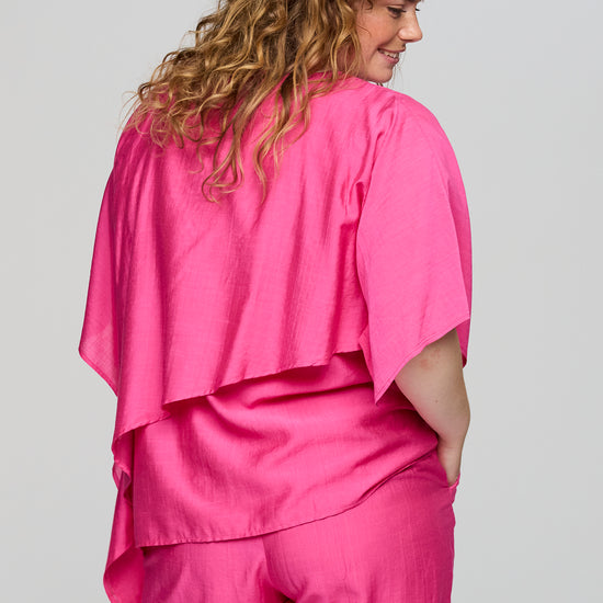 Det utroligt lette materiale er skabt med en svag, elegant struktur i overfladen, der på smukkeste vis understøtter den florlette fornemmelse. Den behagelige sammensætning af viskose og nylon lader stoffet falde helt ubesværet, hvilket skaber en yndefuld bevægelse, når du bærer den. Du kan med fordel style blusen sammen med et par bløde og matchende plus size bukser for at opnå et fuldendt og afslappet sæt.