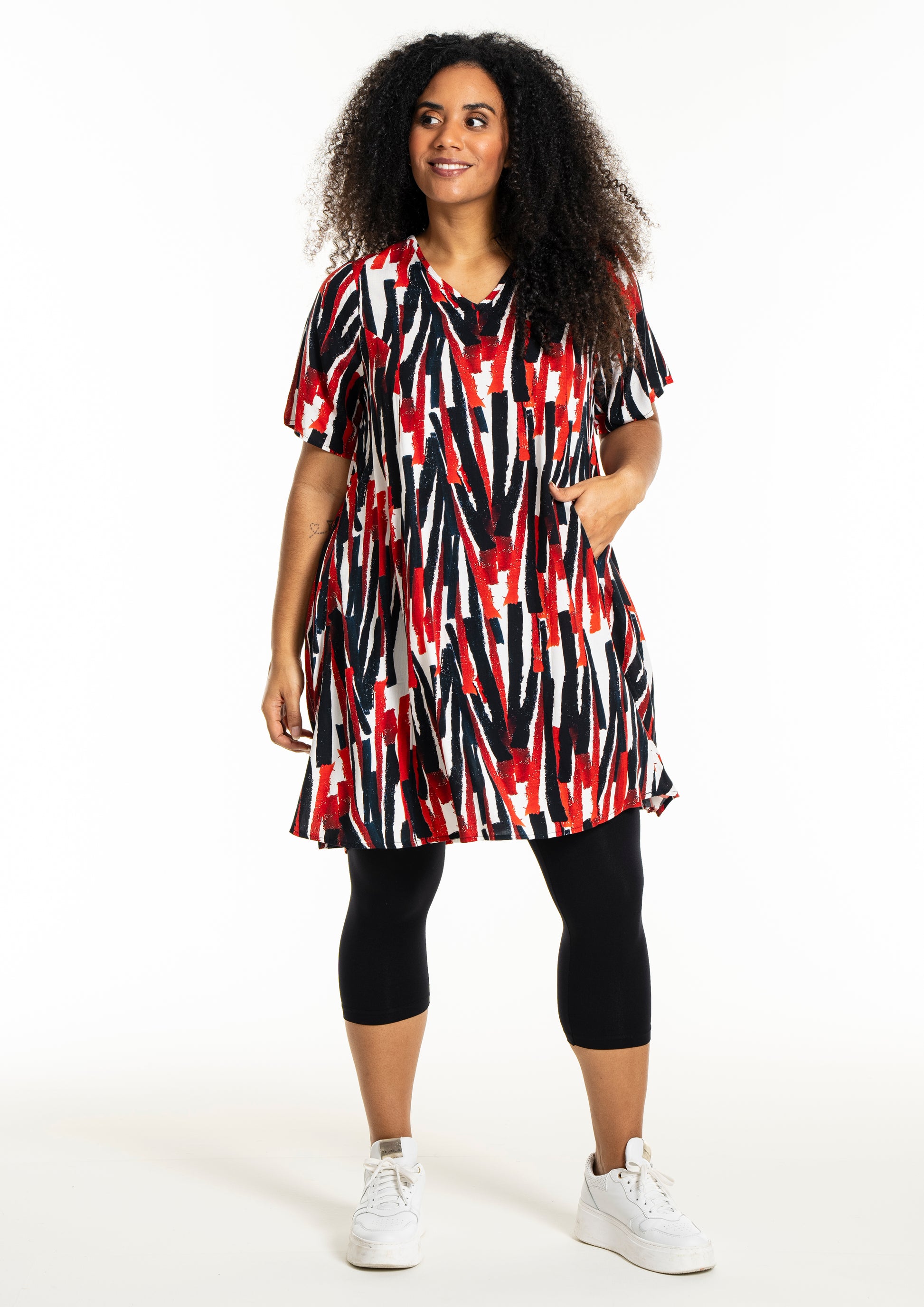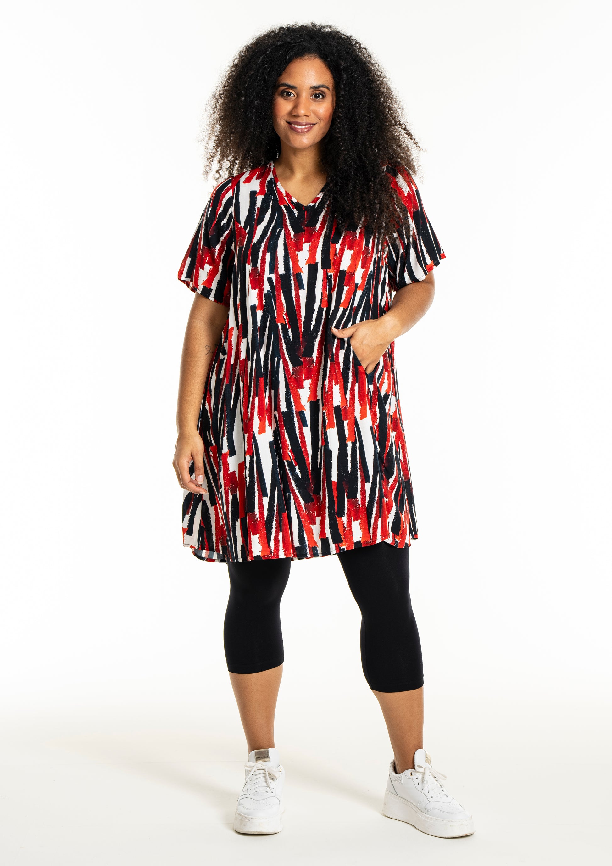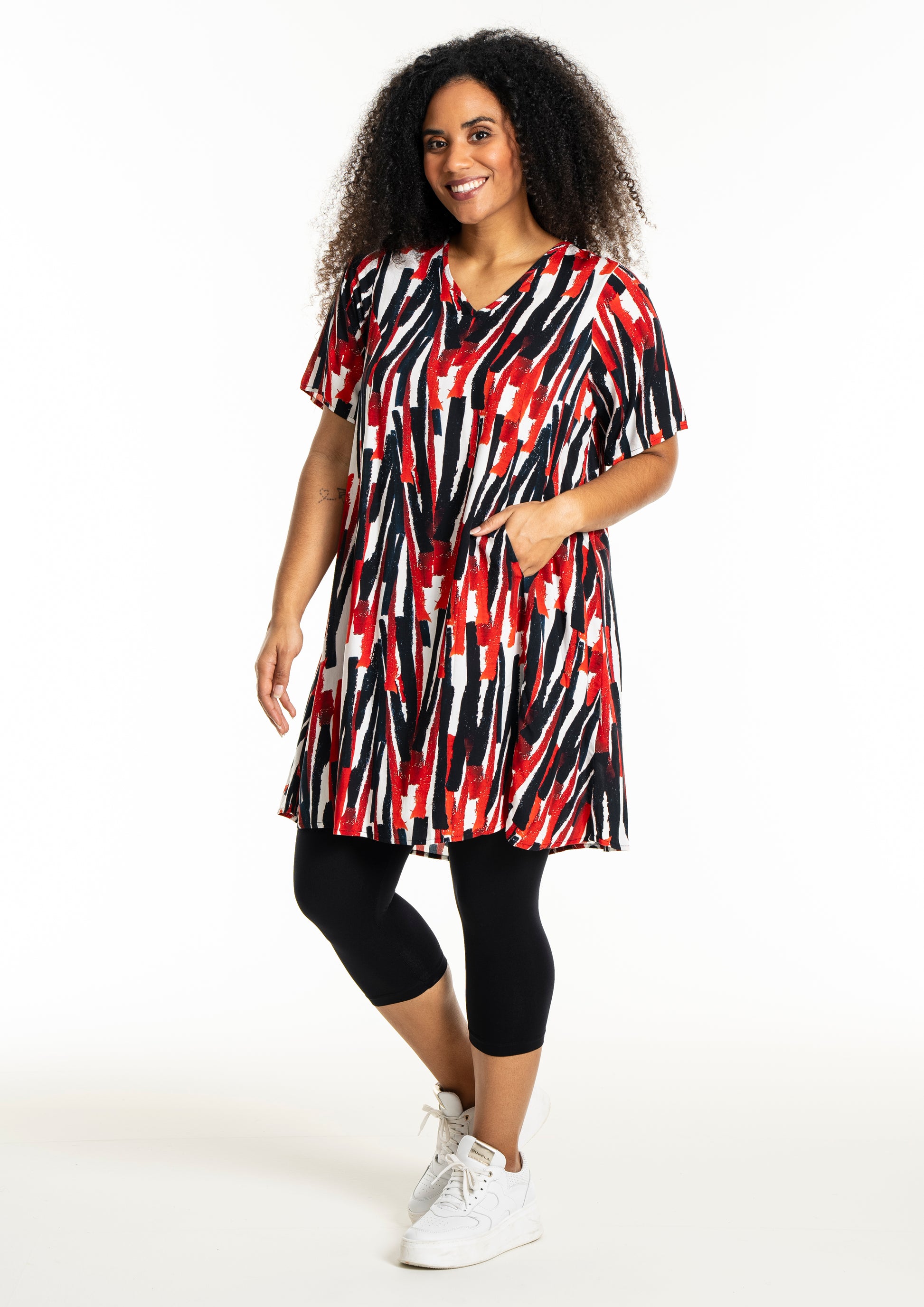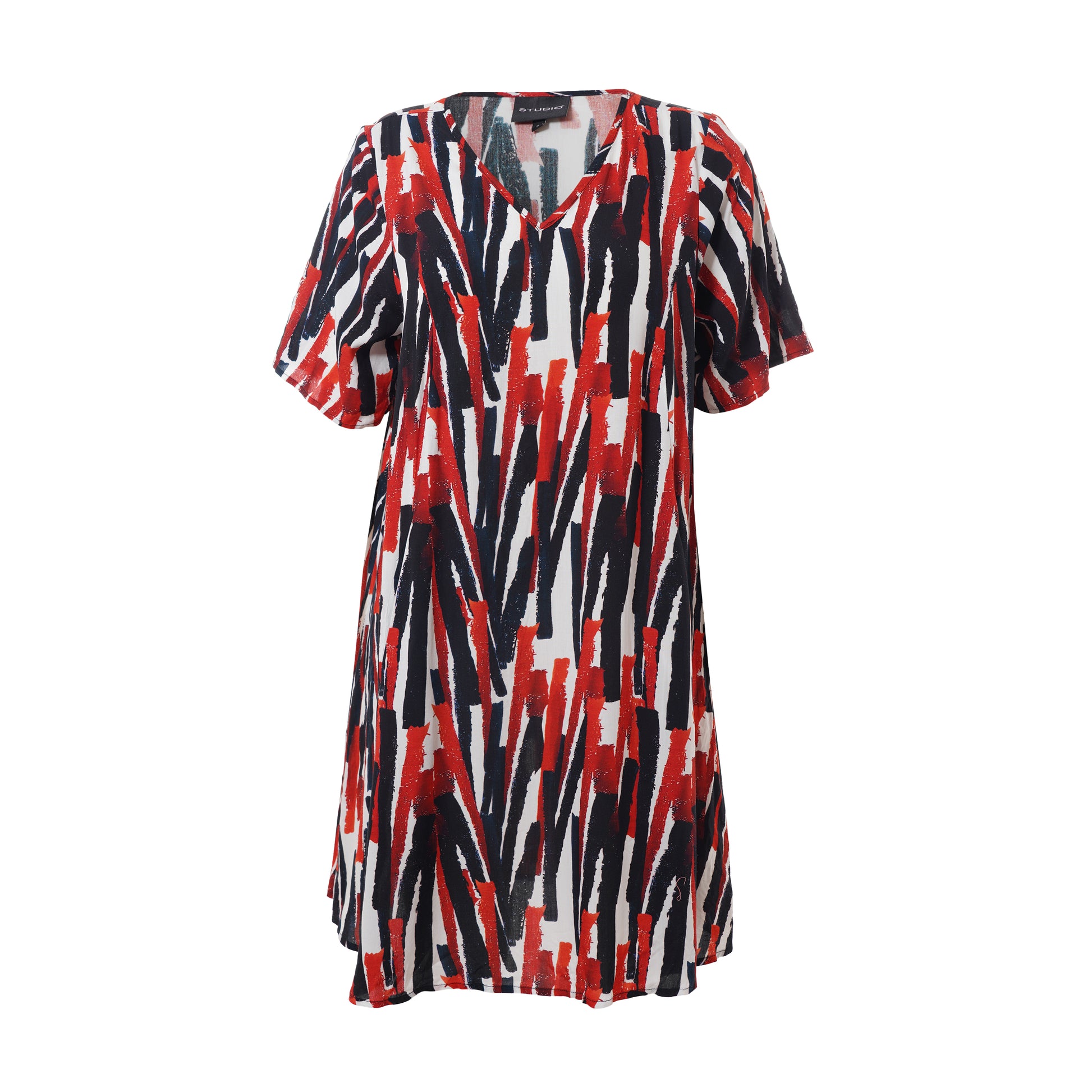 Oplev en frisk og moderne stil med denne smukke kjole fra Studio. Designet med et iøjnefaldende mønster i hvidt med røde striber, er denne kjole en perfekt kombination af elegance og komfort. Fremstillet af 100% viskose, tilbyder den lethed og åndbarhed, der gør den ideel til både hverdag og særlige lejligheder.