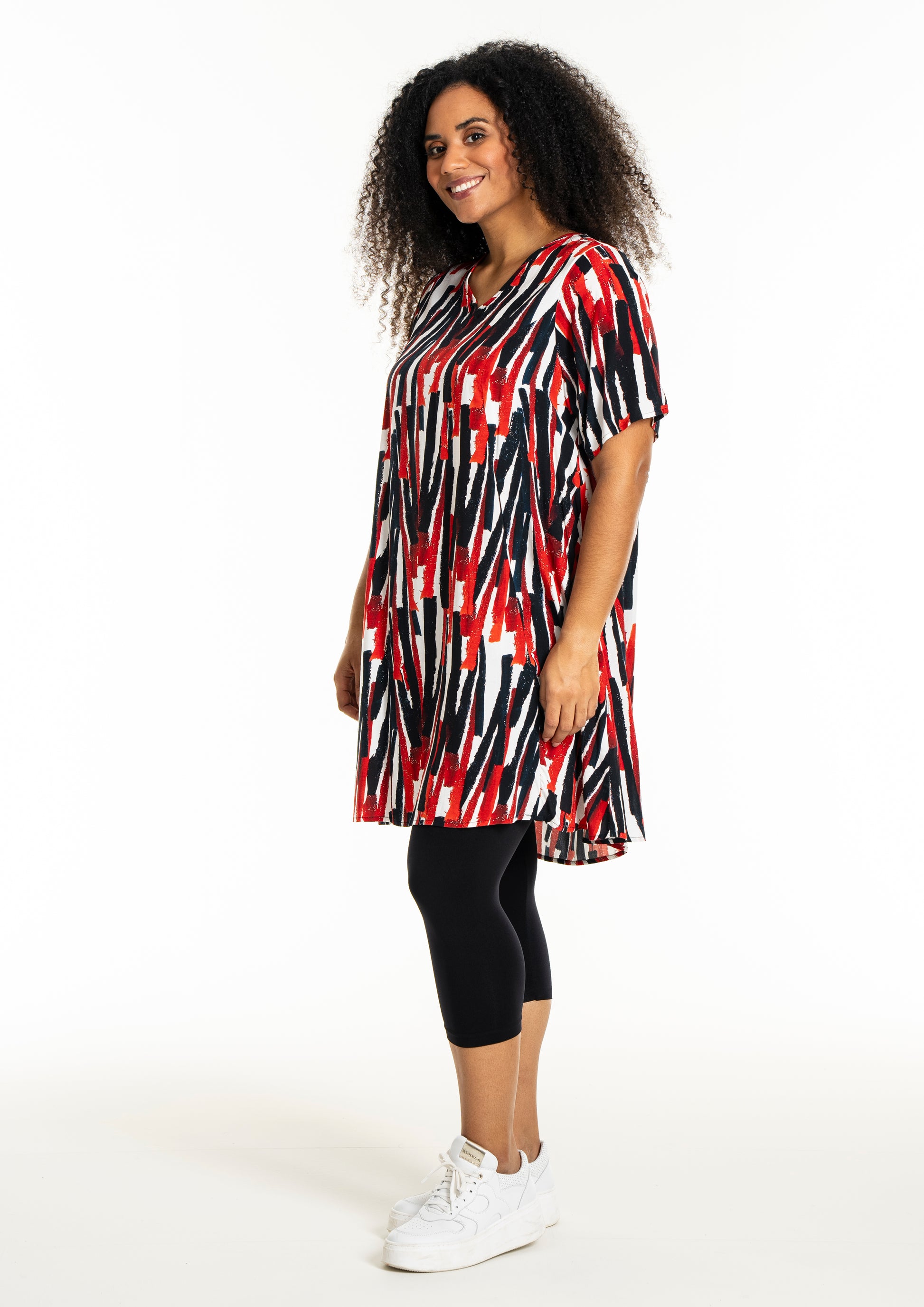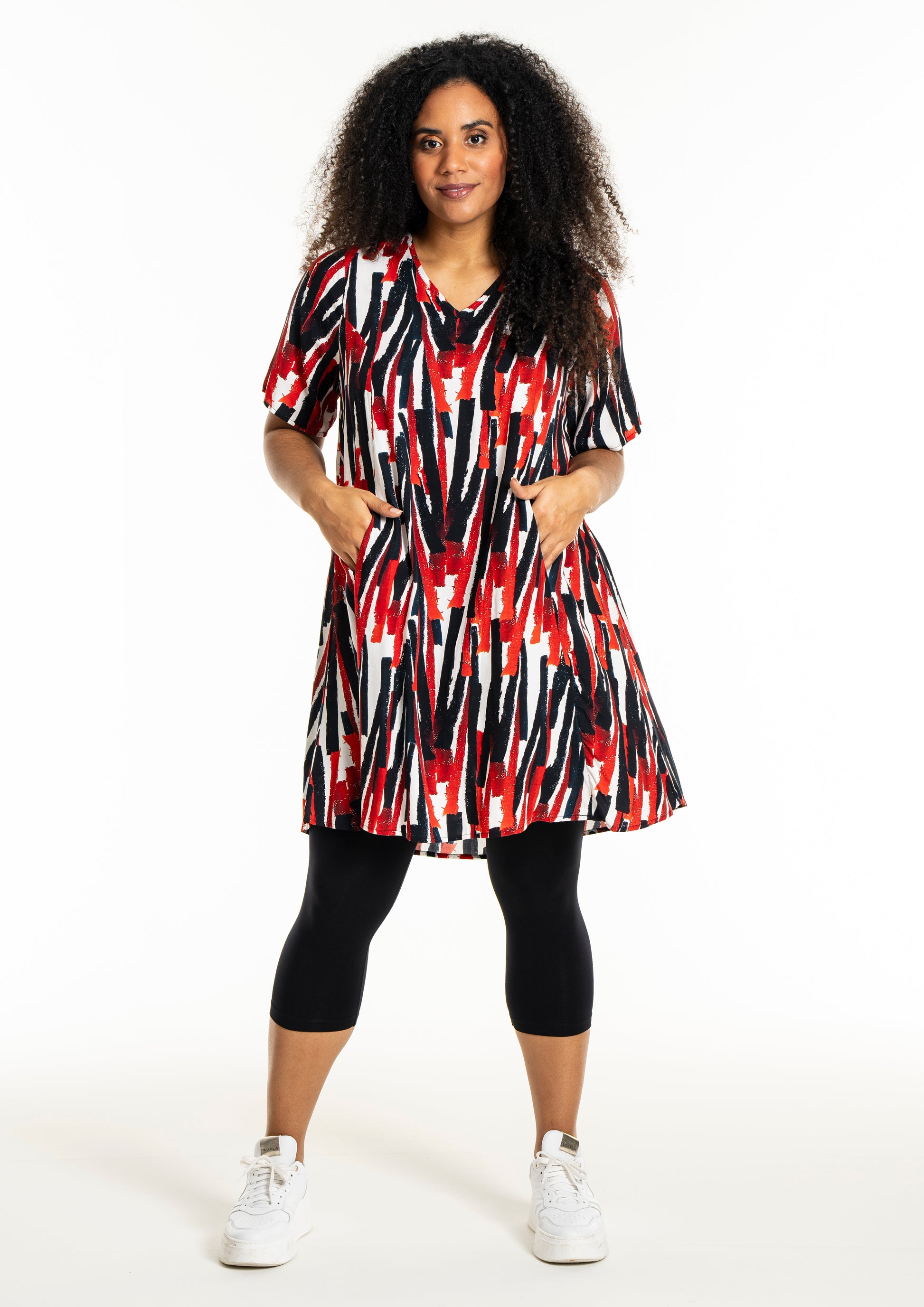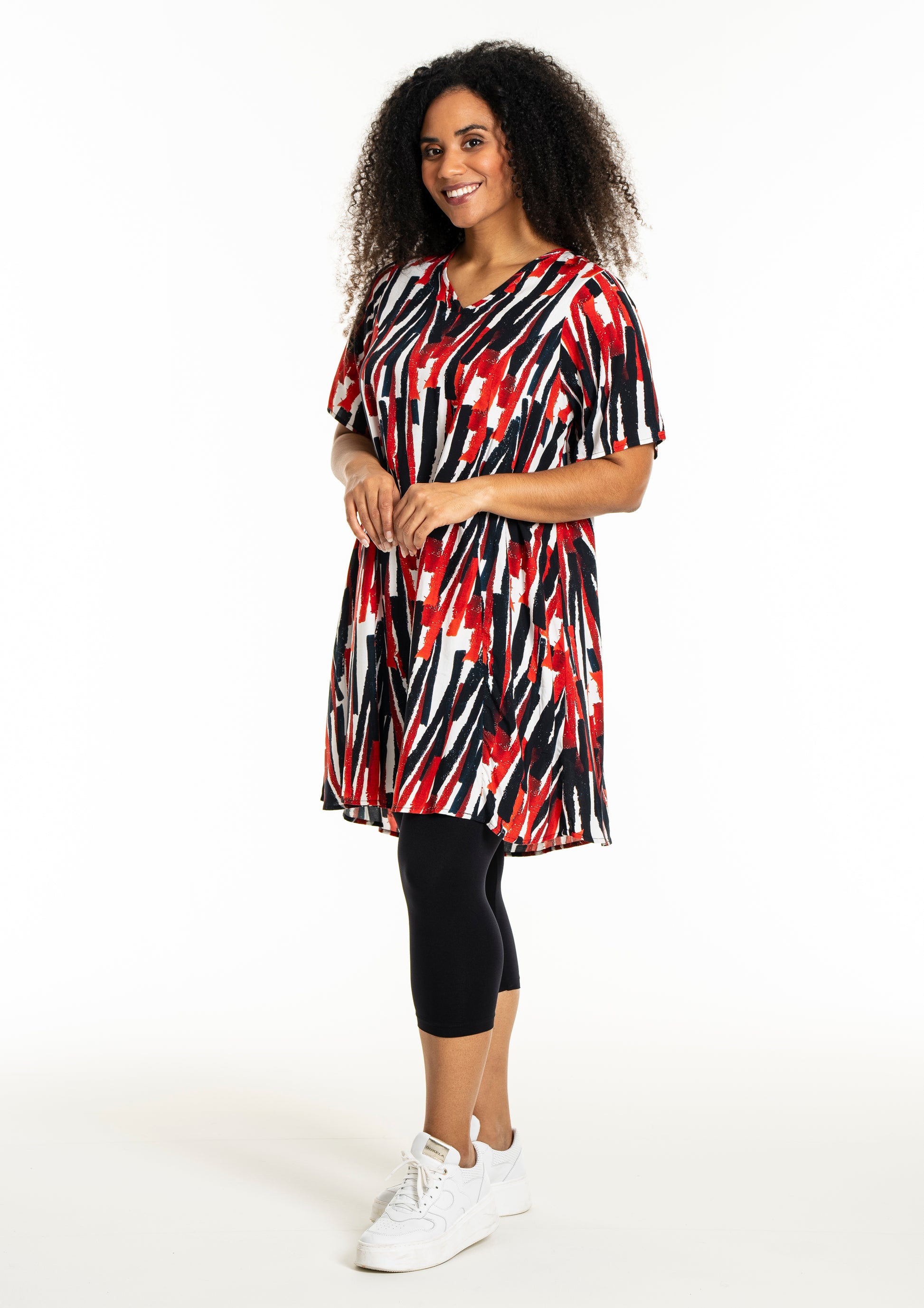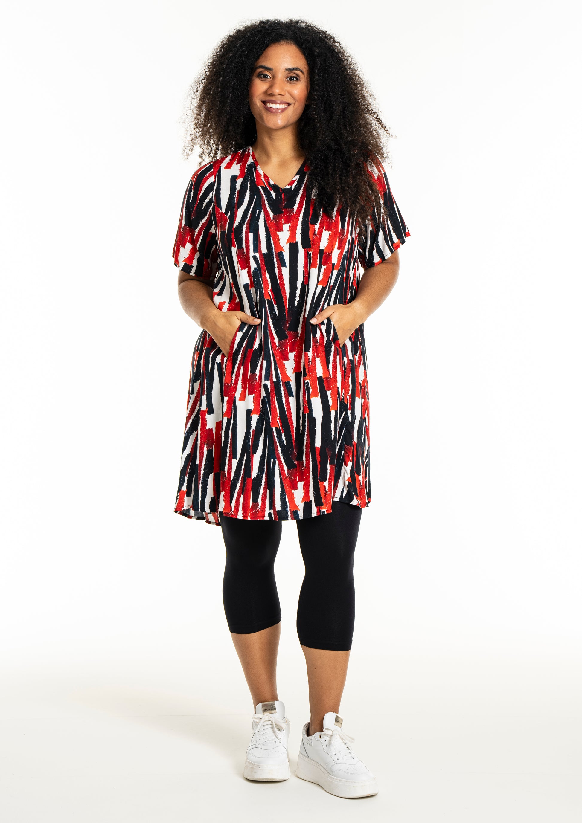 Oplev en frisk og moderne stil med denne smukke kjole fra Studio. Designet med et iøjnefaldende mønster i hvidt med røde striber, er denne kjole en perfekt kombination af elegance og komfort. Fremstillet af 100% viskose, tilbyder den lethed og åndbarhed, der gør den ideel til både hverdag og særlige lejligheder.