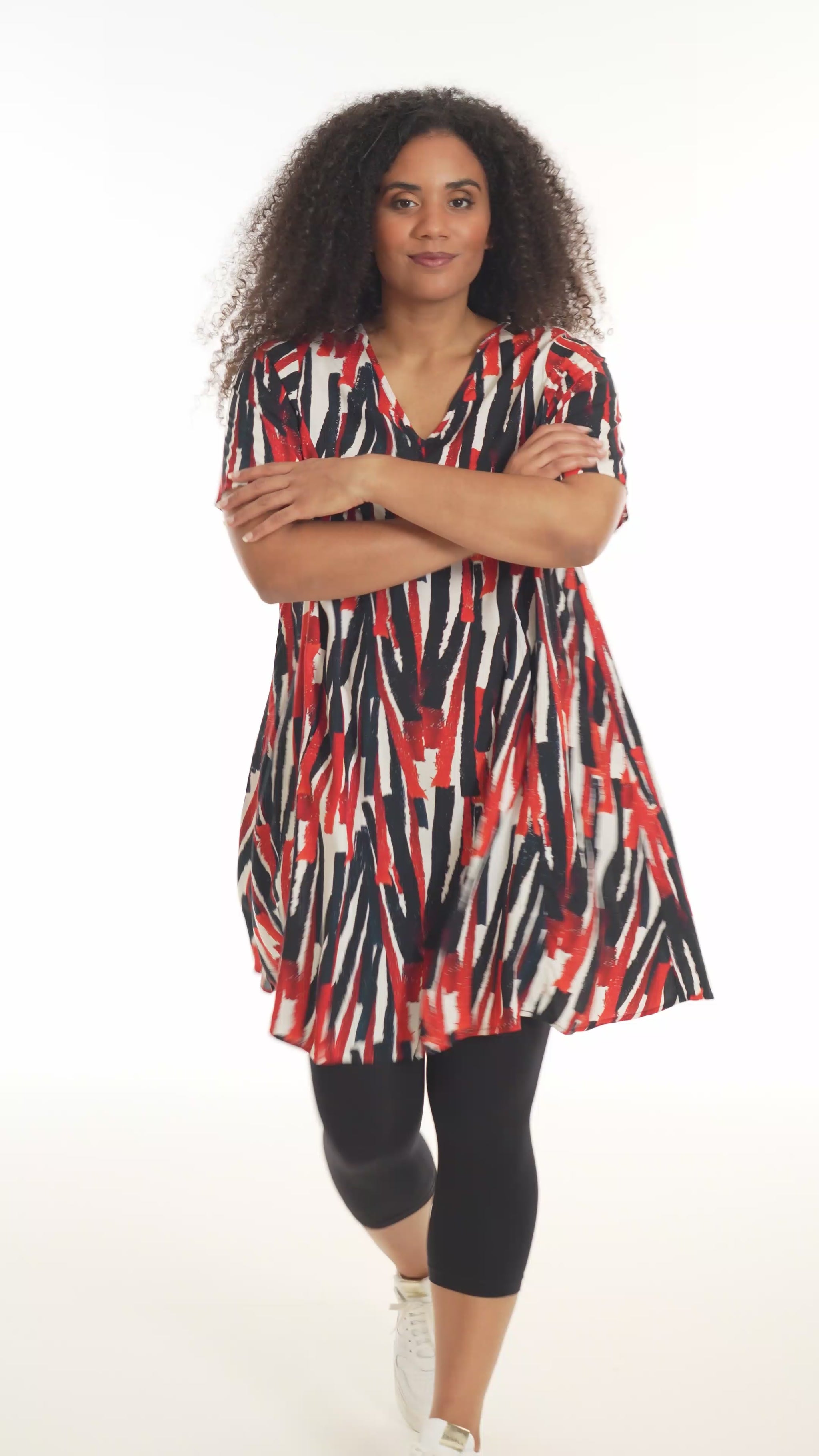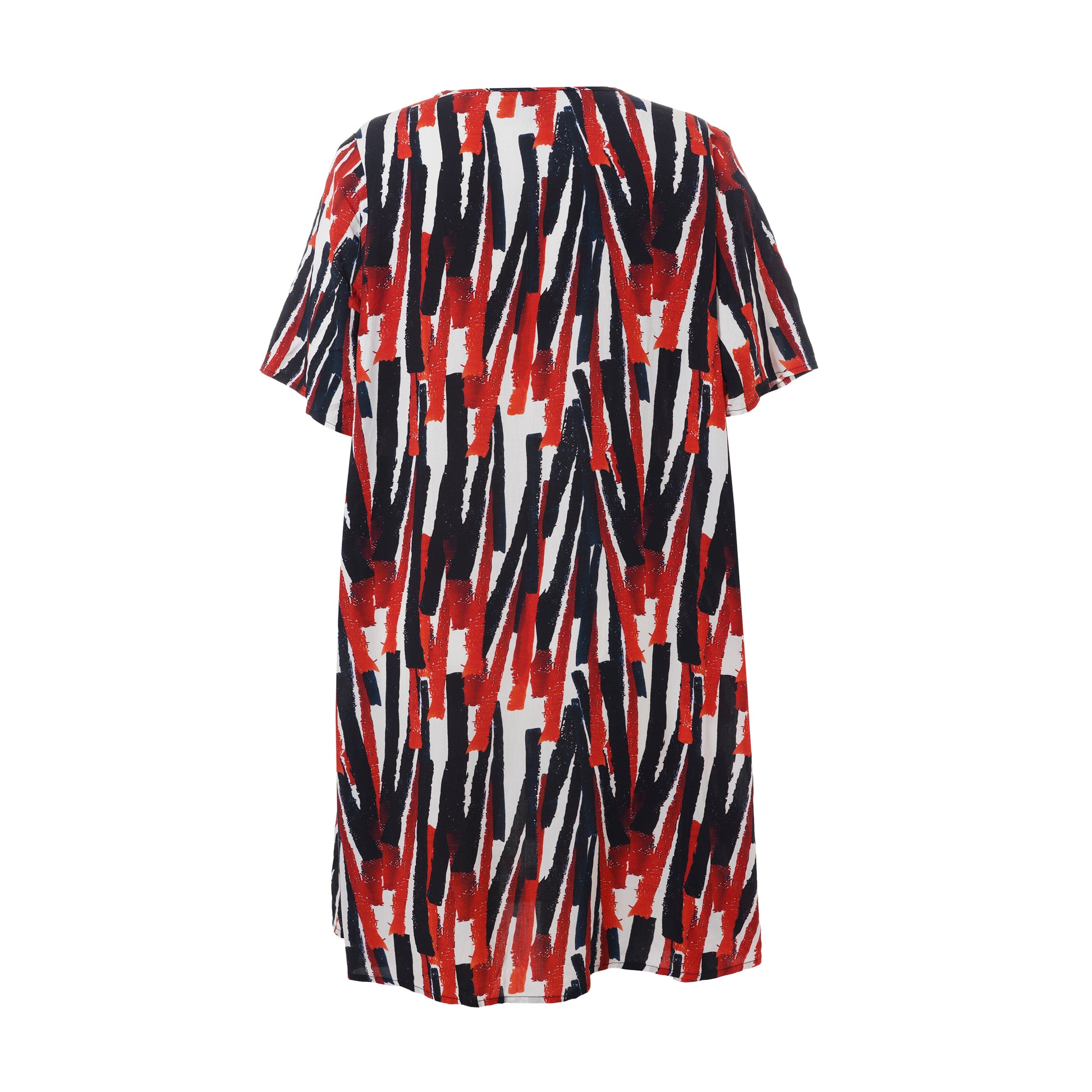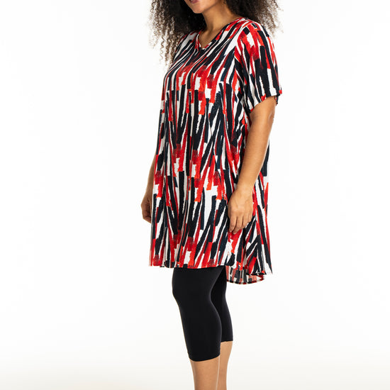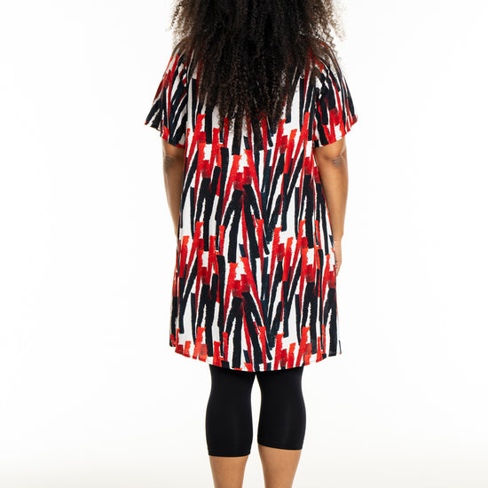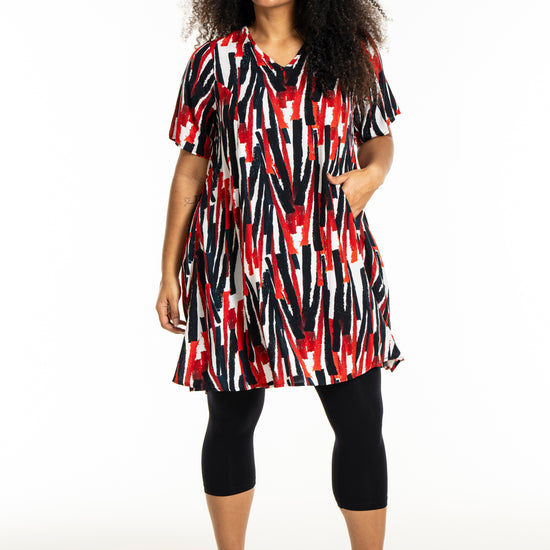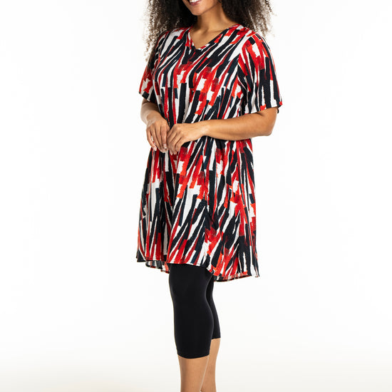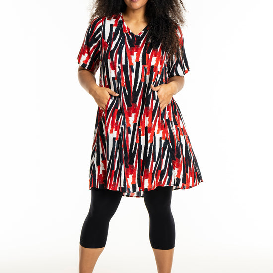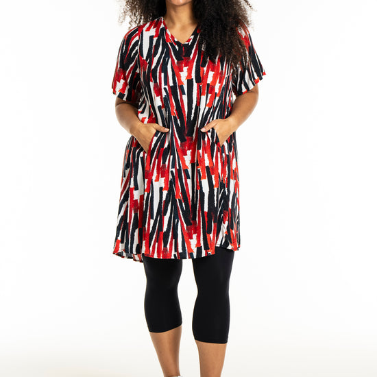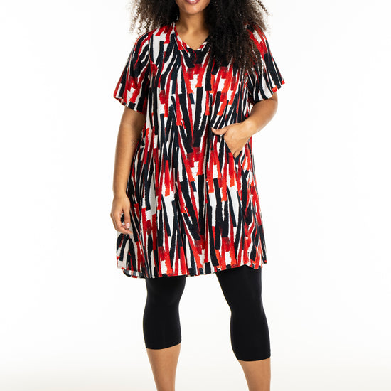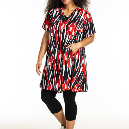 Oplev en frisk og moderne stil med denne smukke kjole fra Studio. Designet med et iøjnefaldende mønster i hvidt med røde striber, er denne kjole en perfekt kombination af elegance og komfort. Fremstillet af 100% viskose, tilbyder den lethed og åndbarhed, der gør den ideel til både hverdag og særlige lejligheder.