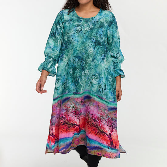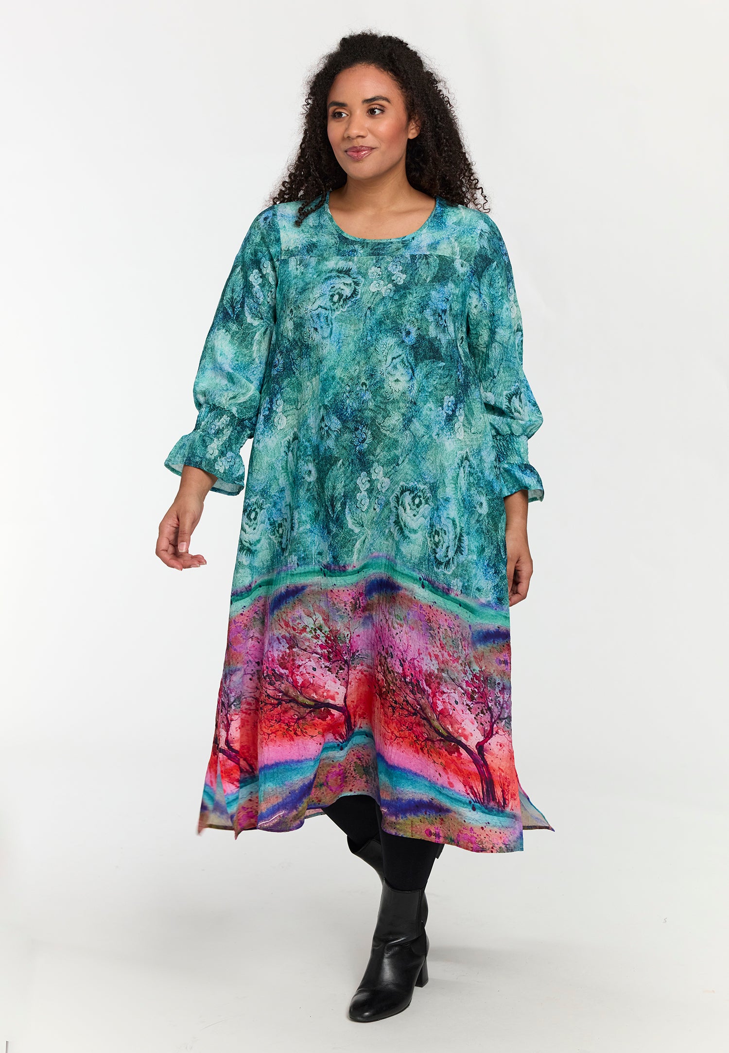 Kjolen har en enkel silhuet og et subtilt print, som gør den velegnet både til hverdagsbrug og pænere lejligheder. De elastiske ærmeafslutninger giver et let puf, og længden til midt på skinnebenet fuldender det elegante udtryk. Perfekt til dig, der ønsker en behagelig og stilfuld kjole med et unikt præg.