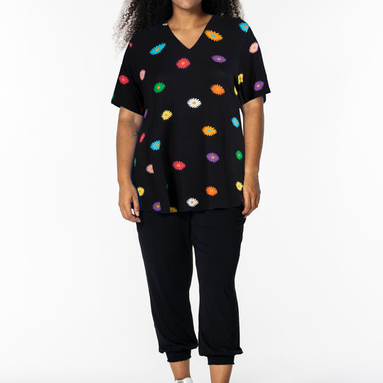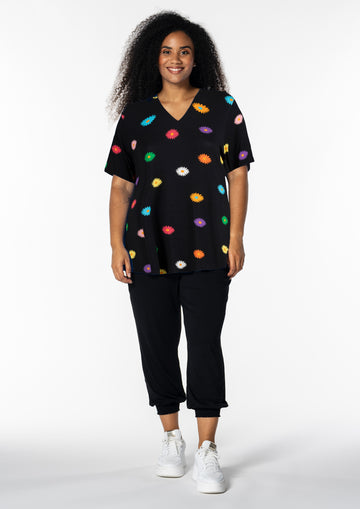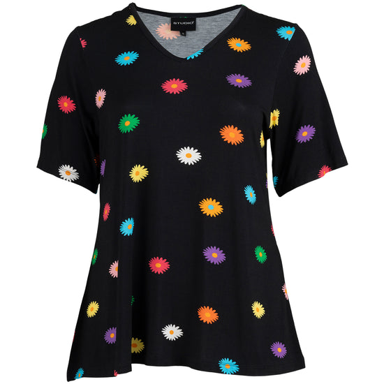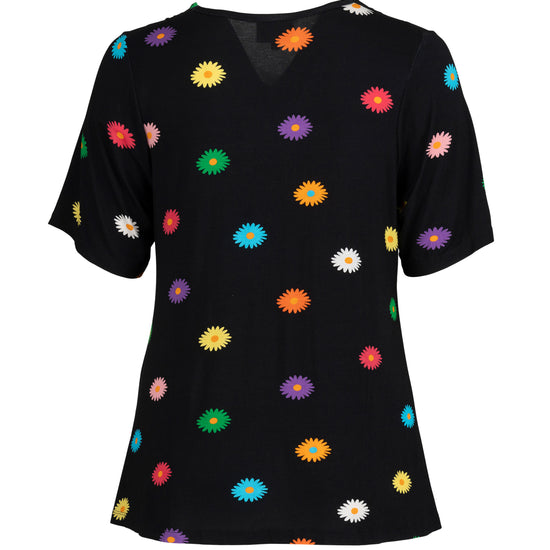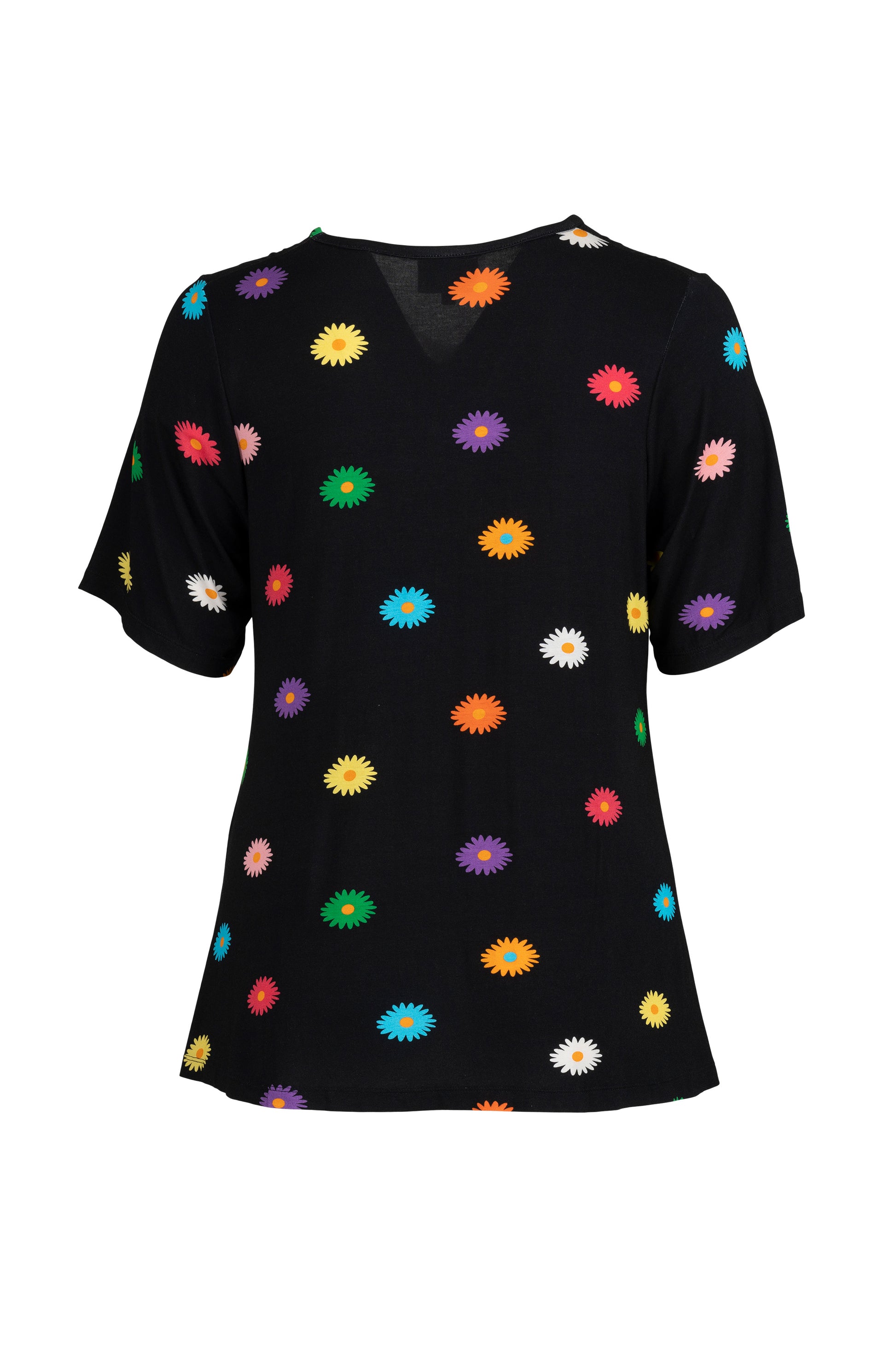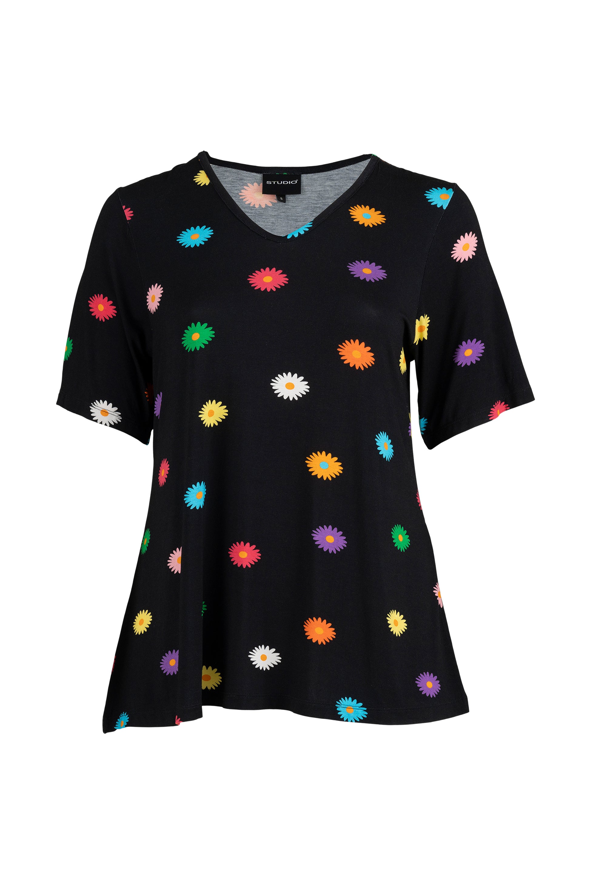 Oplev komfort og stil med denne smukke T-shirt fra Studio. Lavet i en blød og strækbar blanding af 95% viskose og 5% elastan, tilbyder denne T-shirt en behagelig pasform, der tilpasser sig din krop. Det iøjnefaldende blomsterprint på den ensfarvede sorte baggrund tilføjer et sofistikeret touch til dit hverdagslook.