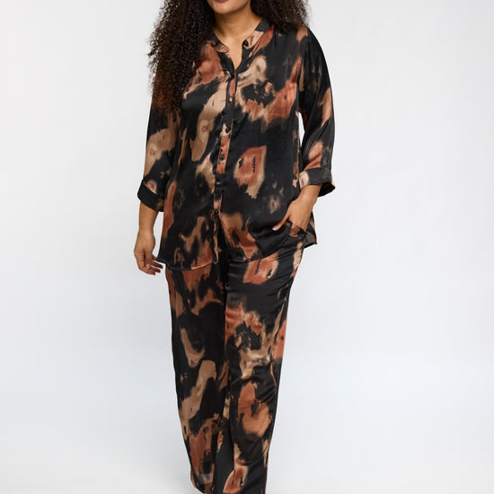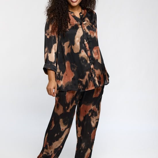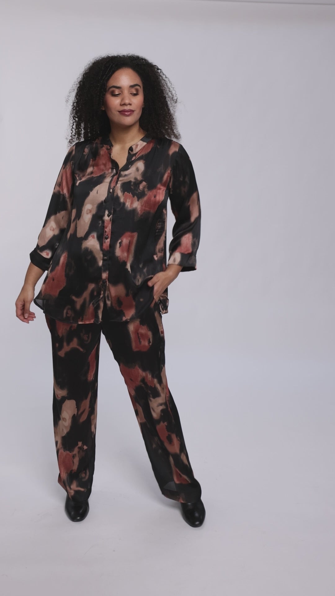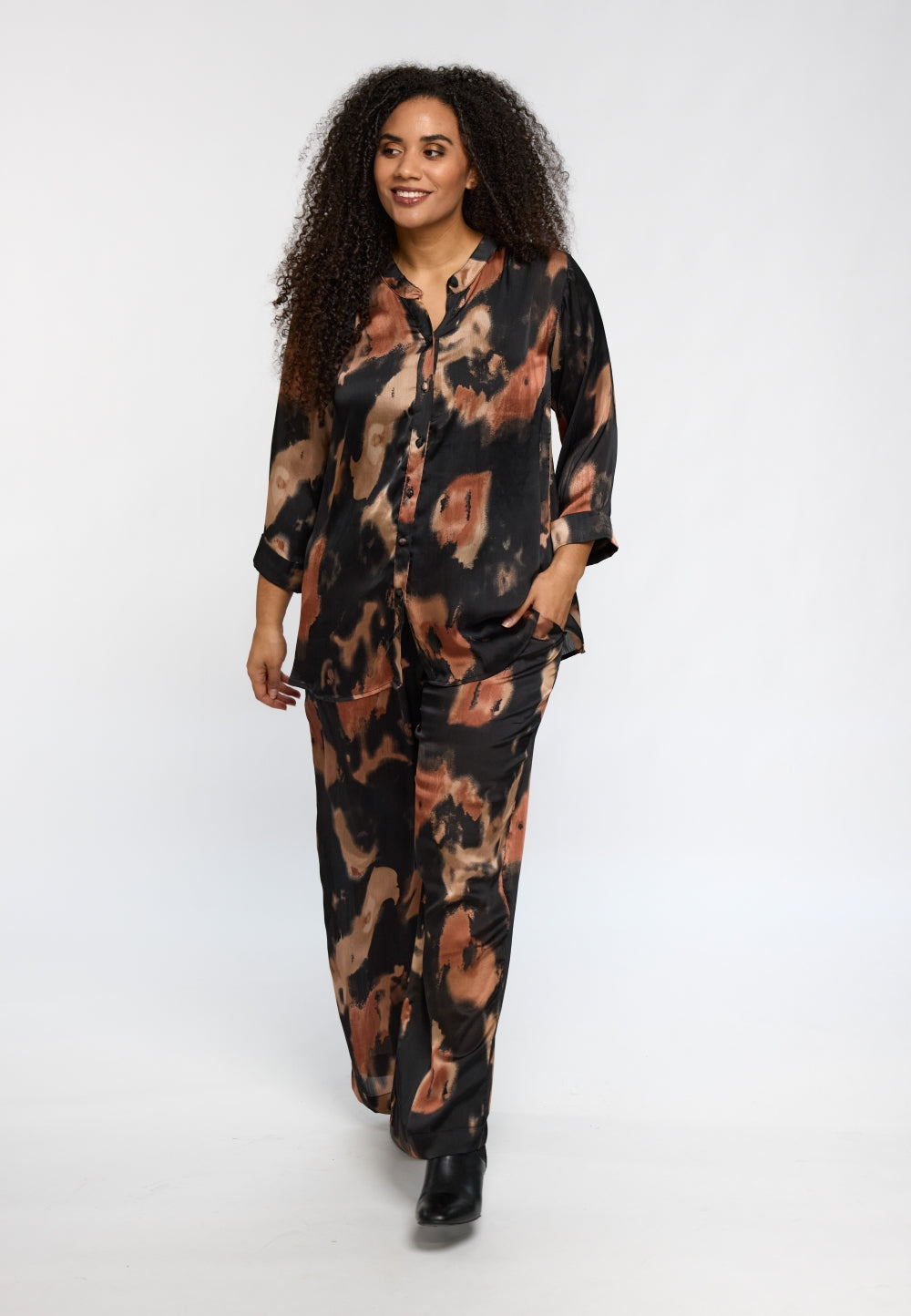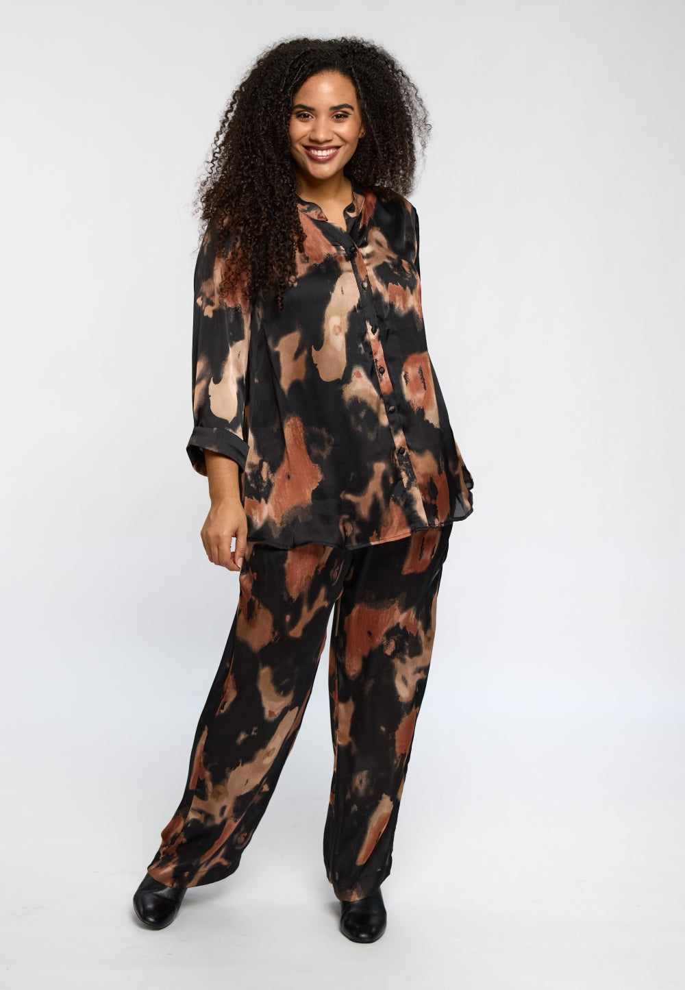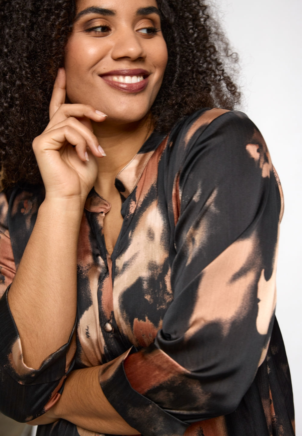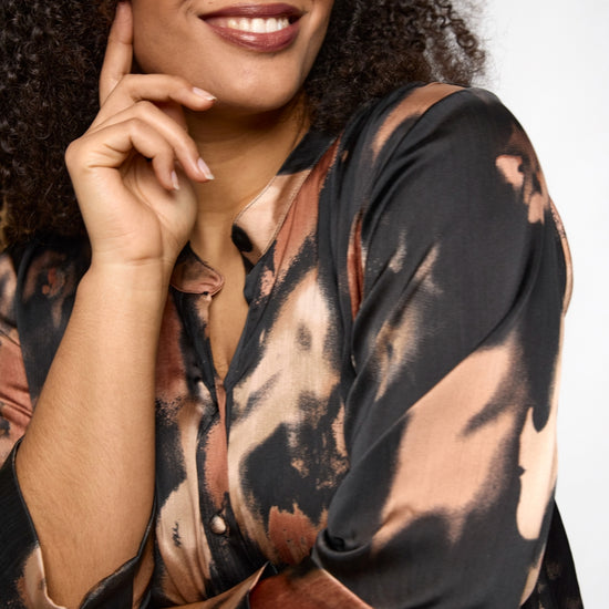Skab et moderne og stilfuldt udtryk med denne skjorte fra Studio. Skjorten er lavet i 100% polyester og har et flot, abstrakt mønster i sorte og brune nuancer. Designet kombinerer klassisk skjortekrave og knaplukning foran med en lige pasform og et elegant fald, der klæder alle former.