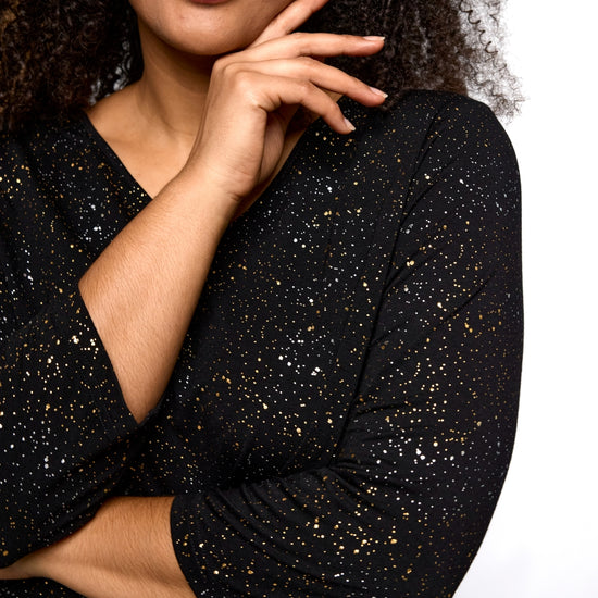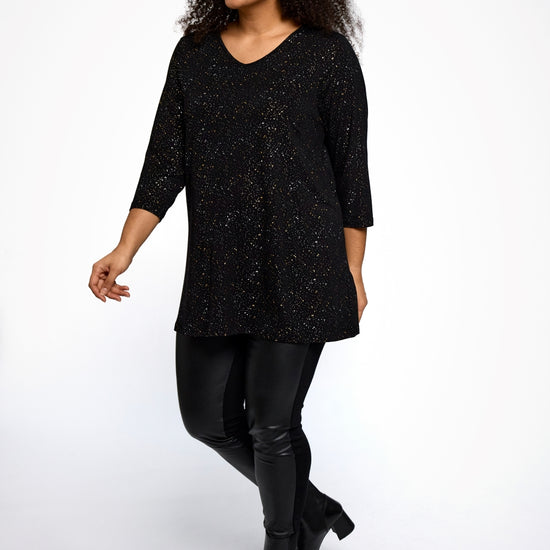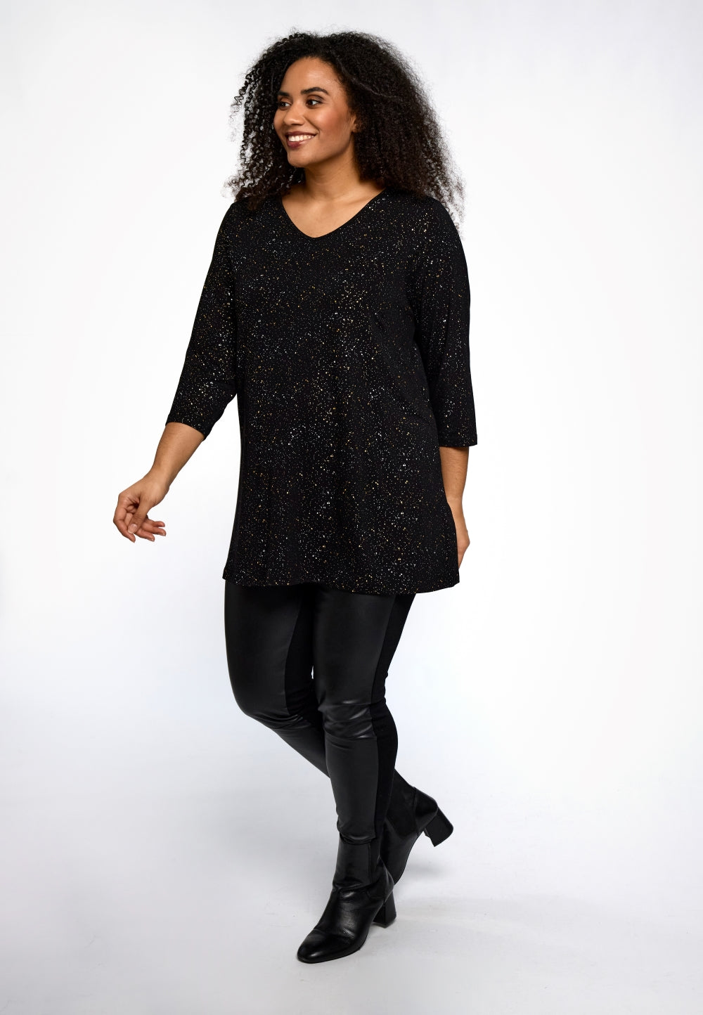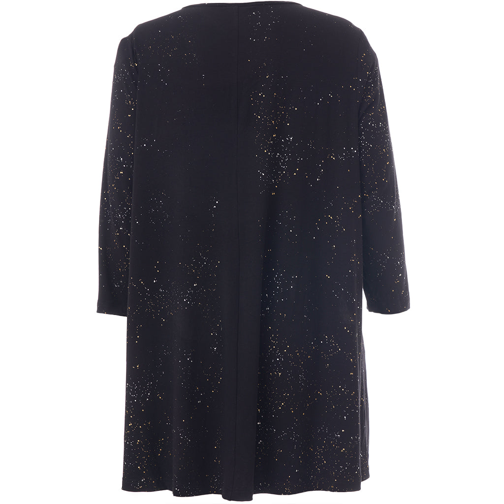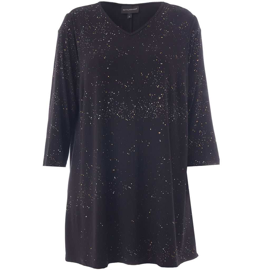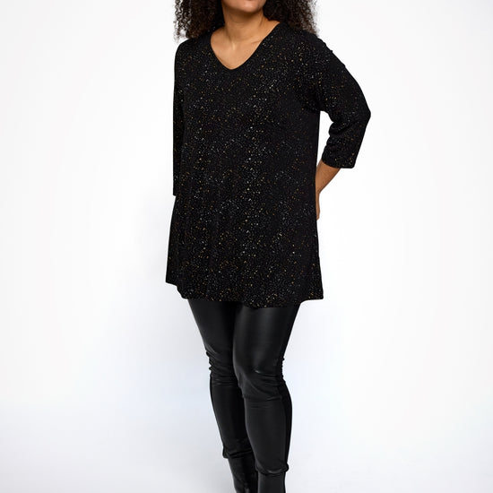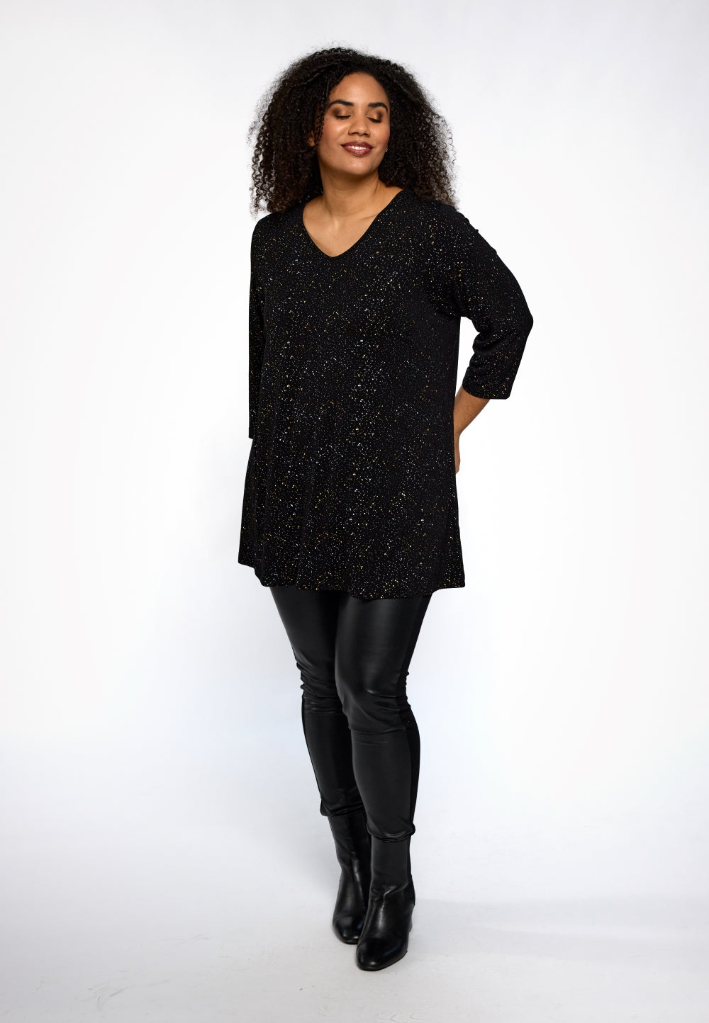 En tunika der kombinerer komfort og festlig elegance. Denne model fra Studio er fremstillet i blød viskose med stretch, som giver en behagelig og fleksibel pasform. Designet er klassisk sort med diskrete sølv- og gulddetaljer, der tilfører et feminint og moderne udtryk. Vigtige detaljer: