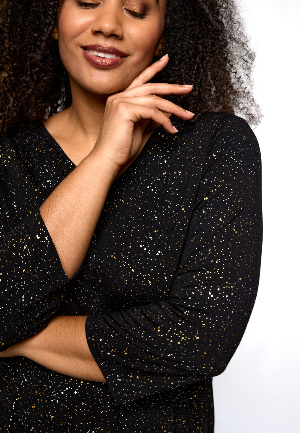 Med sit bløde materiale og elegante detaljer er denne tunika et oplagt valg, uanset om du skal på arbejde eller til fest. Den flatterende pasform og de glimtende prikker gør den nem at style op eller ned. Se flere styles fra Studio eller opdag vores udvalg af plus size bluser til enhver anledning.
