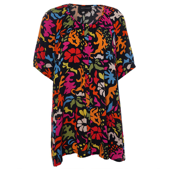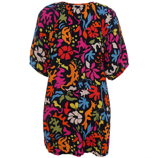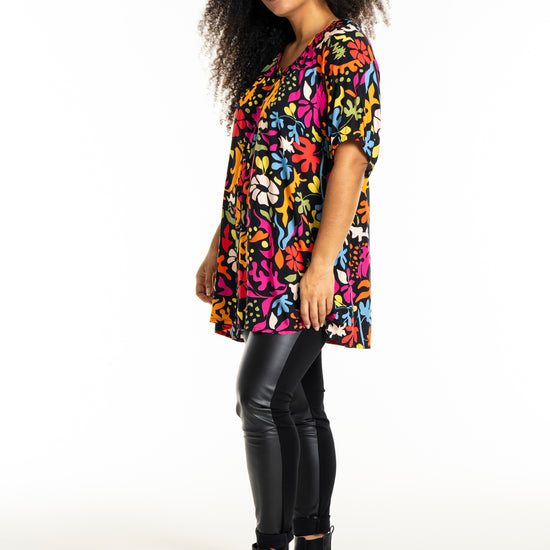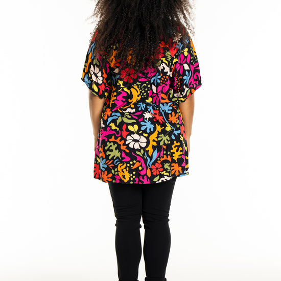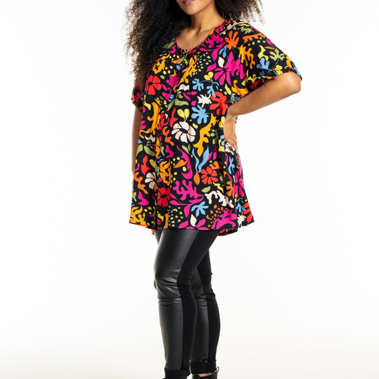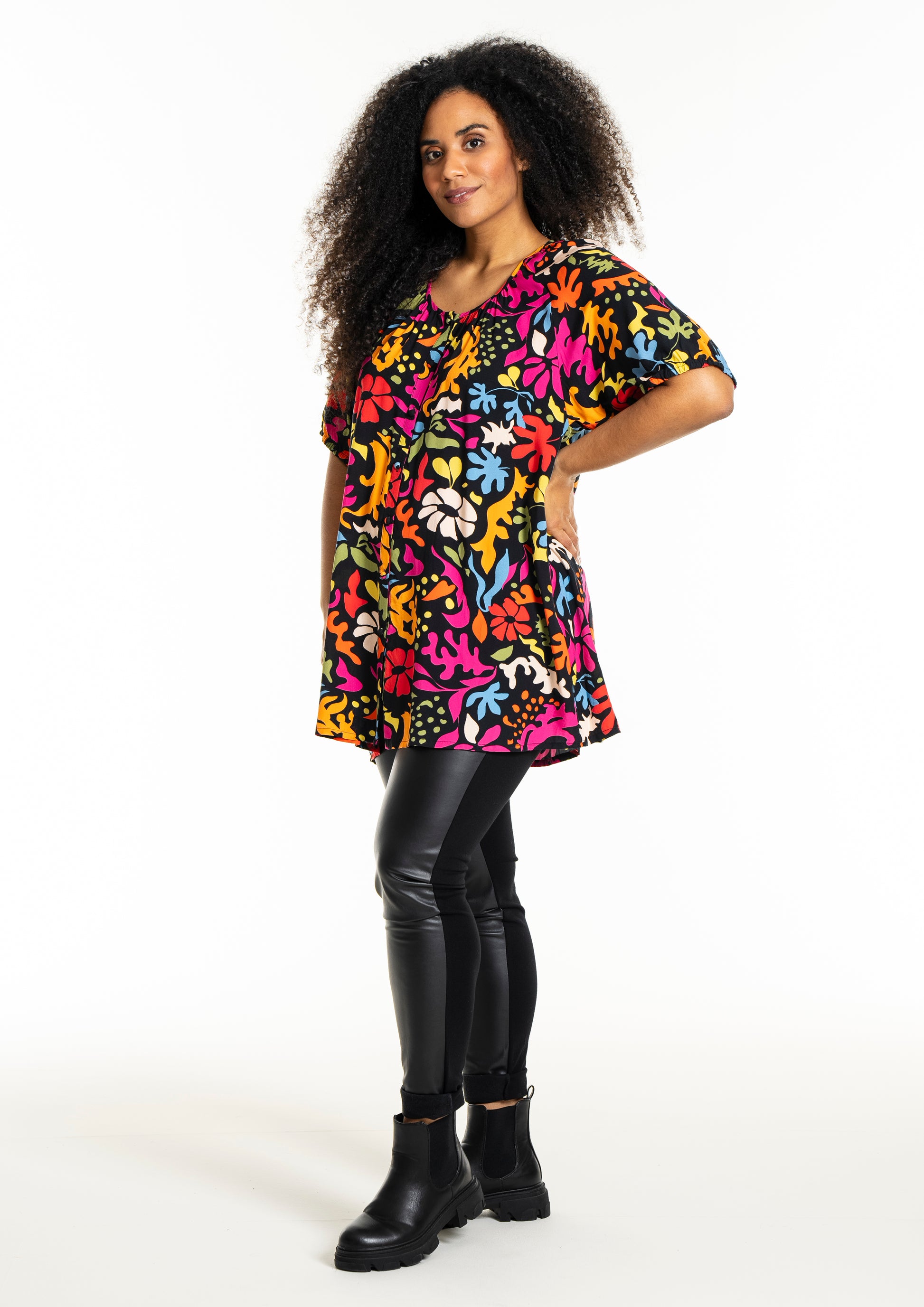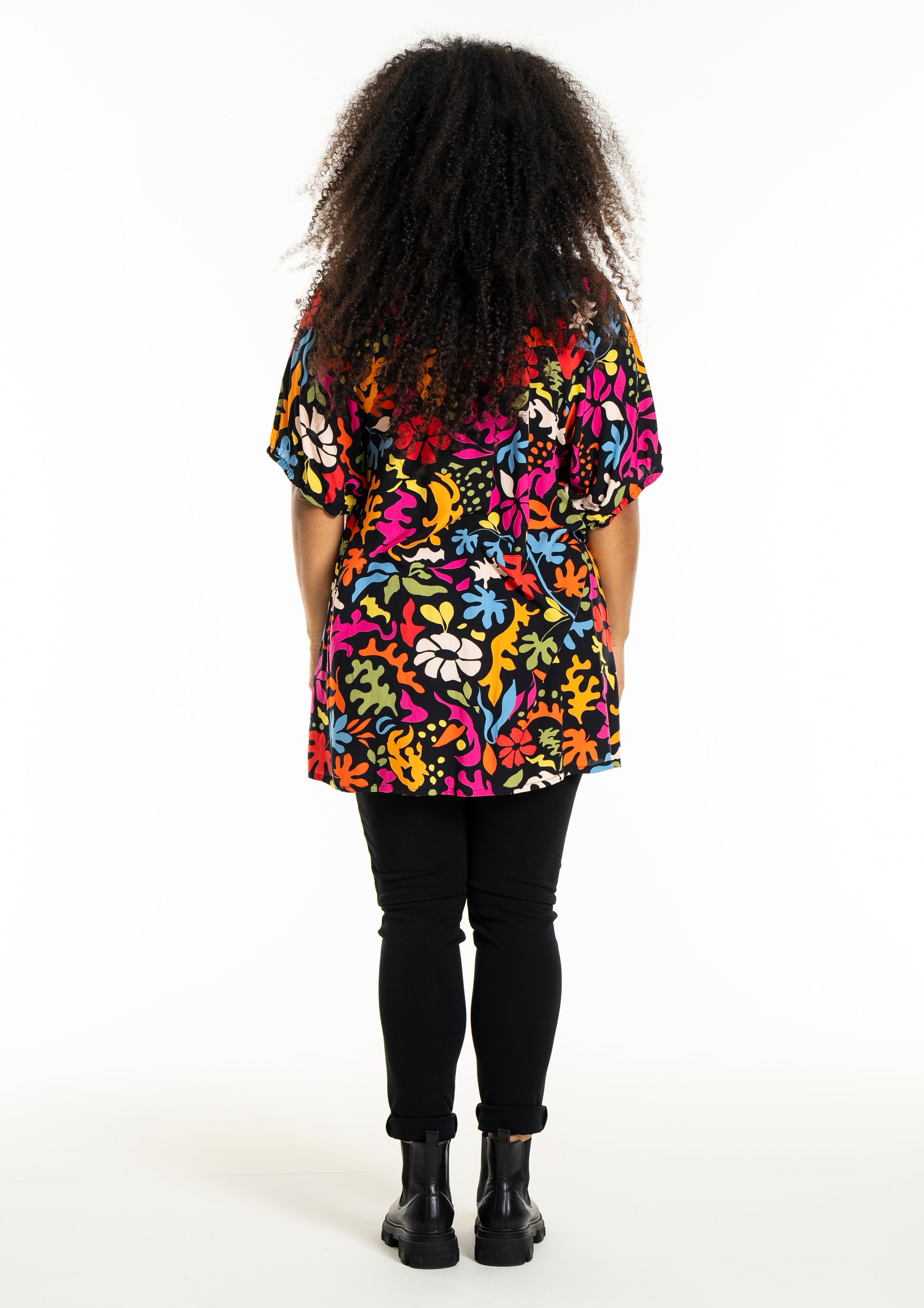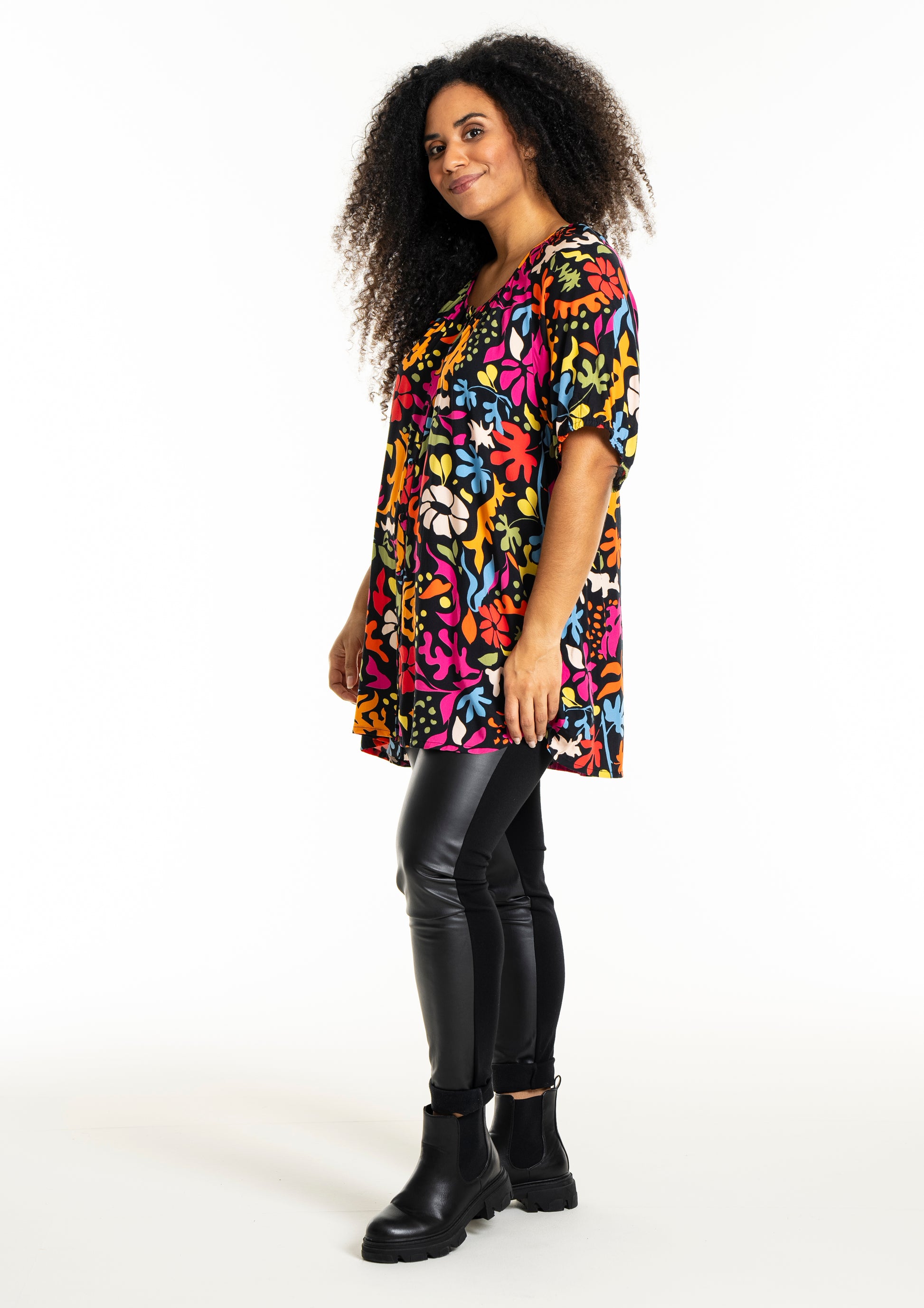 Det livlige mønster består af store, abstrakte blomster og blade i en bred vifte af farver, hvilket giver tunikaen et kunstnerisk udtryk. Med trekvartlange ærmer og en rund halsudskæring er den både praktisk og stilfuld. Denne tunika er ideel til at bære over leggings eller smalle bukser for en flatterende silhuet.