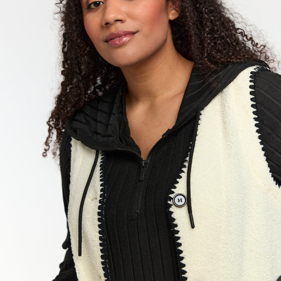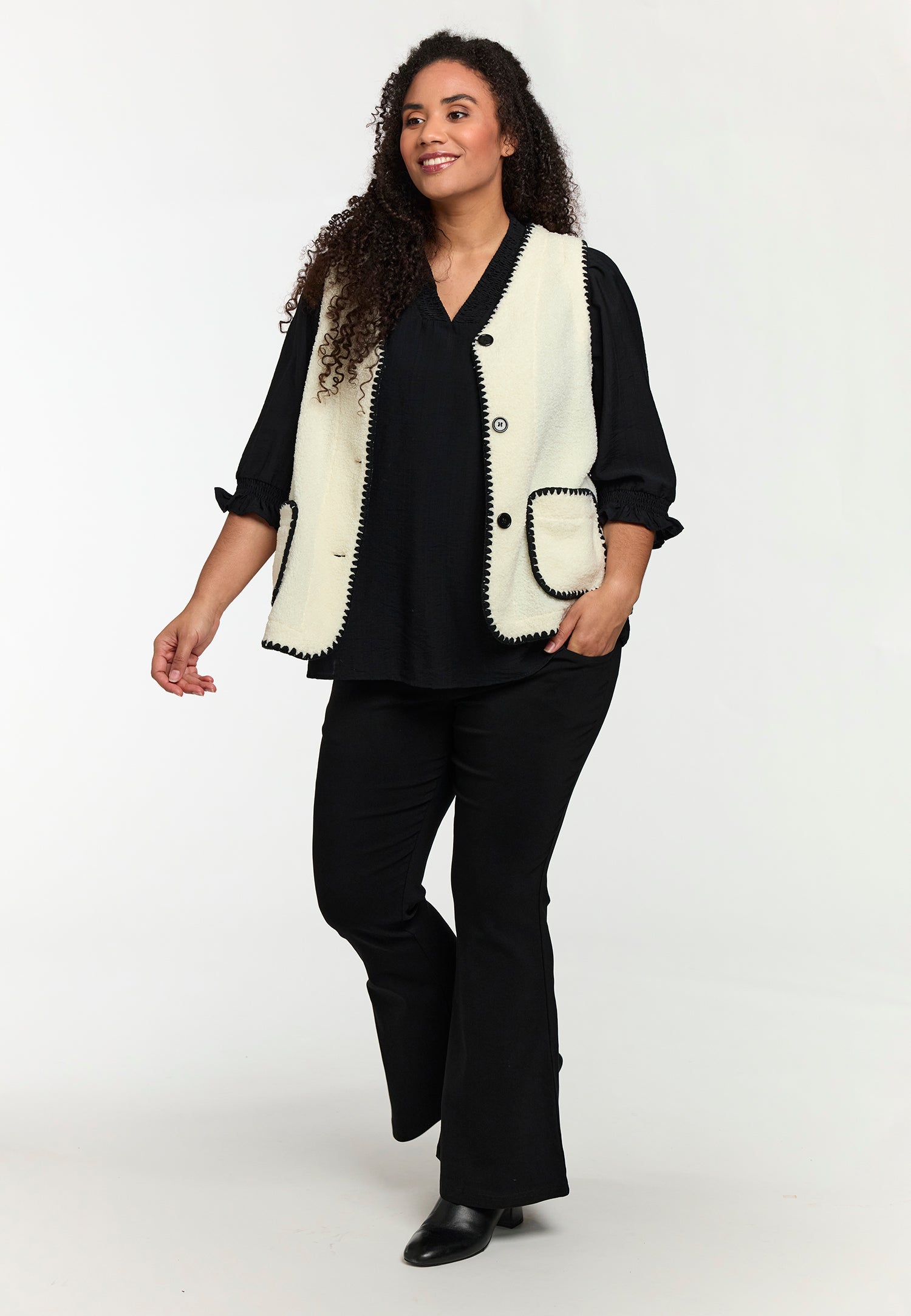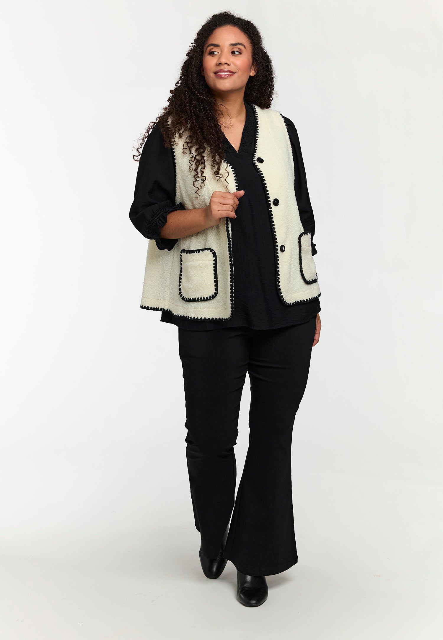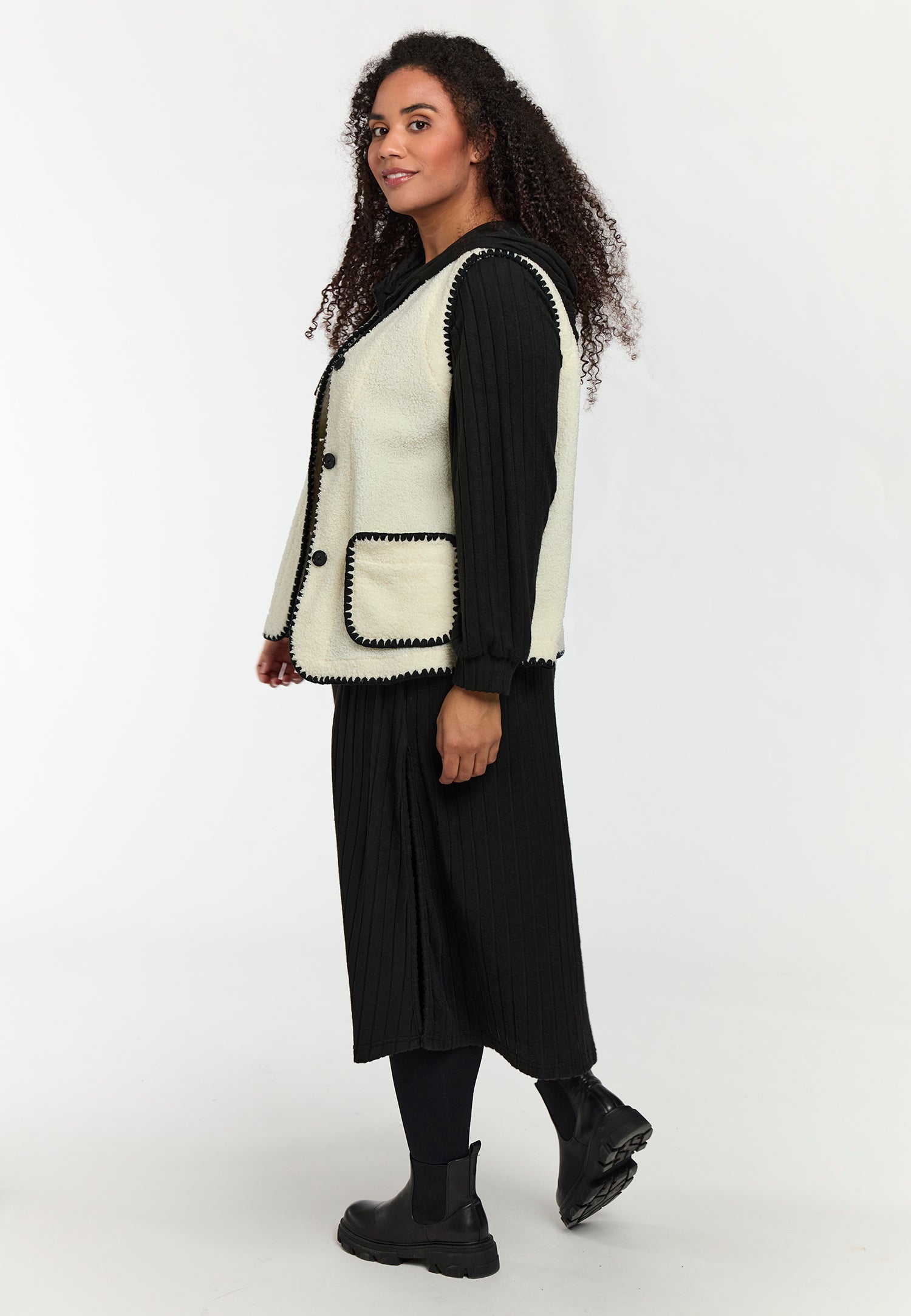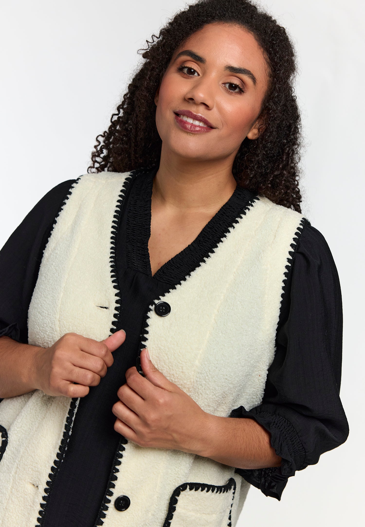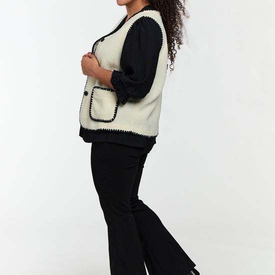 Denne lækre vest fra Studio er det oplagte valg til at skabe et moderne og hyggeligt lag-på-lag look. Den er fremstillet i en utrolig blød teddy-kvalitet, der giver varme og komfort, mens designet fremhæves af de smarte sorte dekorsyninger langs kanterne.
