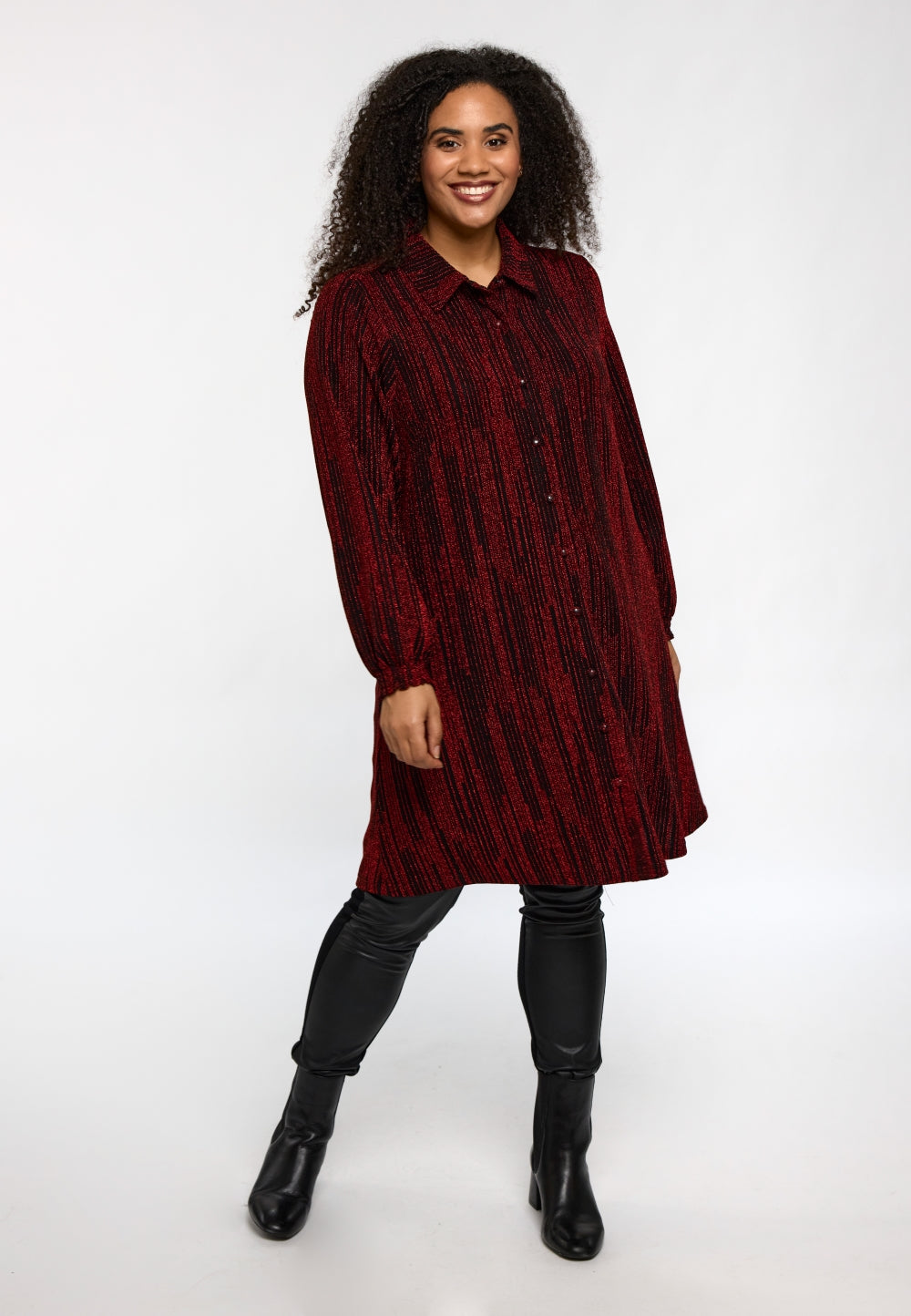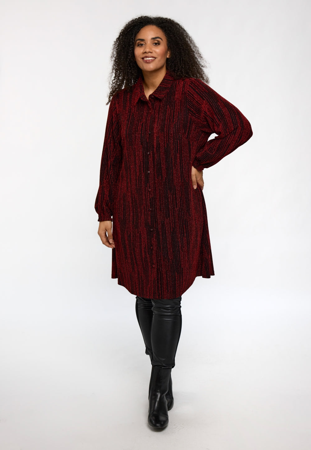 Det lette og elastiske materiale gør skjorten ideel til særlige anledninger eller når outfittet skal have et eksklusivt touch. Brug den som skjortekjole eller style den med et par plus size leggings eller plus size jeans for et moderne udtryk.