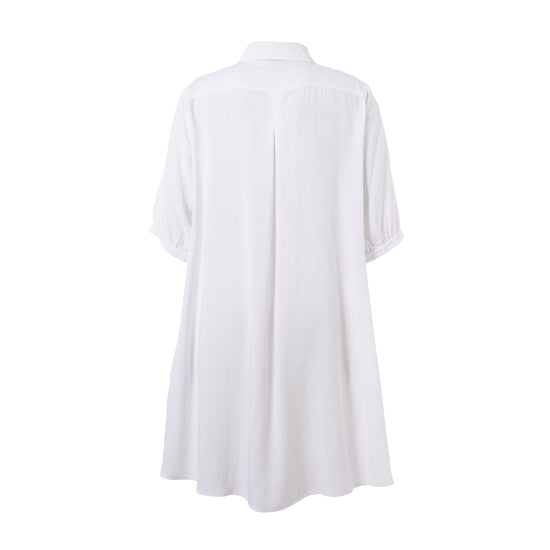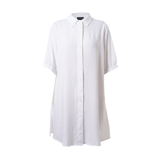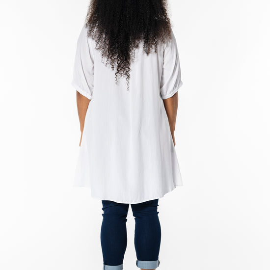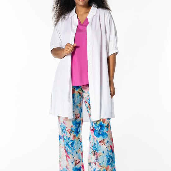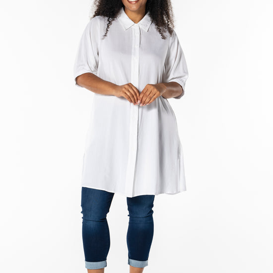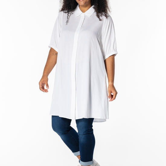 Tunikaen har en afslappet pasform, der giver både komfort og elegance. Den er alsidig nok til at passe til forskellige anledninger, fra afslappede hverdage til mere formelle arrangementer. Den gennemgående knaplukning foran gør det nemt at justere stilen og komforten.
