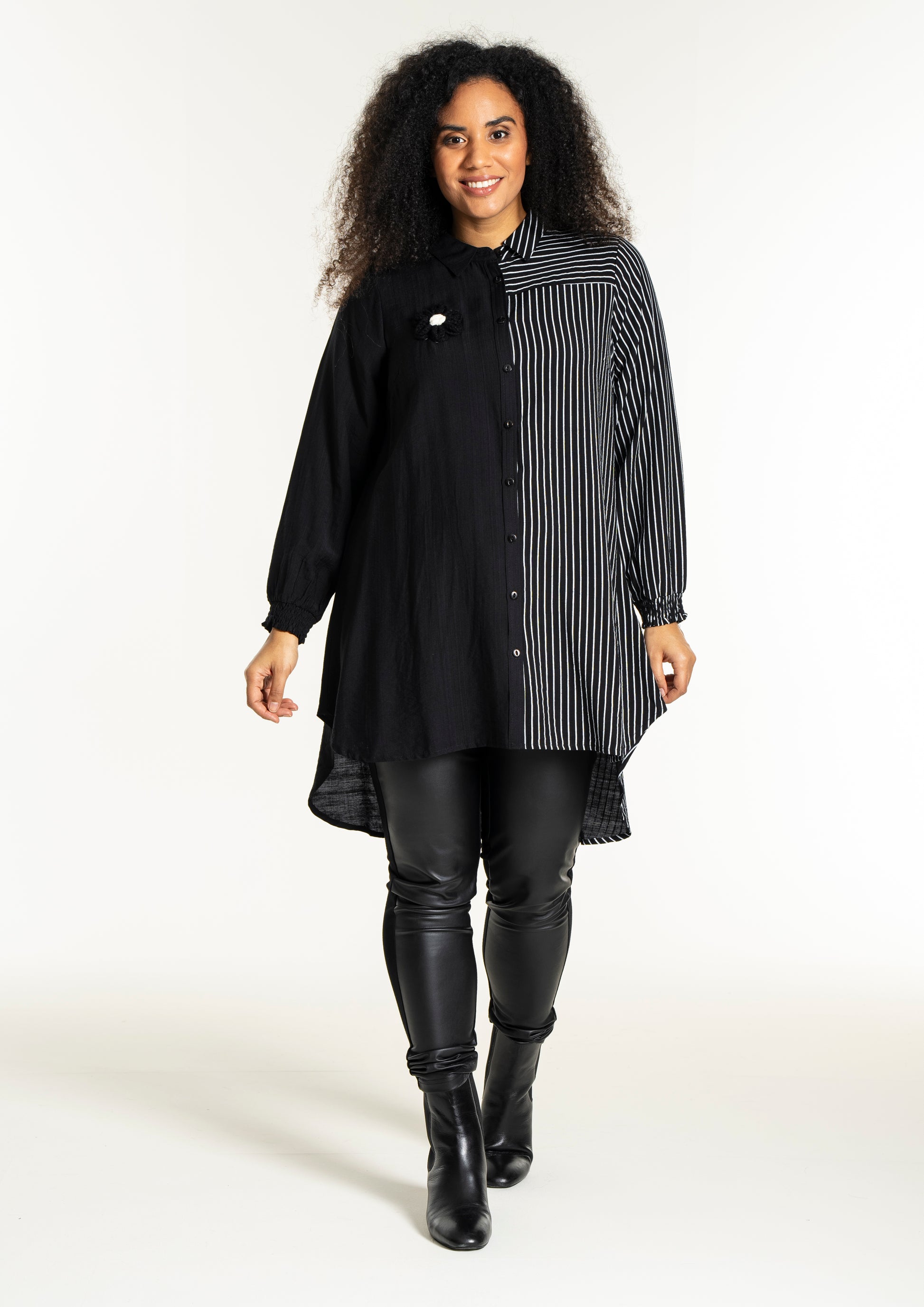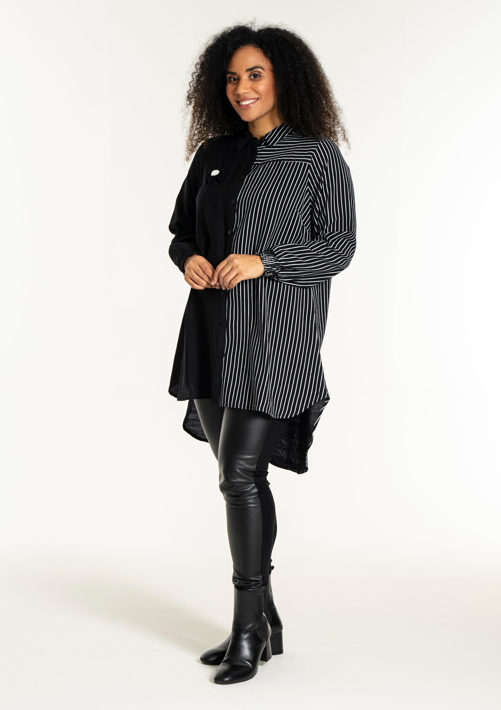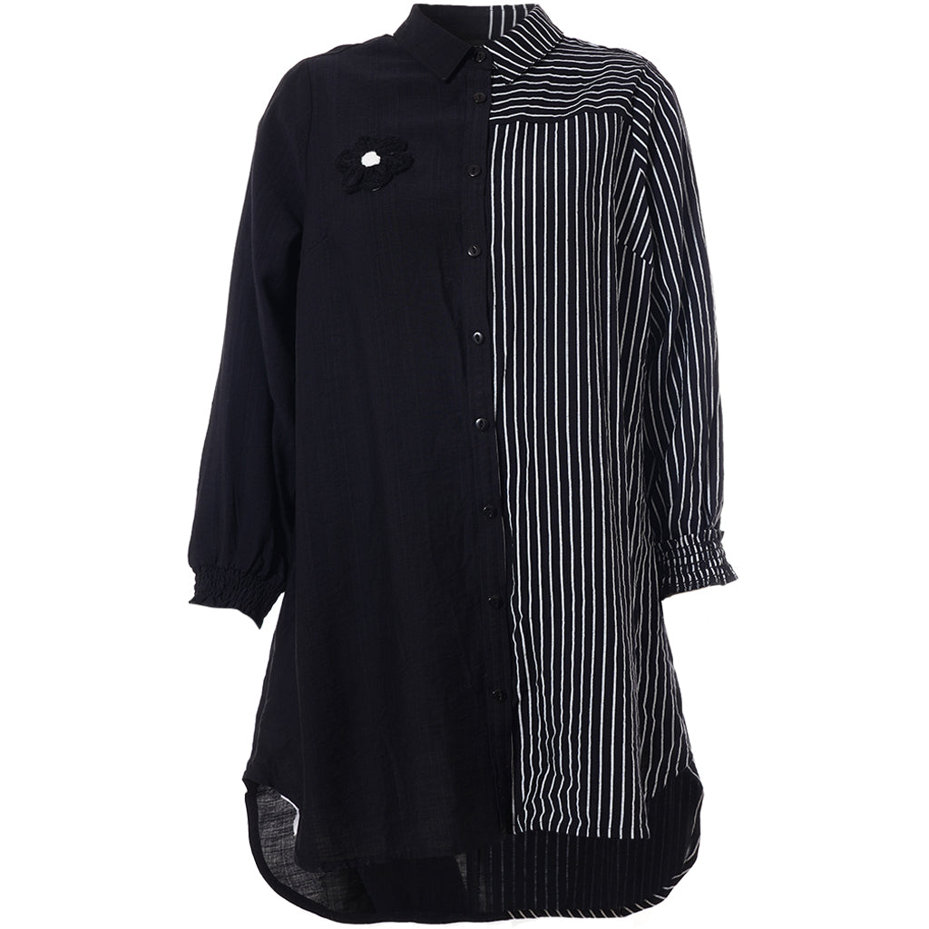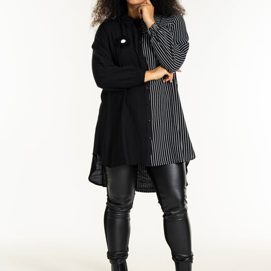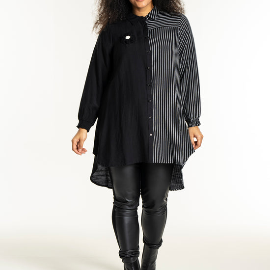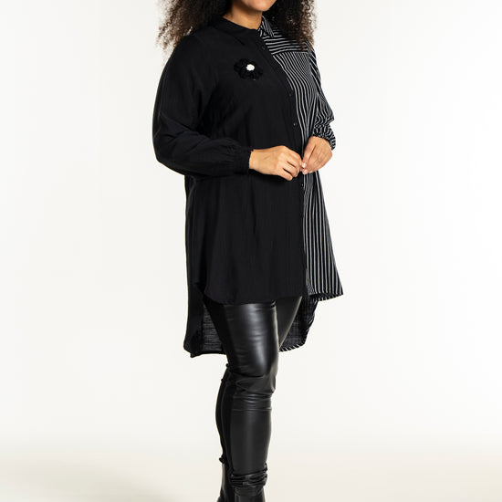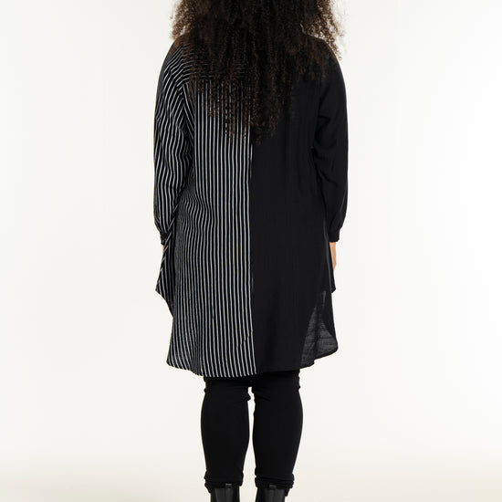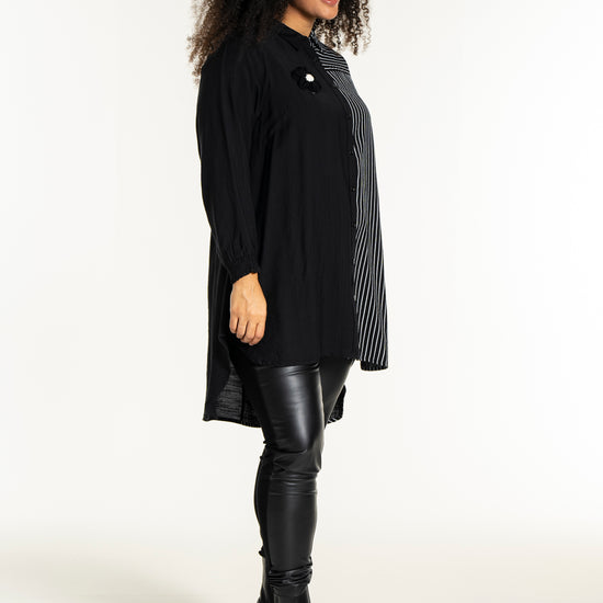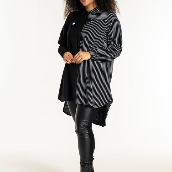 Gør dit outfit ekstraordinært med denne moderne skjorte fra Studio, der kombinerer elegance og komfort. Skjorten er fremstillet i en blød blanding af 80% viskose og 20% nylon, hvilket sikrer en behagelig pasform og holdbarhed. Designet er en harmonisk fusion af solid sort og kontrasterende striber, der løber både lodret og vandret. Den klassiske krave og den fulde knaplukning foran bidrager til et tidløst look, mens den asymmetriske længde tilføjer et trendy twist.