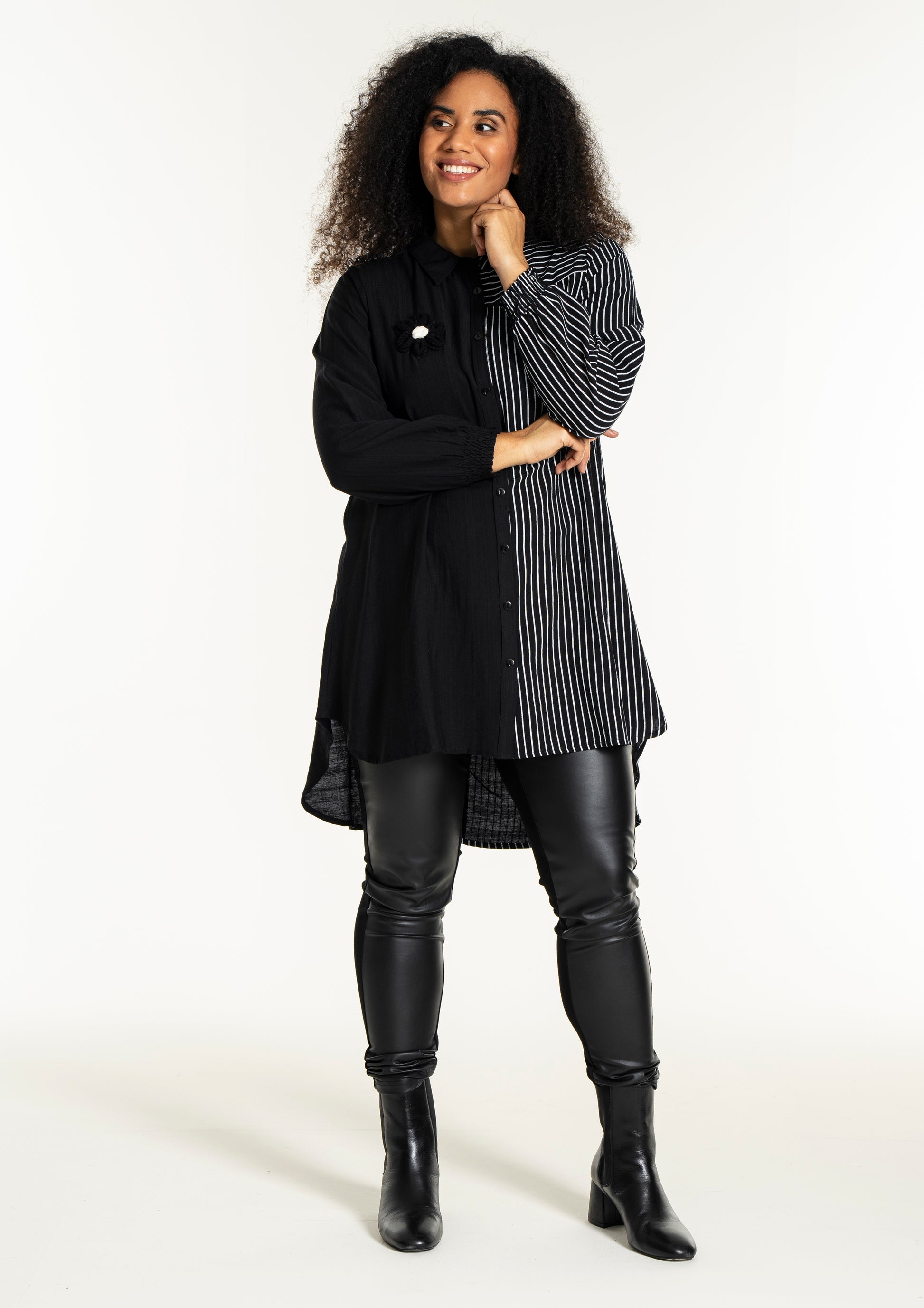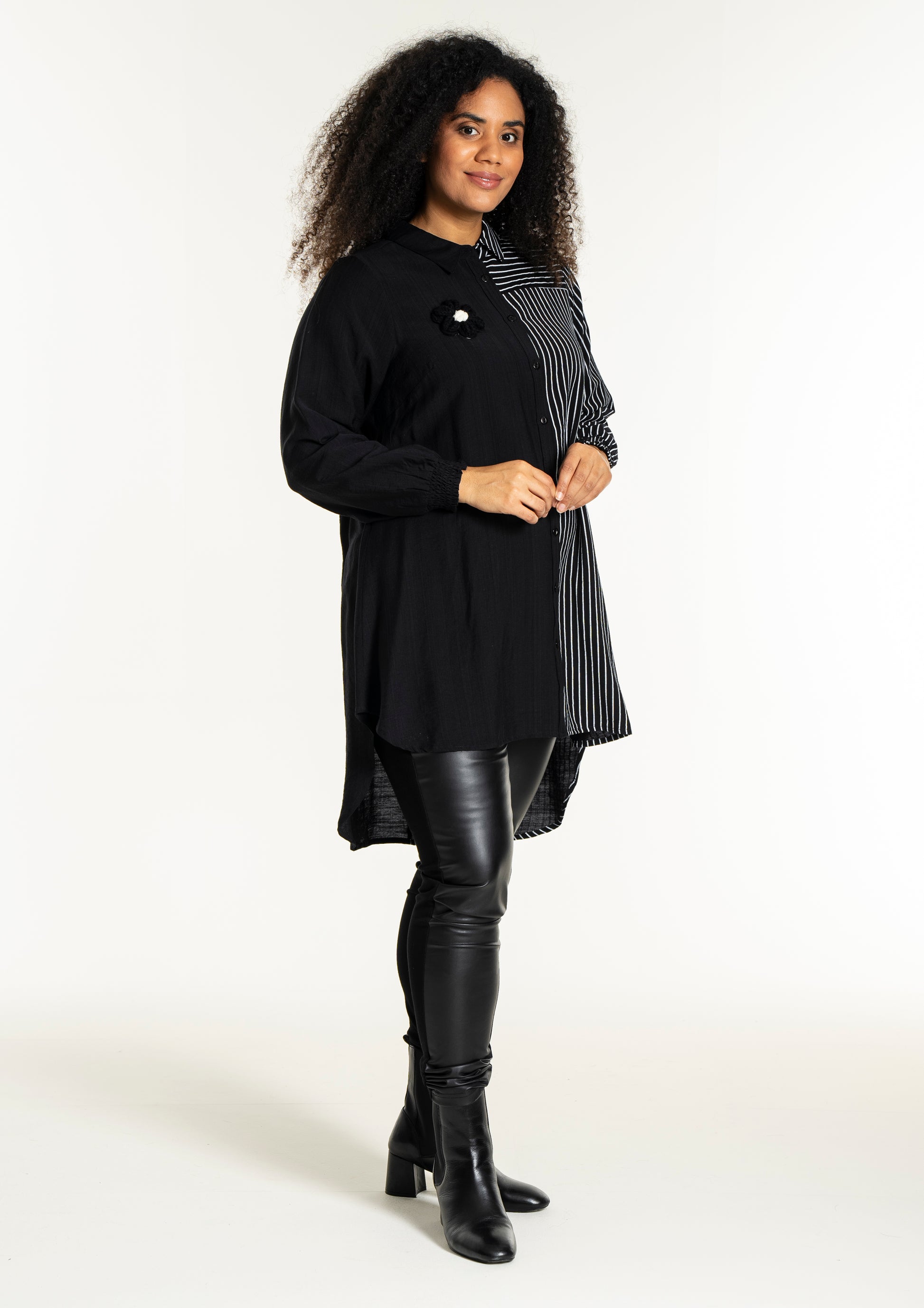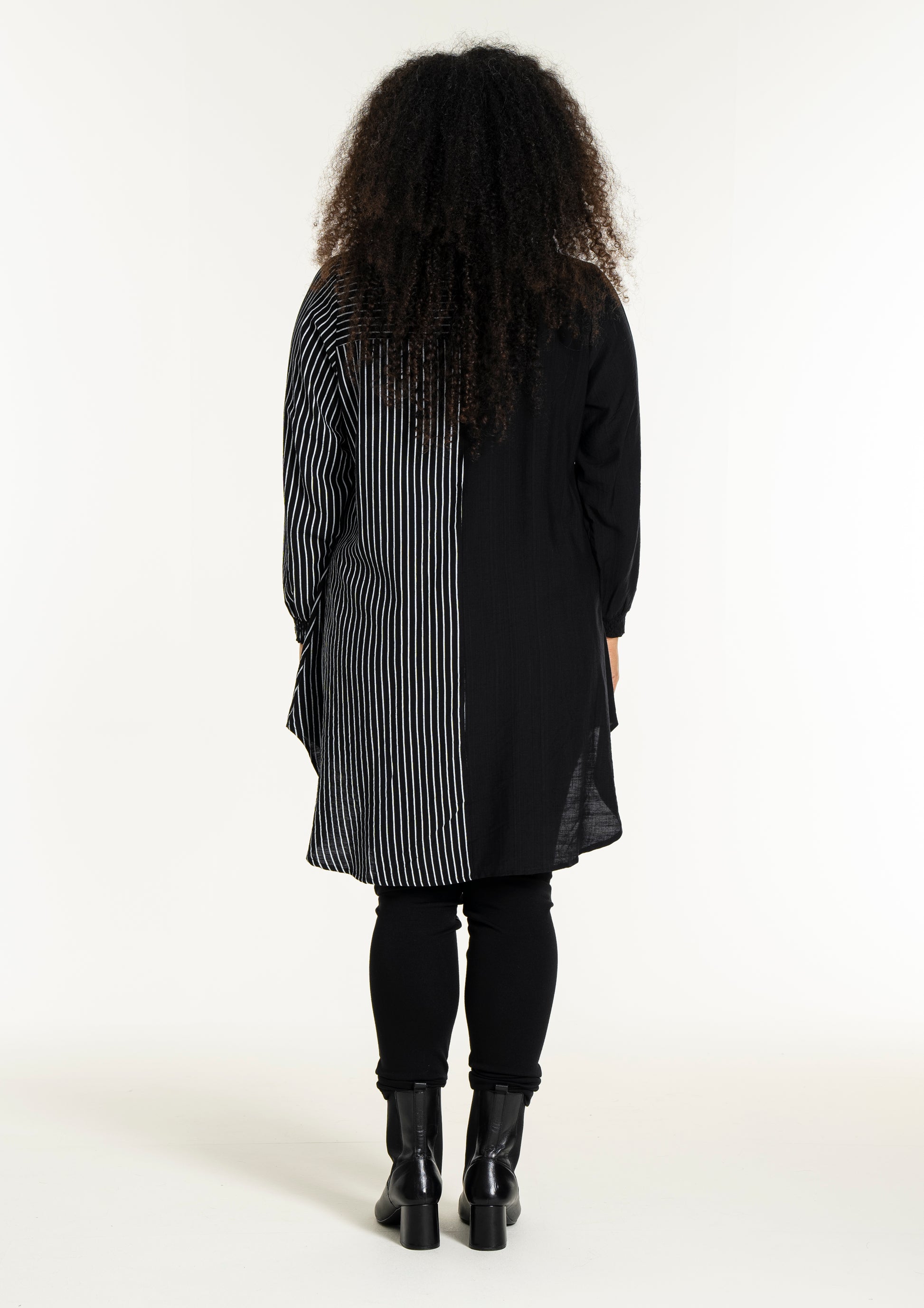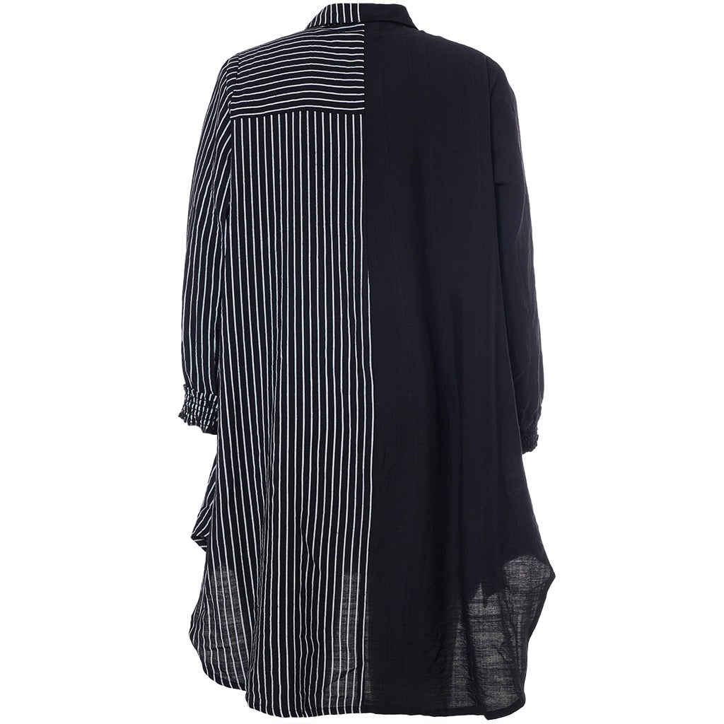 Gør dit outfit ekstraordinært med denne moderne skjorte fra Studio, der kombinerer elegance og komfort. Skjorten er fremstillet i en blød blanding af 80% viskose og 20% nylon, hvilket sikrer en behagelig pasform og holdbarhed. Designet er en harmonisk fusion af solid sort og kontrasterende striber, der løber både lodret og vandret. Den klassiske krave og den fulde knaplukning foran bidrager til et tidløst look, mens den asymmetriske længde tilføjer et trendy twist.