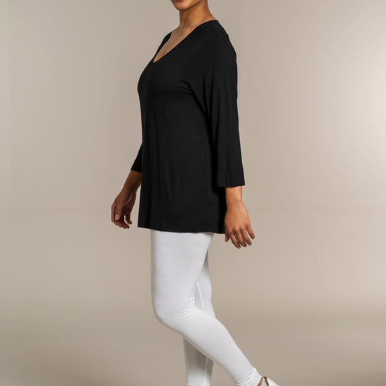 Enkel, stilfuld og utrolig behagelig – denne T-shirt fra Sandgaard er et must-have i enhver garderobe. Blusen er fremstillet i en blød og strækbar kvalitet af 95% viskose og 5% elastan, hvilket sikrer høj komfort hele dagen. Den har en flot V-udskæring, 3/4-lange ærmer og en let A-formet pasform, der smigrer de fleste silhuetter.