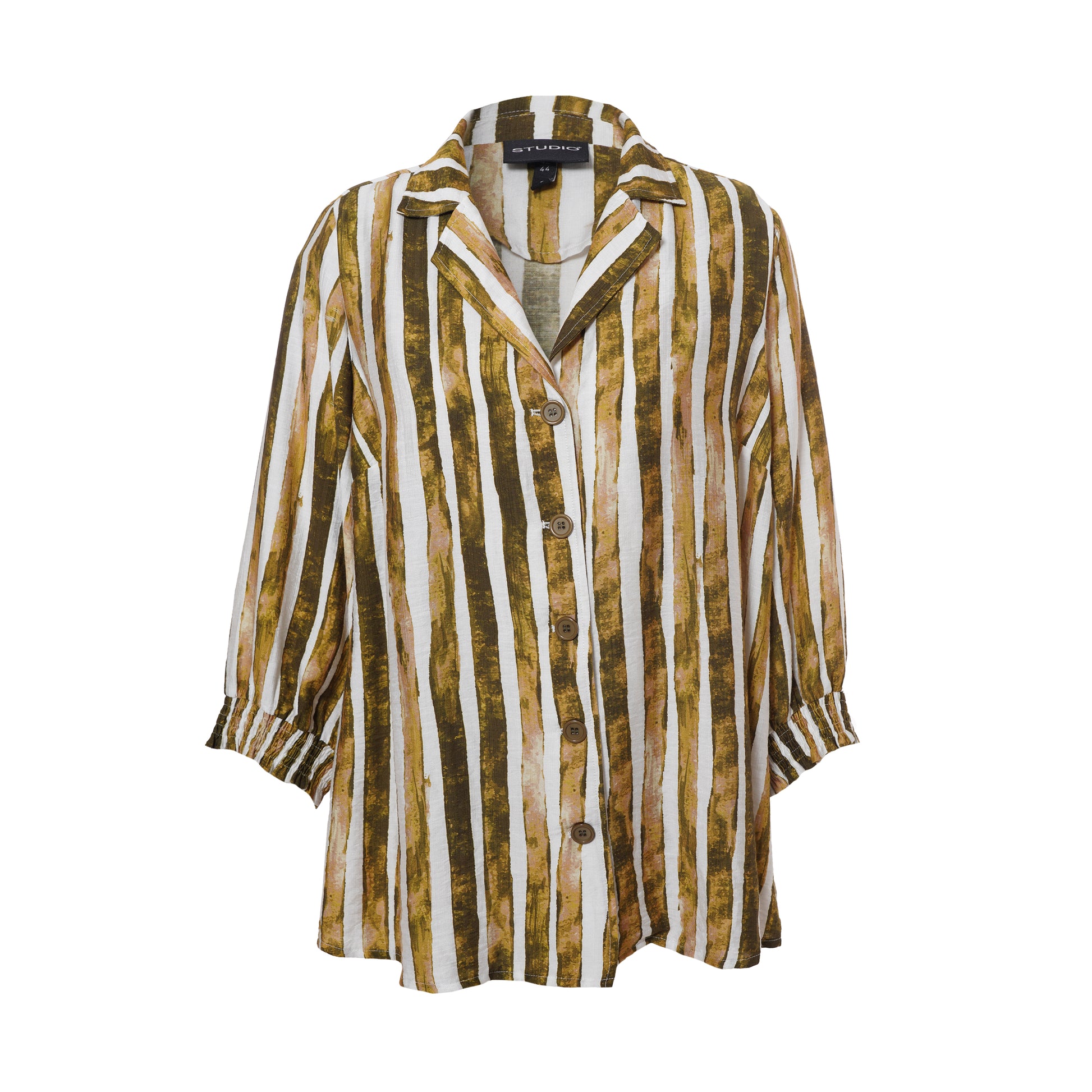 Denne flotte skjorte fra Studio er designet med et iøjnefaldende print af striber i hvide og grønlige nuancer, der giver et friskt udtryk. Kvaliteten er en behagelig blanding, der falder let og føles blød mod kroppen, hvilket gør den ideel til hverdagsbrug.