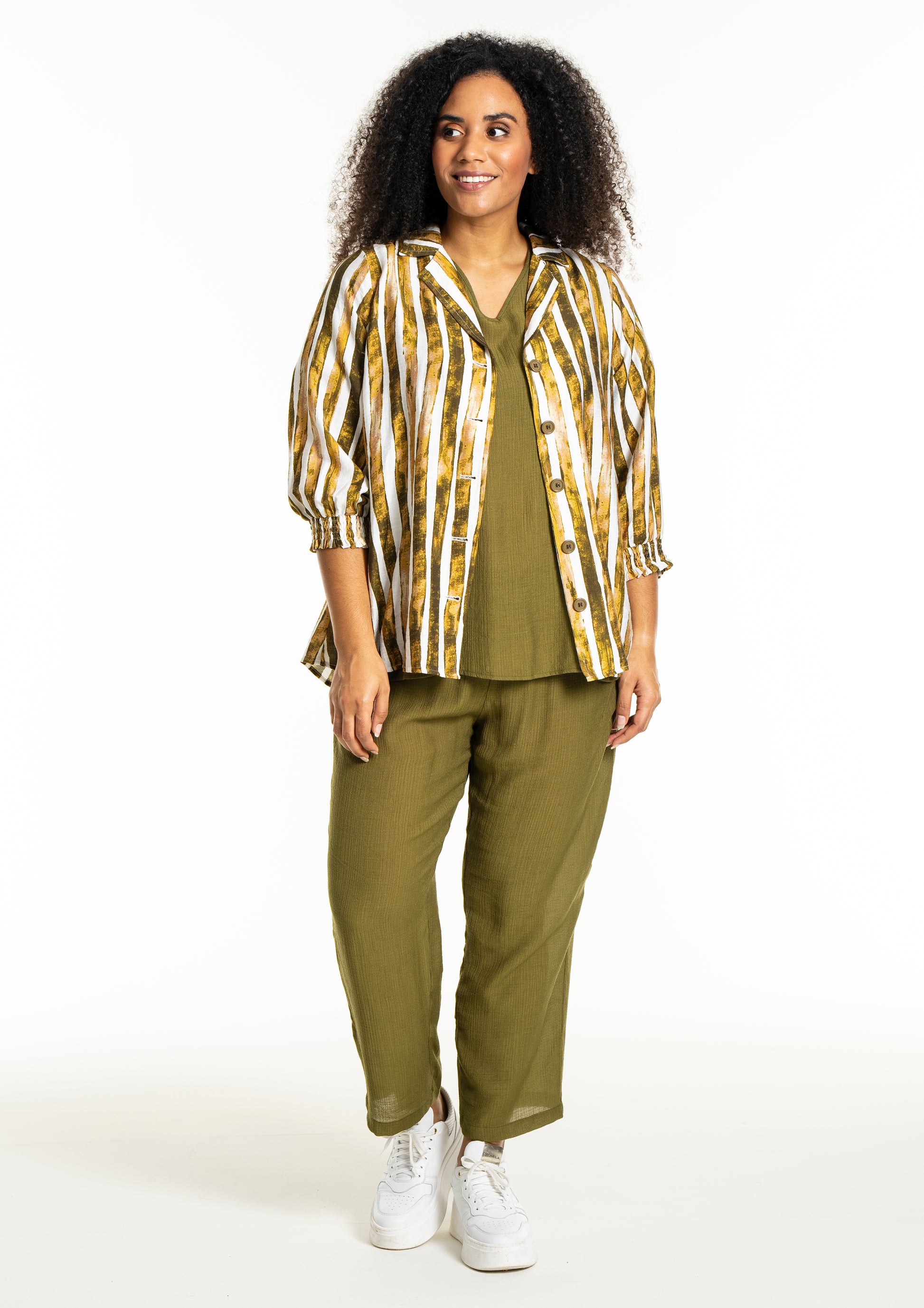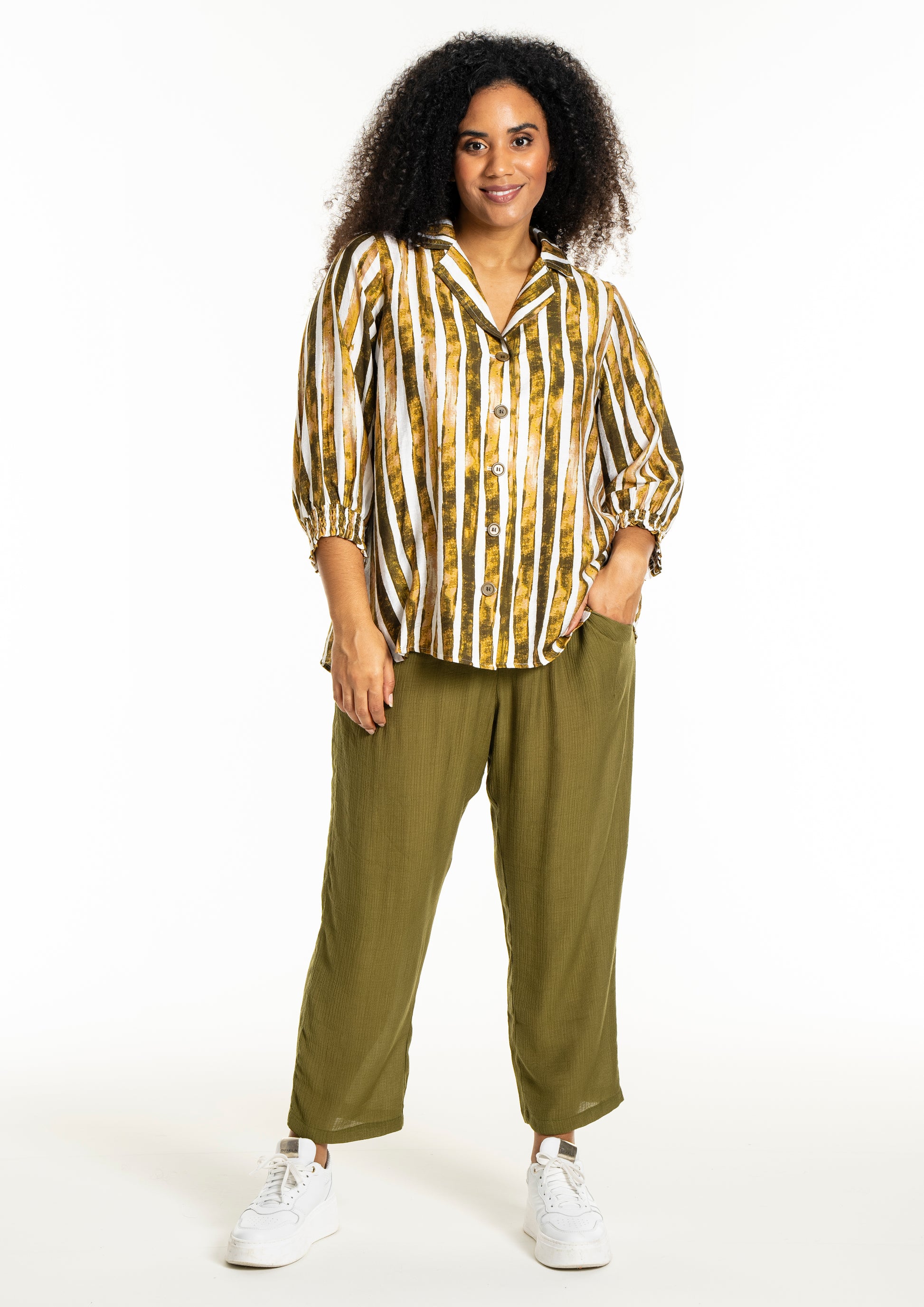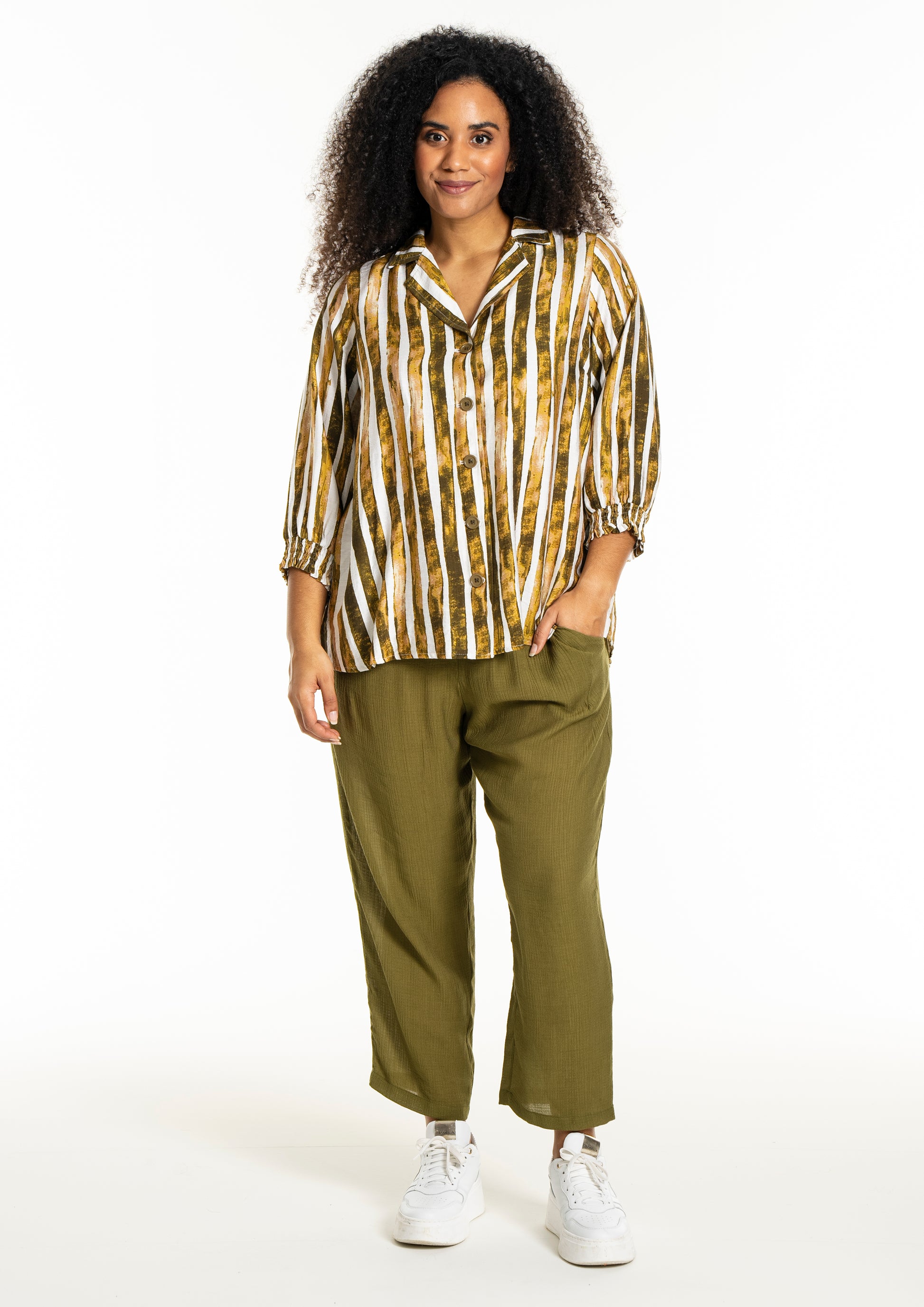 Pasformen er løs og afslappet, hvilket giver god bevægelsesfrihed og sikrer, at skjorten falder pænt omkring kroppen. Du kan style den lukket for et klassisk look eller åben over en top sammen med et par plus size bukser. De karakteristiske ærmer med brede smock-manchetter tilføjer et feminint touch og gør det muligt at trække ærmerne lidt op.