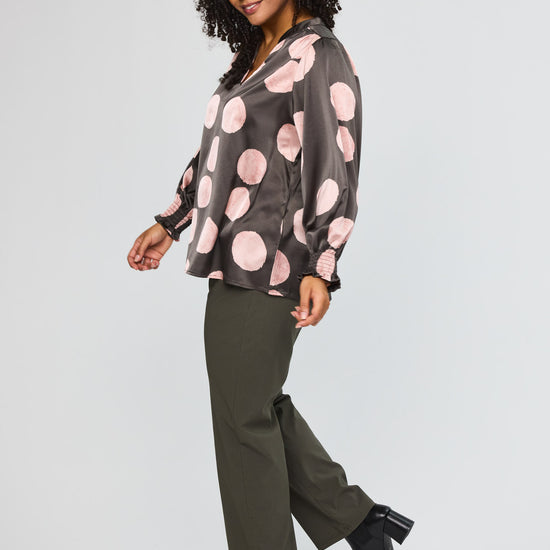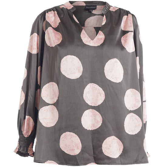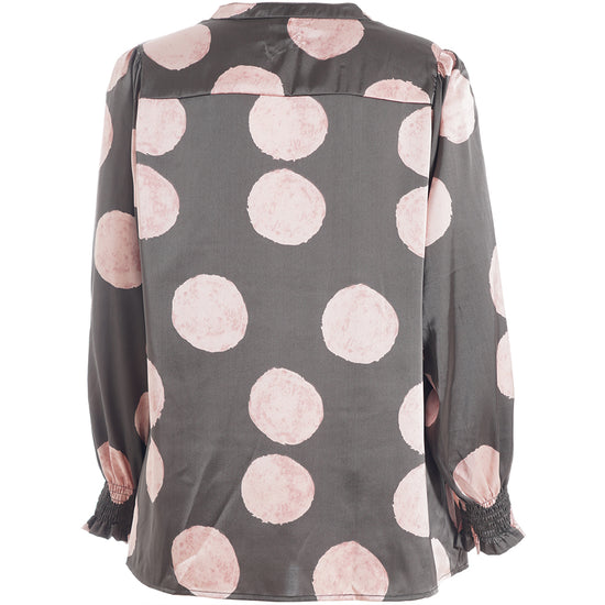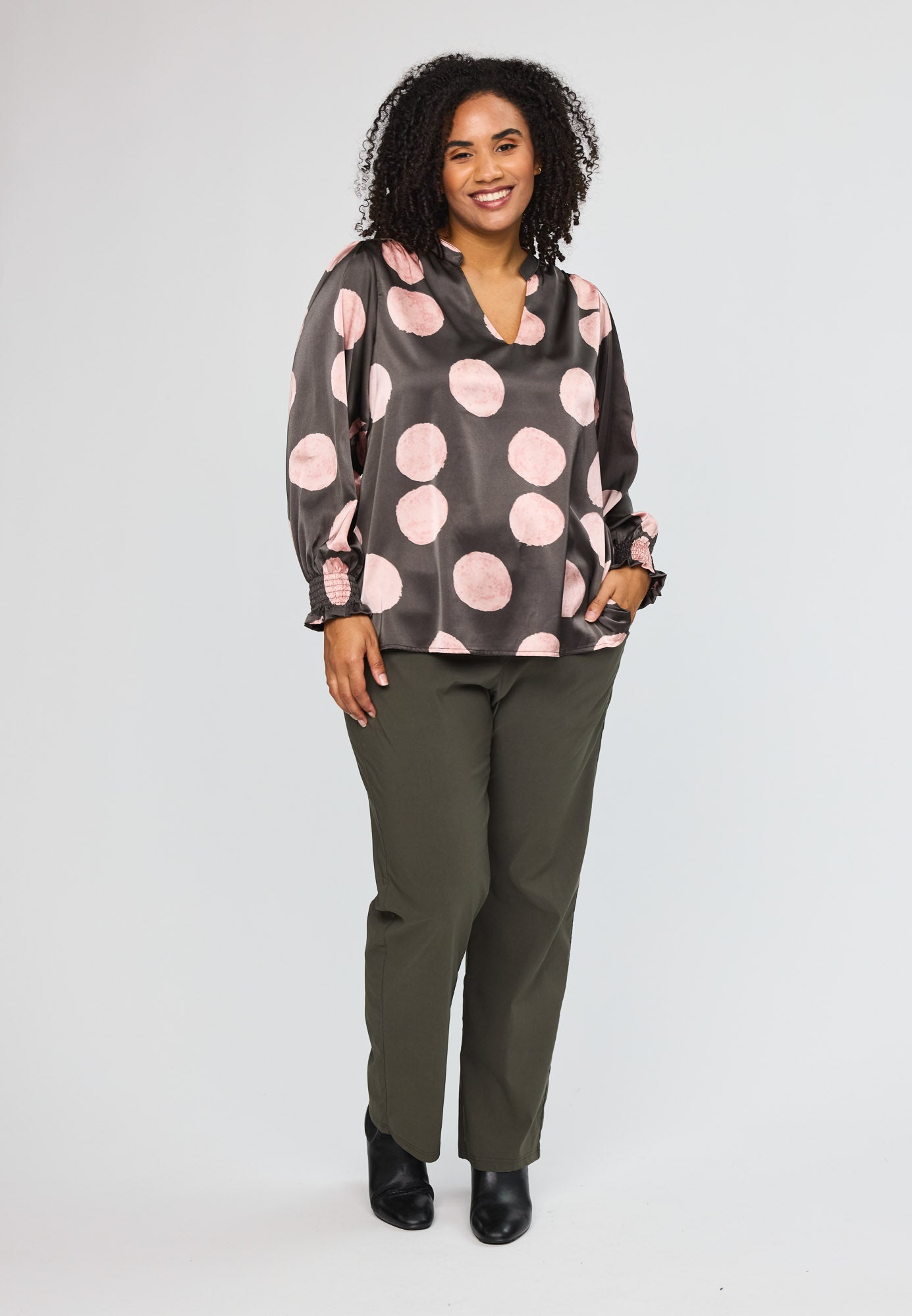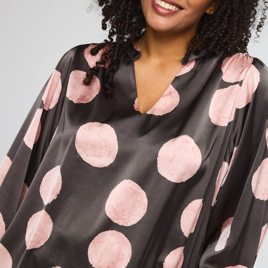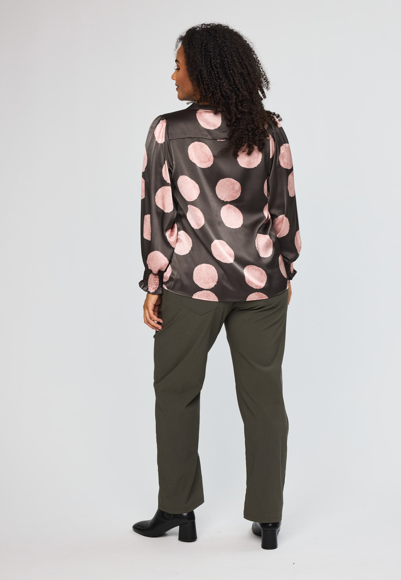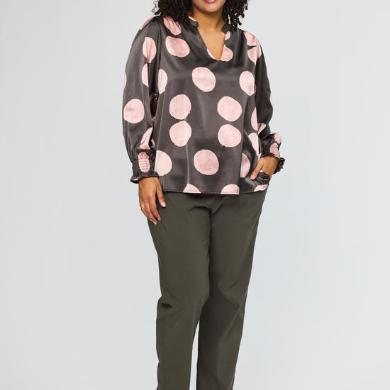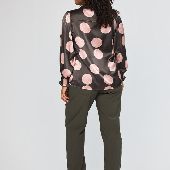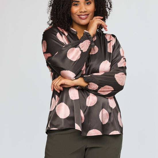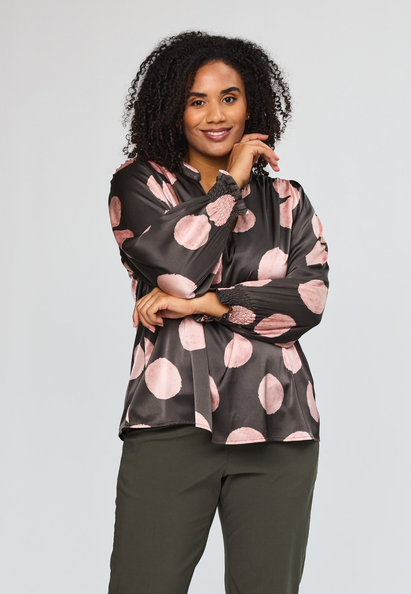 Denne elegante skjorte fra Studio er designet med en sort base og store, iøjnefaldende prikker i en støvet rosa farve, der giver et flot grafisk udtryk. Skjorten har en klædelig V-udskæring med en lille kinakrave samt lange ærmer, der er afsluttet med en dekorativ smock-elastik ved håndleddet for en feminin effekt. Du kan finde flere modeller som denne ved at se vores udvalg af Studio skjorte.