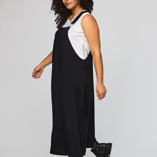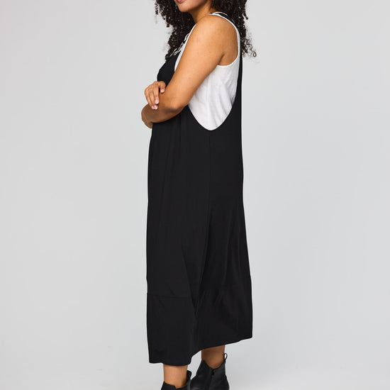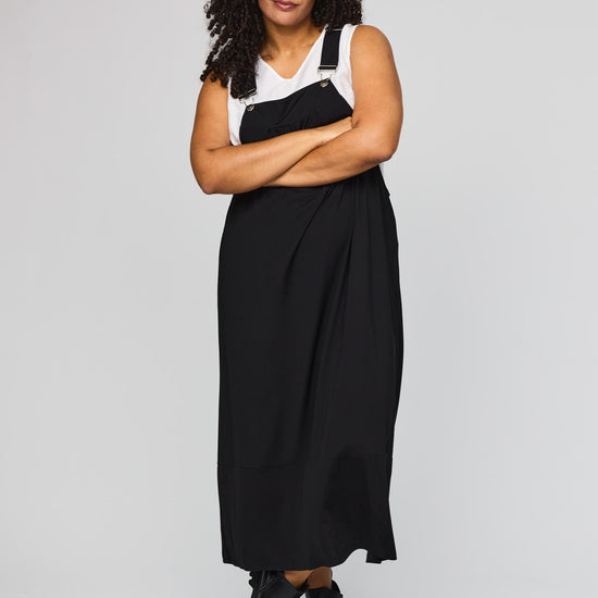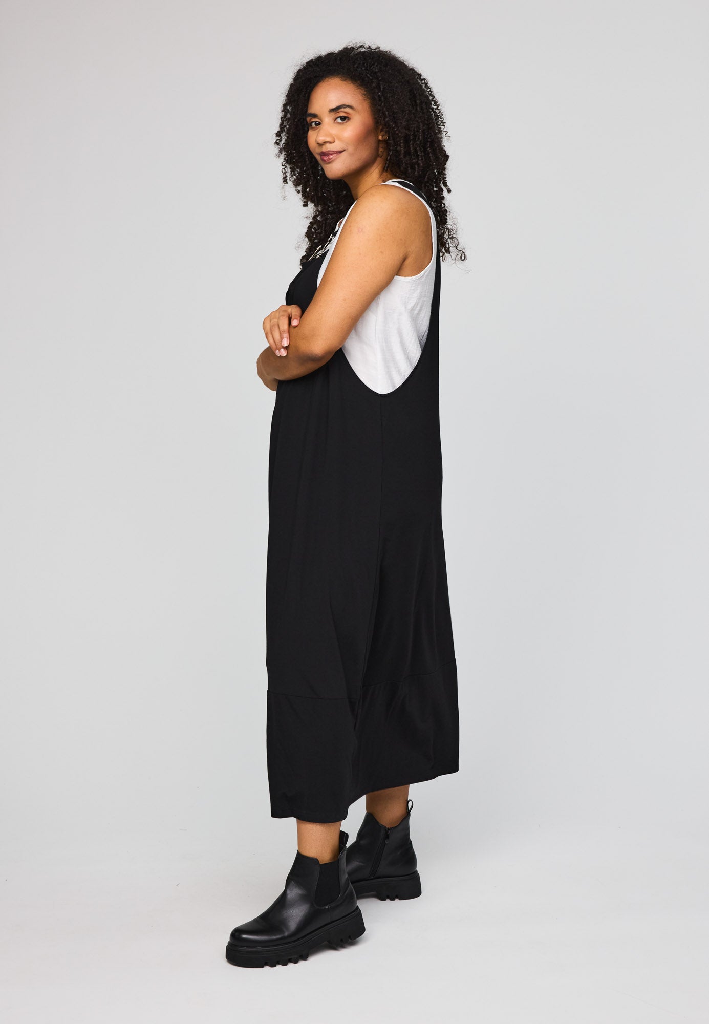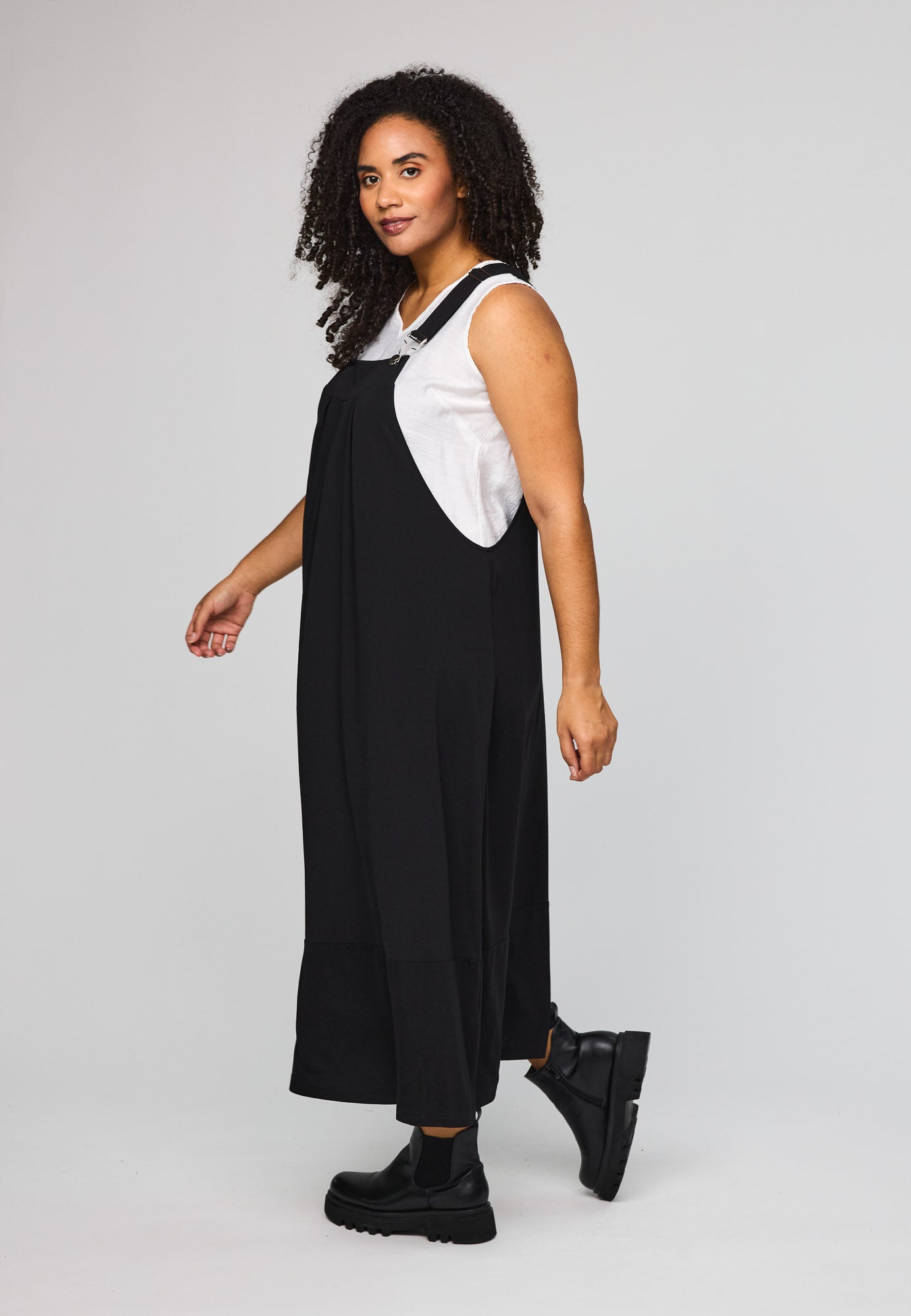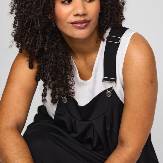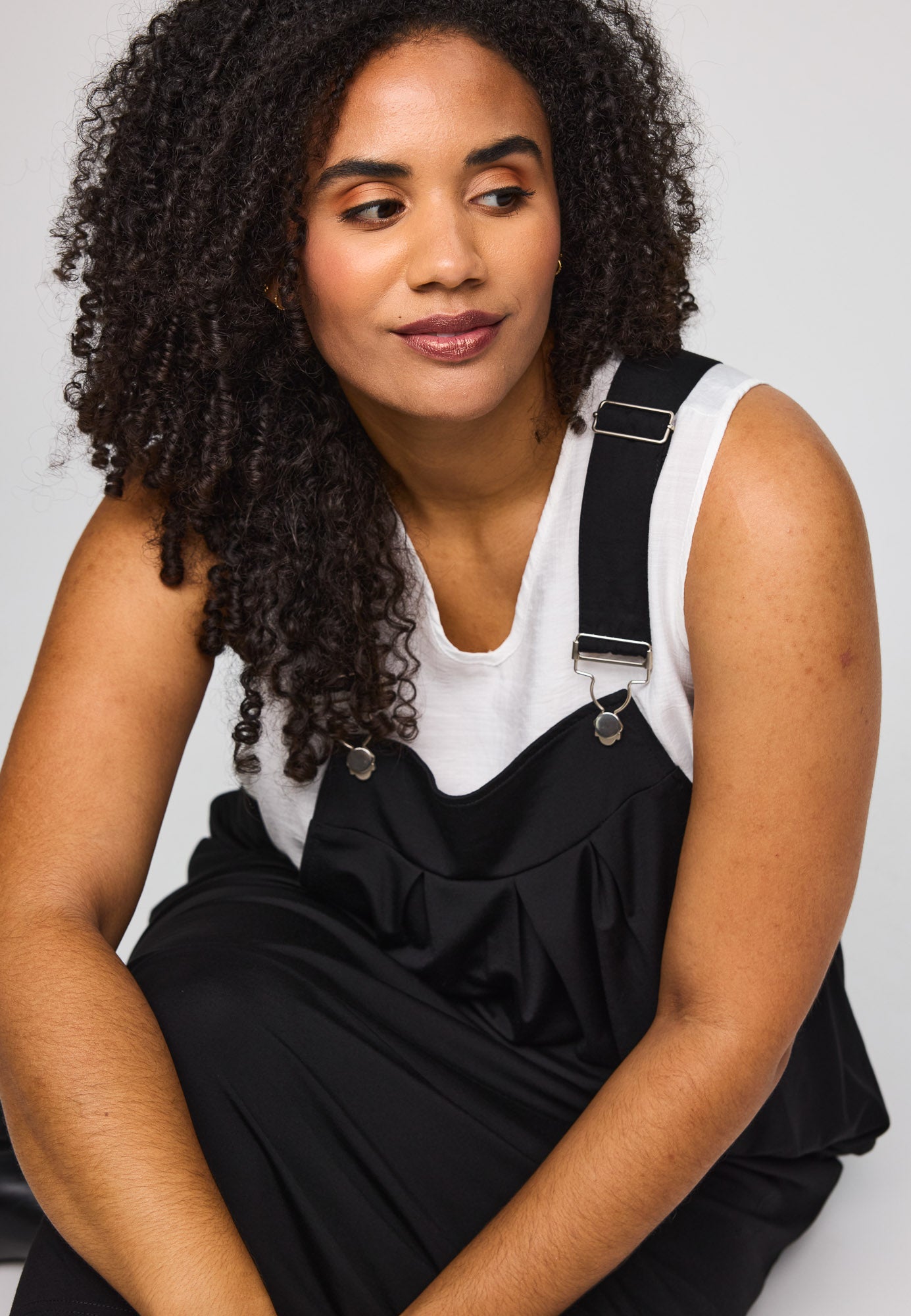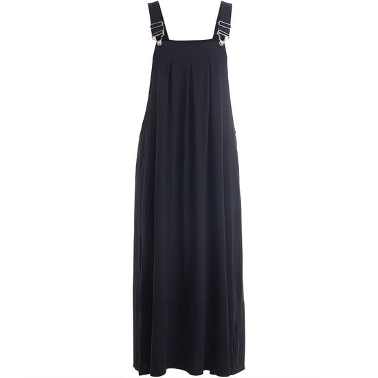 Denne sorte spencer fra Studio byder på et enkelt og afslappet udtryk med sine klassiske detaljer, der passer perfekt ind i den moderne garderobe. De brede stropper med sølvfarvede spænder giver associationer til det populære smækbukse-look, men her i en feminin kjoleudgave, der er ideel at bruge over en t-shirt eller bluse.