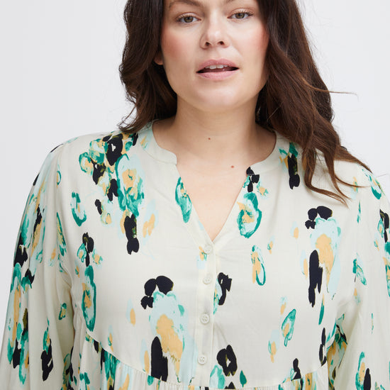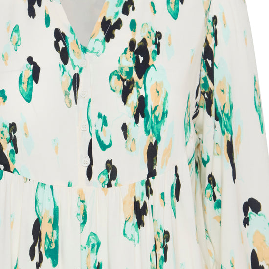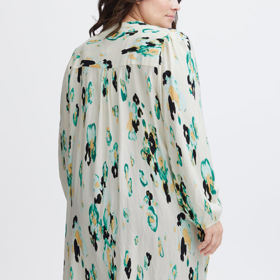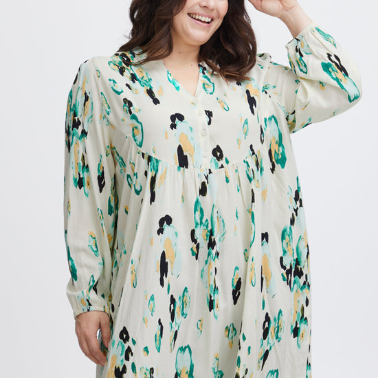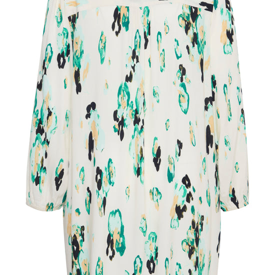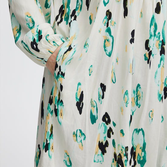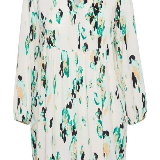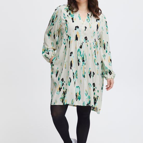 Denne kjole er fremstillet i 100% viskose (LENZING™ ECOVERO™), hvilket sikrer en blød og behagelig oplevelse hele dagen. Med sit abstrakte pletmønstret print og farvespil af grønne, sorte og blå nuancer på en lys baggrund, er kjolen et iøjnefaldende stykke tøj, der nemt kan styles op eller ned. Kombiner den med sorte strømpebukser og hvide sneakers for et afslappet look, eller tilføj hæle og accessories for en aften ude.