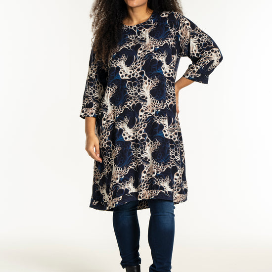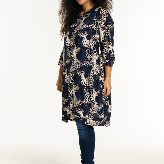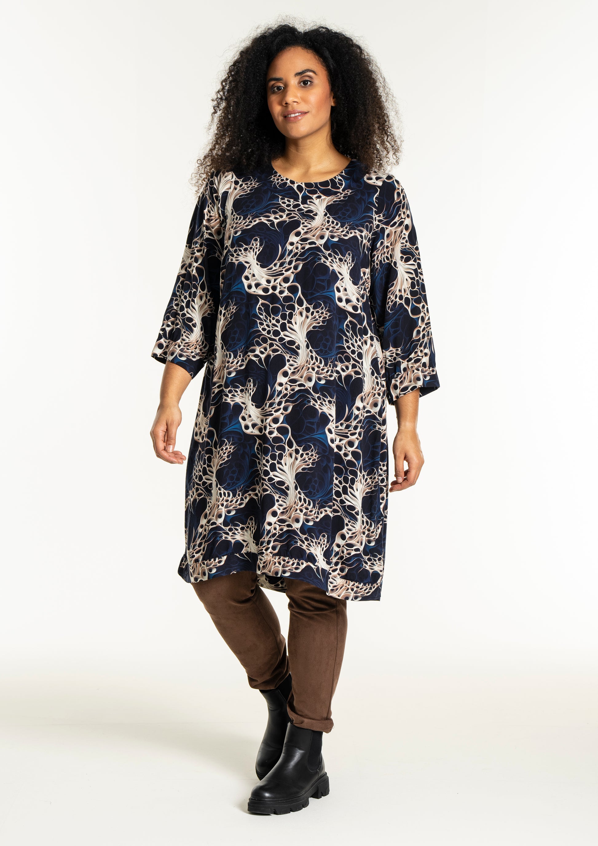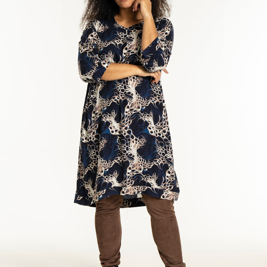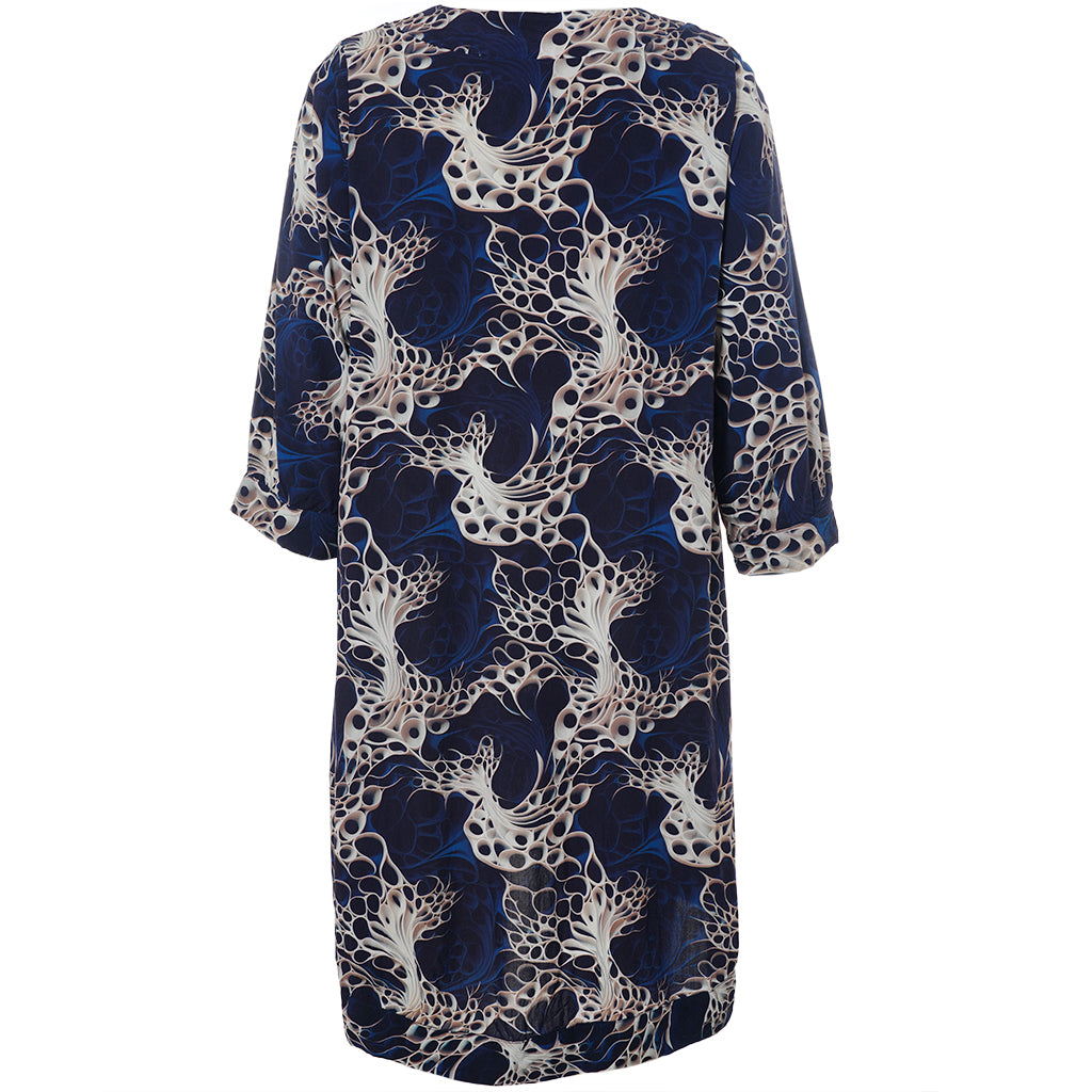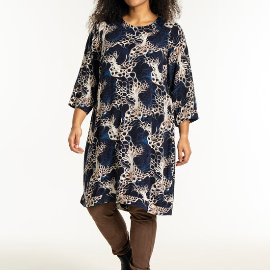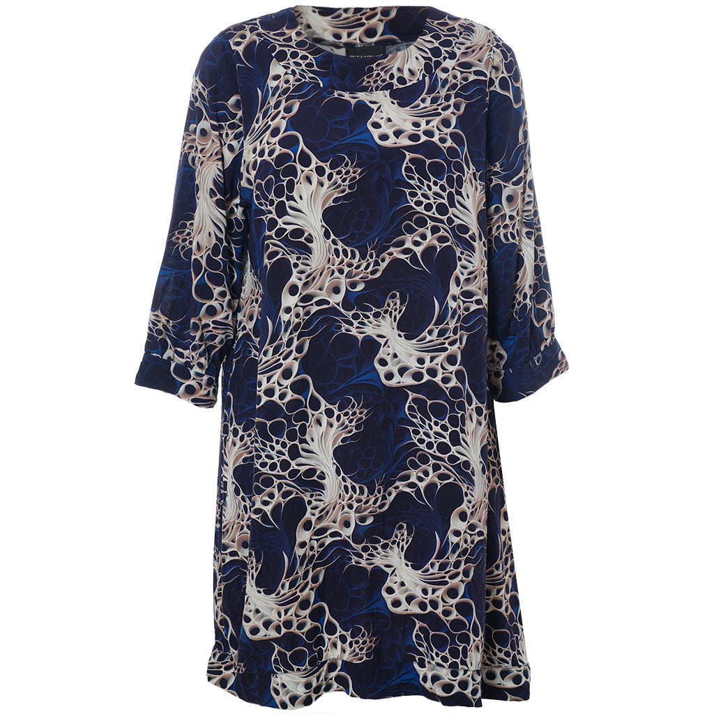 Oplev en smuk kjole fra Studio, lavet af 100% viskose, der sikrer både komfort og stil. Denne kjole er udsmykket med et levende, kunstnerisk print i nuancer af mørkeblå, beige og hvid, som skaber et dynamisk og moderne udtryk. Designet inkluderer en rund halsudskæring og trekvartlange ærmer med let rynkning og manchet, der tilføjer et feminint og afslappet look.
