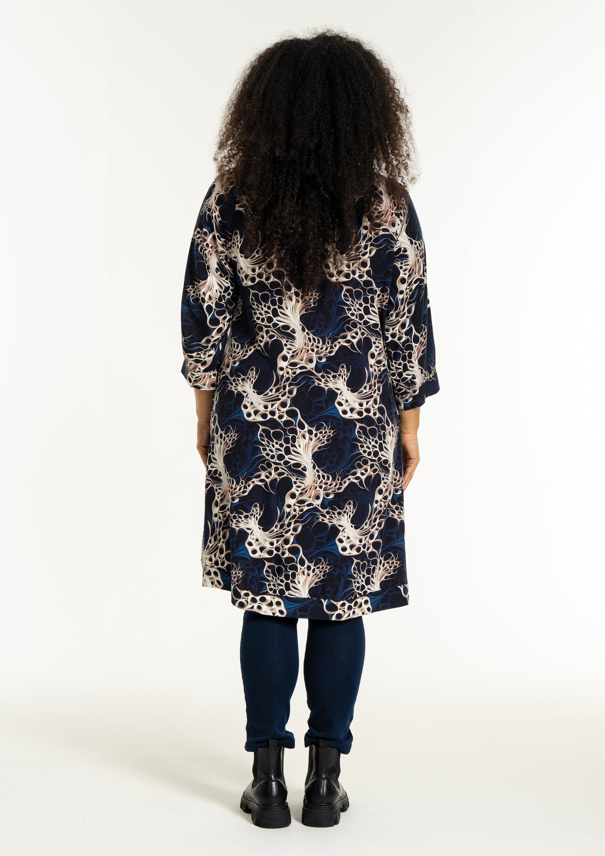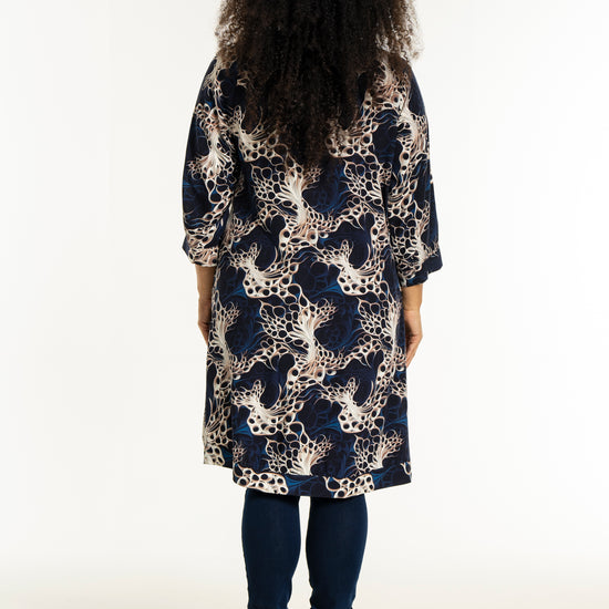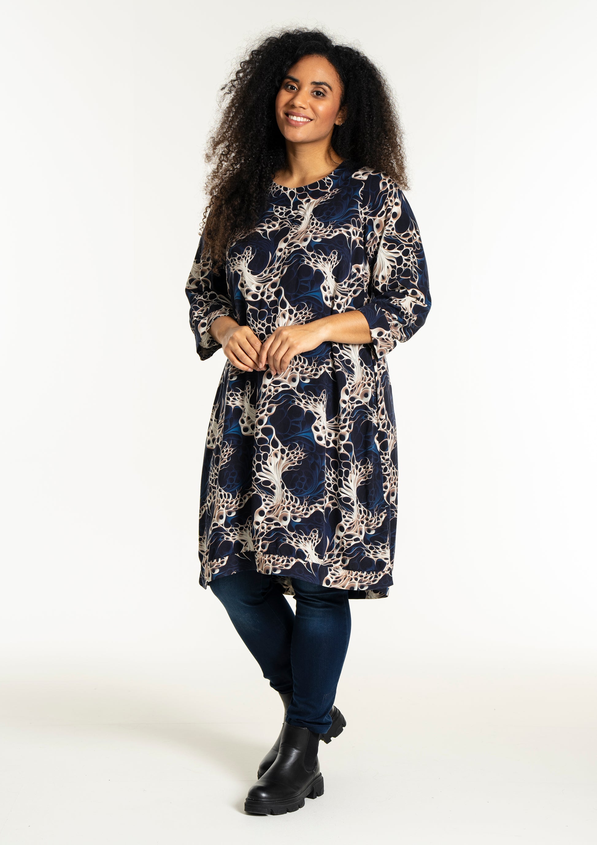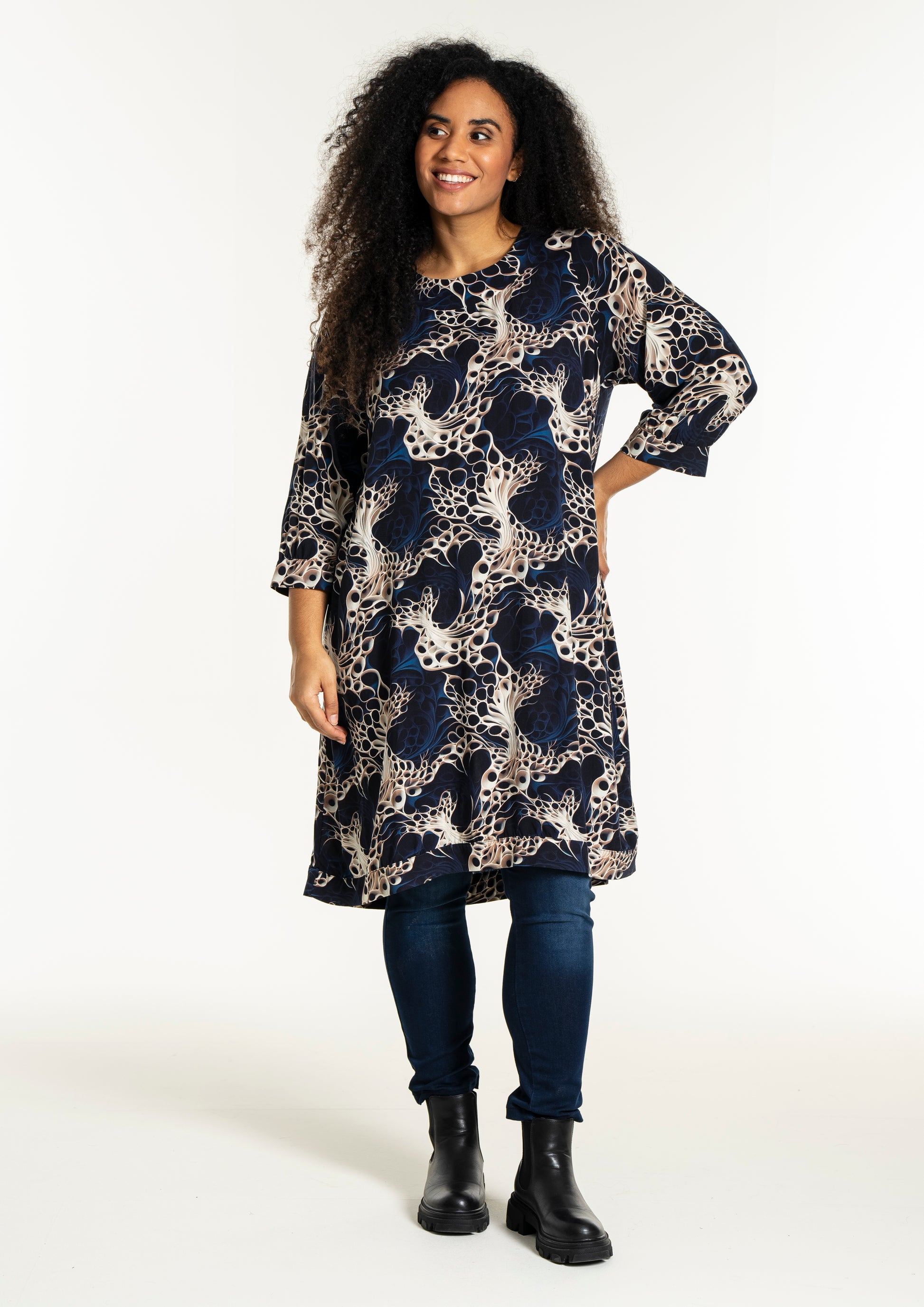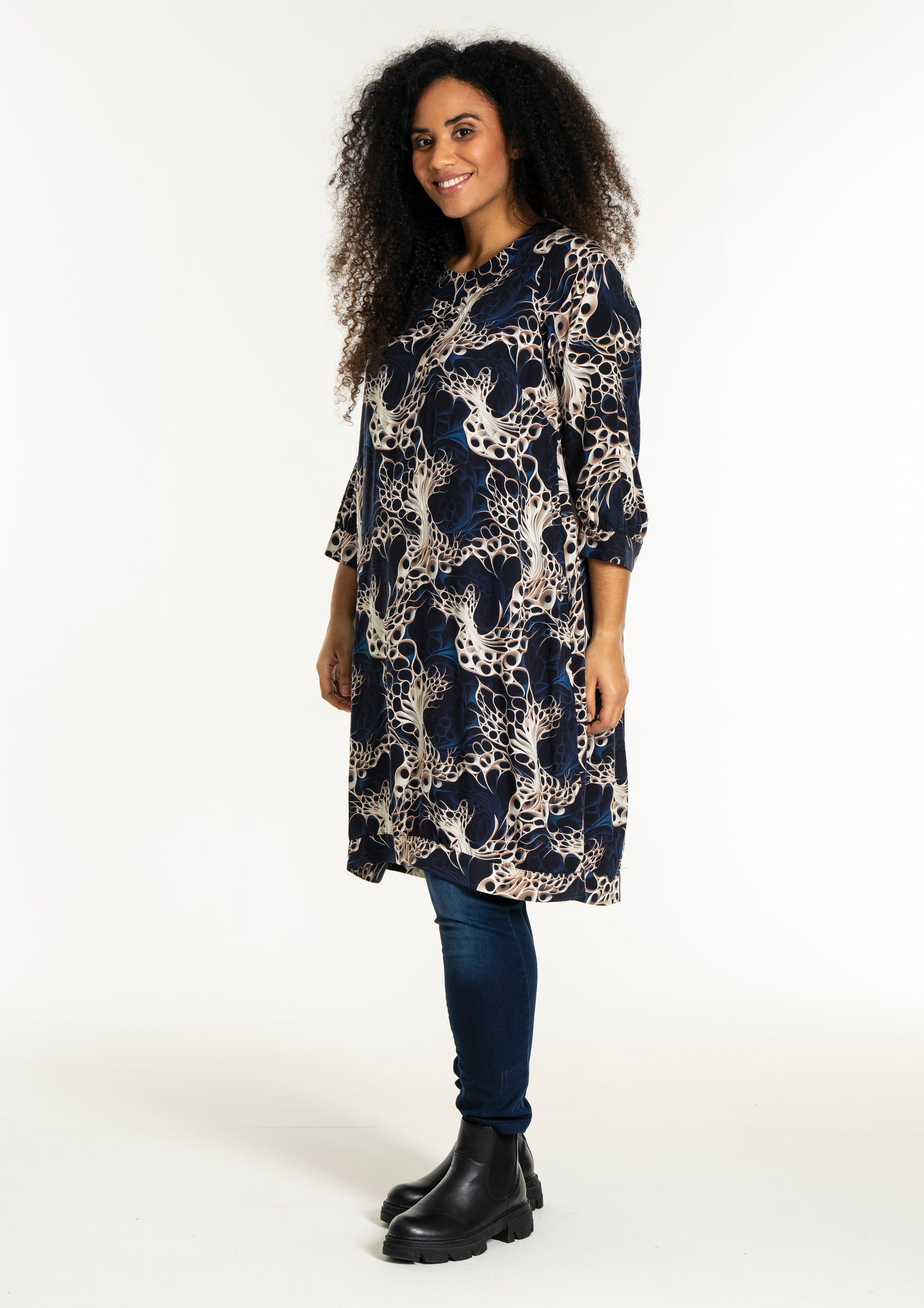 Oplev en smuk kjole fra Studio, lavet af 100% viskose, der sikrer både komfort og stil. Denne kjole er udsmykket med et levende, kunstnerisk print i nuancer af mørkeblå, beige og hvid, som skaber et dynamisk og moderne udtryk. Designet inkluderer en rund halsudskæring og trekvartlange ærmer med let rynkning og manchet, der tilføjer et feminint og afslappet look.