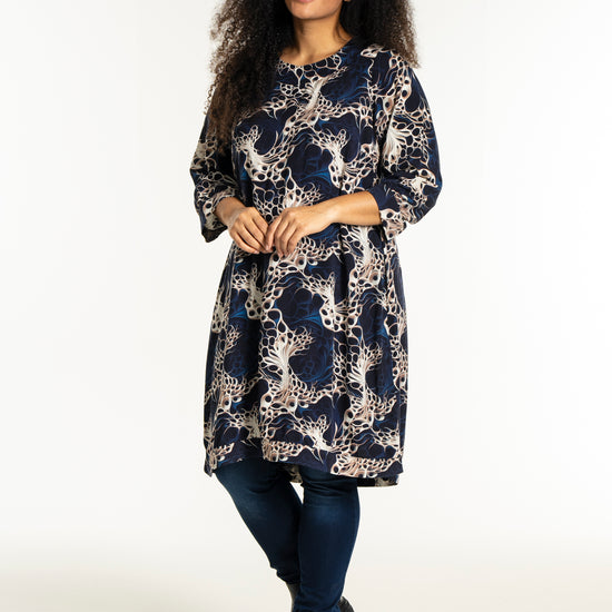 - Farver: Navy med sand print