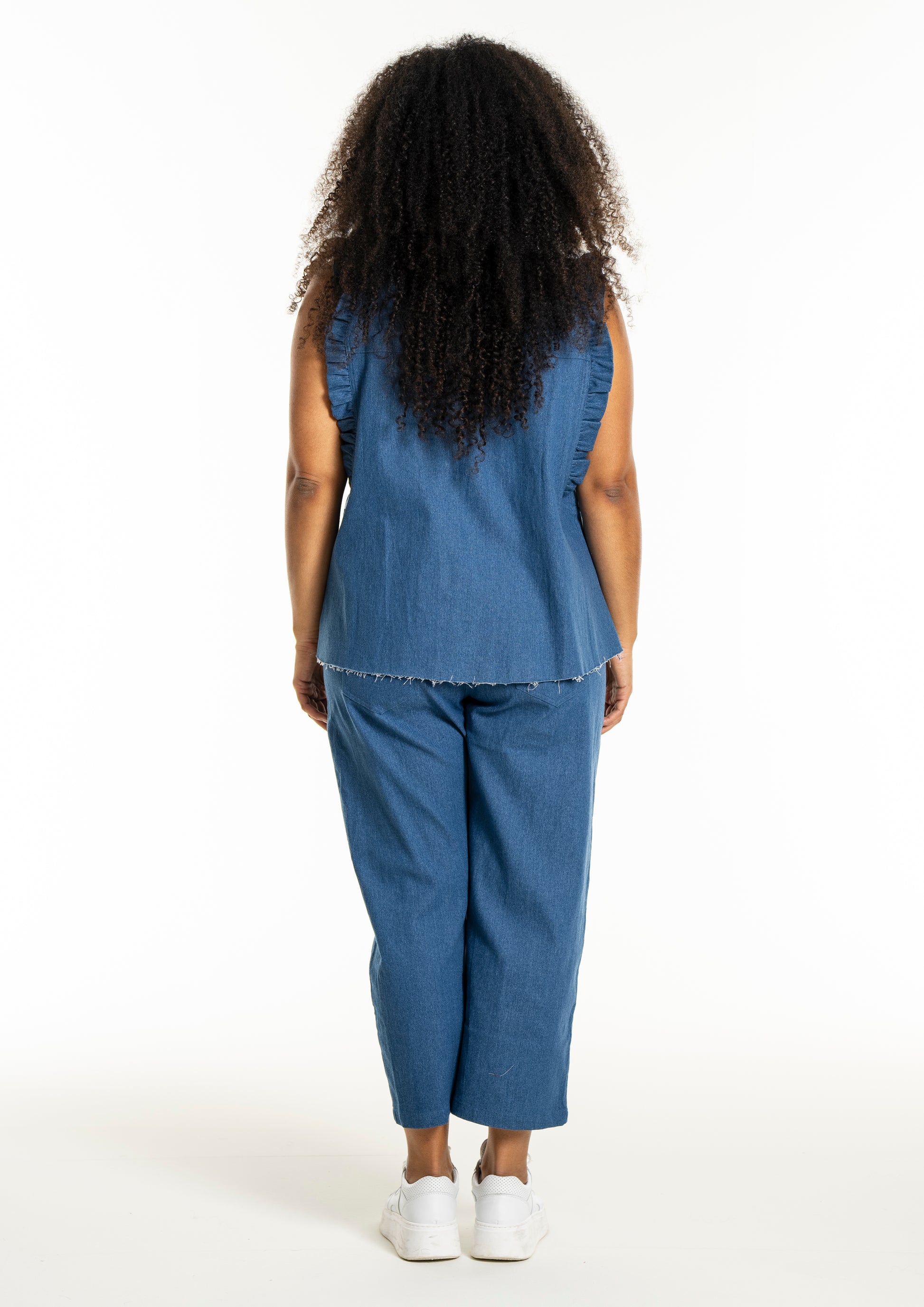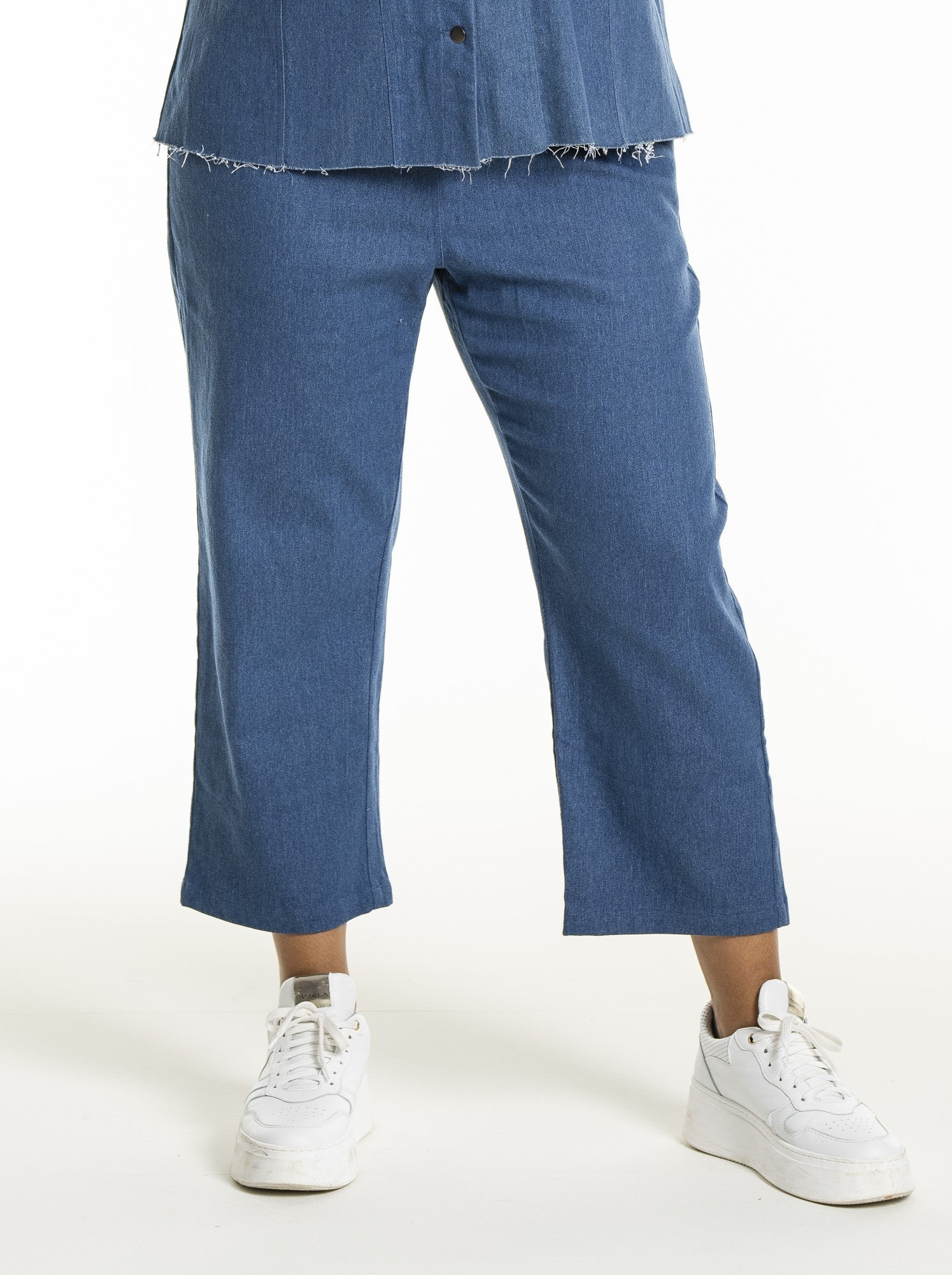 Modellen har en indvendig benlængde på 64 cm i str. S, hvilket giver et let stumpet look, der fremhæver dine sko og giver luft omkring anklerne. Det kortere snit gør dem til et godt alternativ til klassiske plus size jeans, når vejret bliver lunere, eller hvis du blot ønsker et lettere udtryk. De lige ben og det afslappede snit fungerer godt sammen med både sneakers og sandaler for et cool outfit fra Studio.