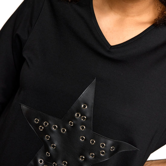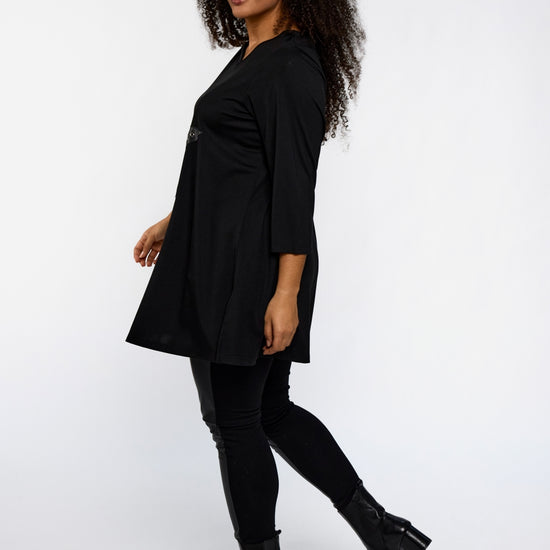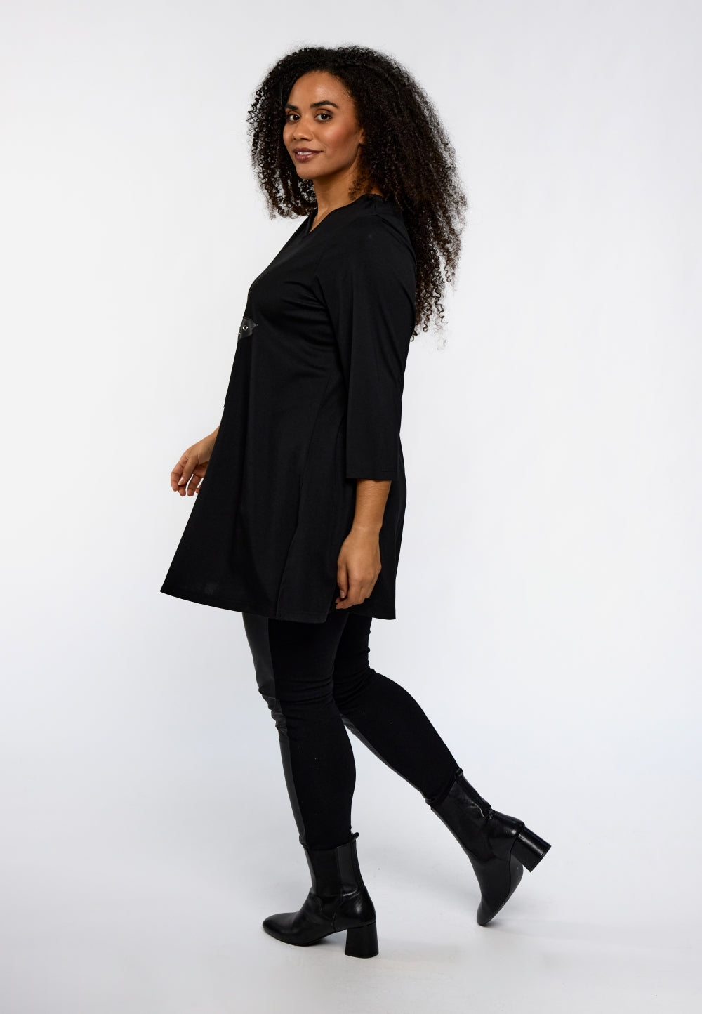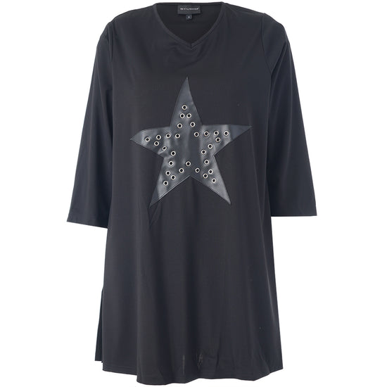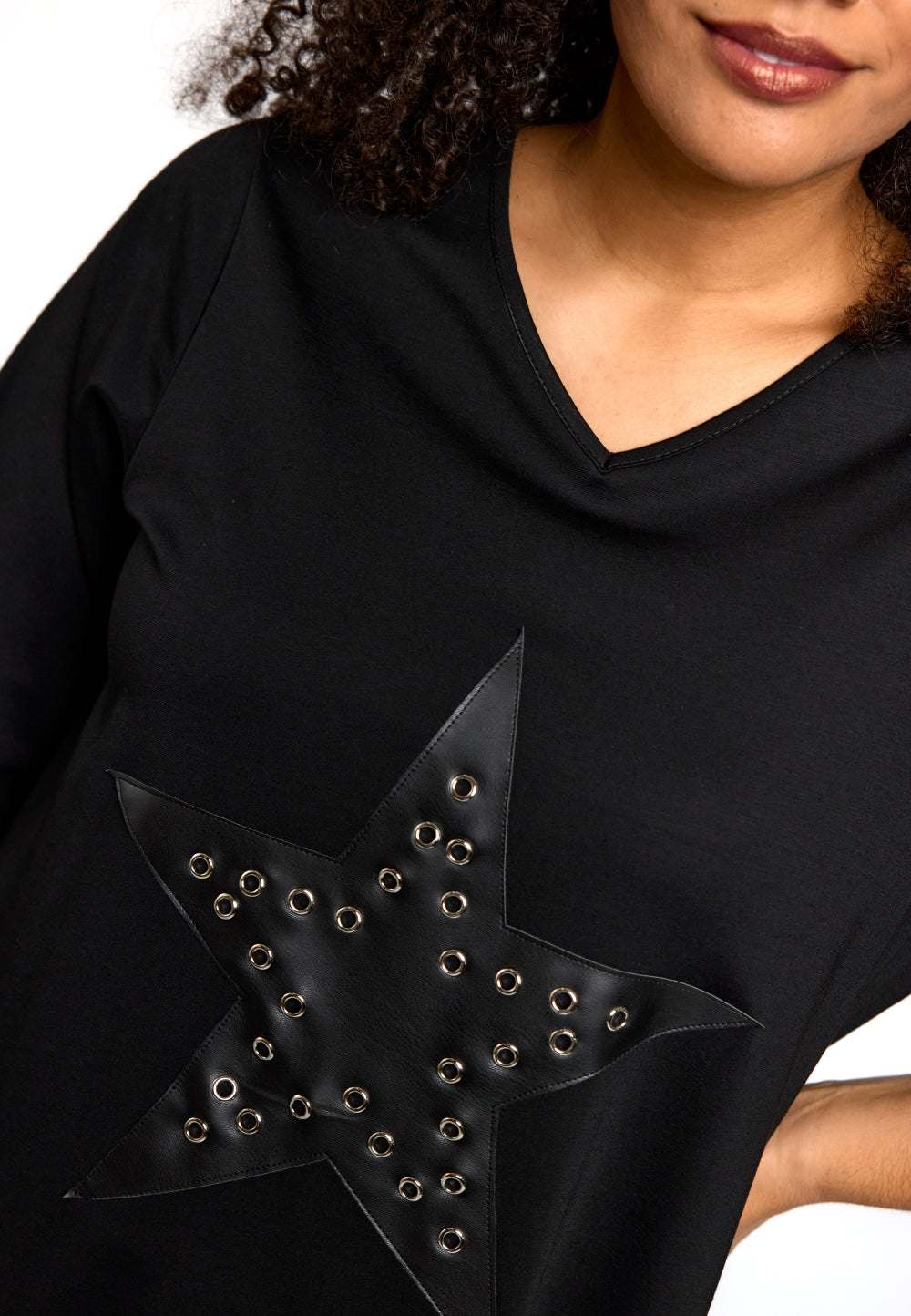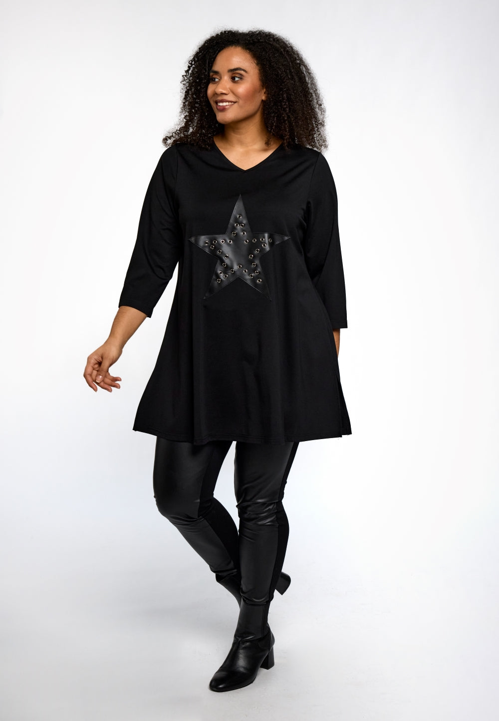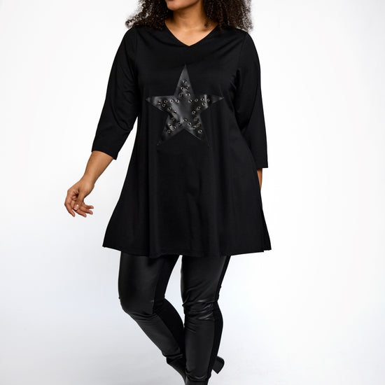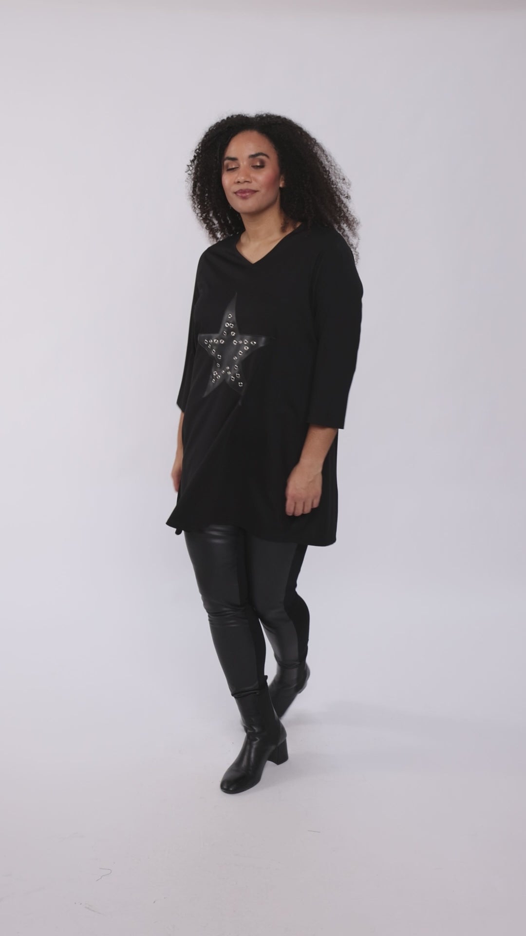 Med sit rummelige fit og en længde på 88,5 cm i str. S får du god dækning og et flatterende fald, der klæder de fleste kropsformer. Den karakteristiske stjerneapplikation giver tunikaen et moderne og iøjnefaldende udtryk, der let kan styles til både hverdag og afslappede sammenkomster. Se flere smarte tunikaer eller kombiner med vores udvalg af toppe for et komplet look.